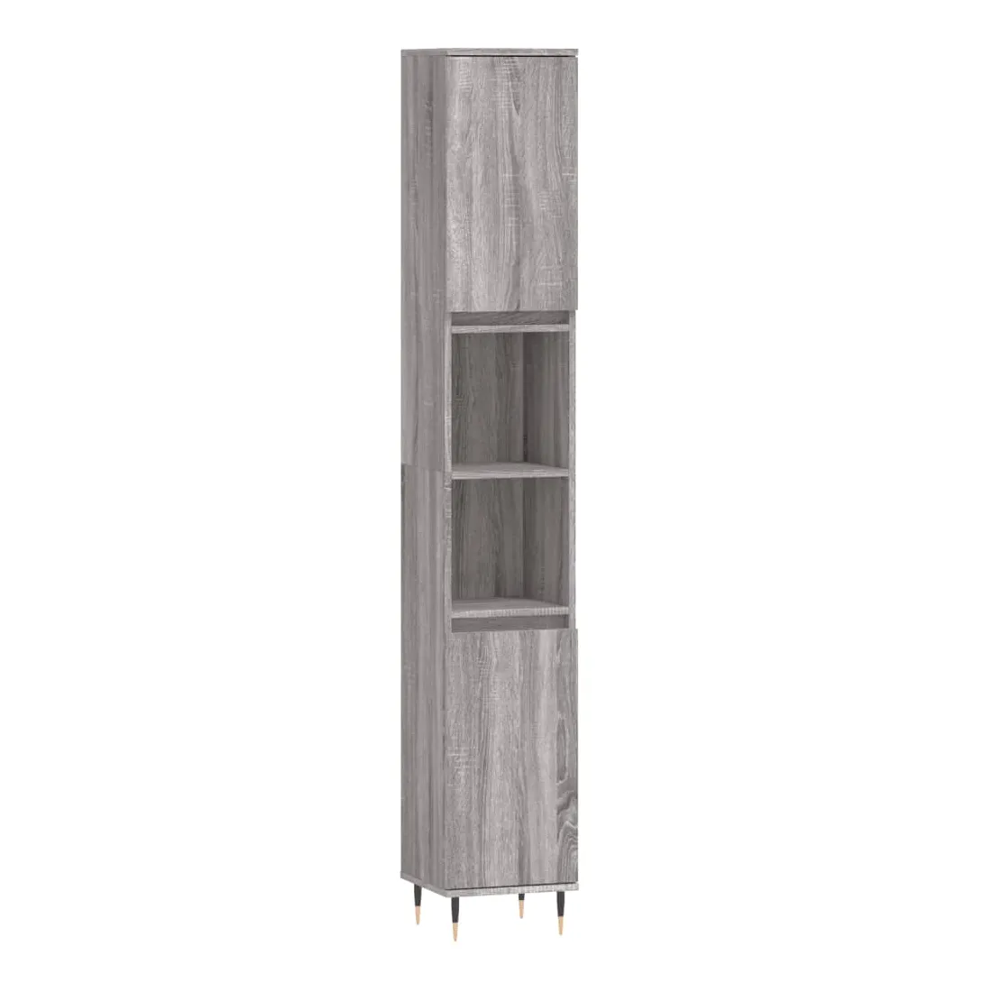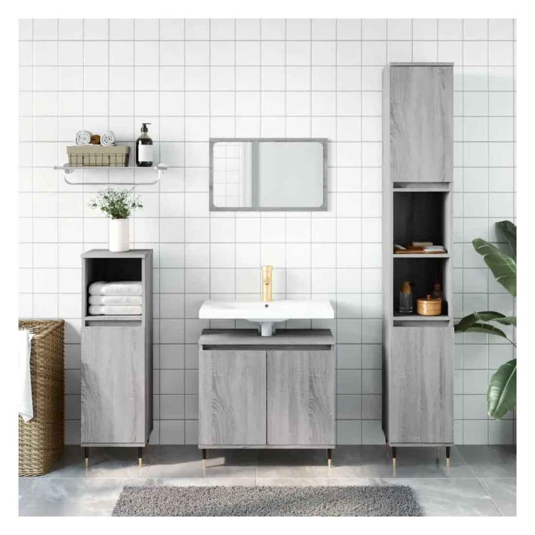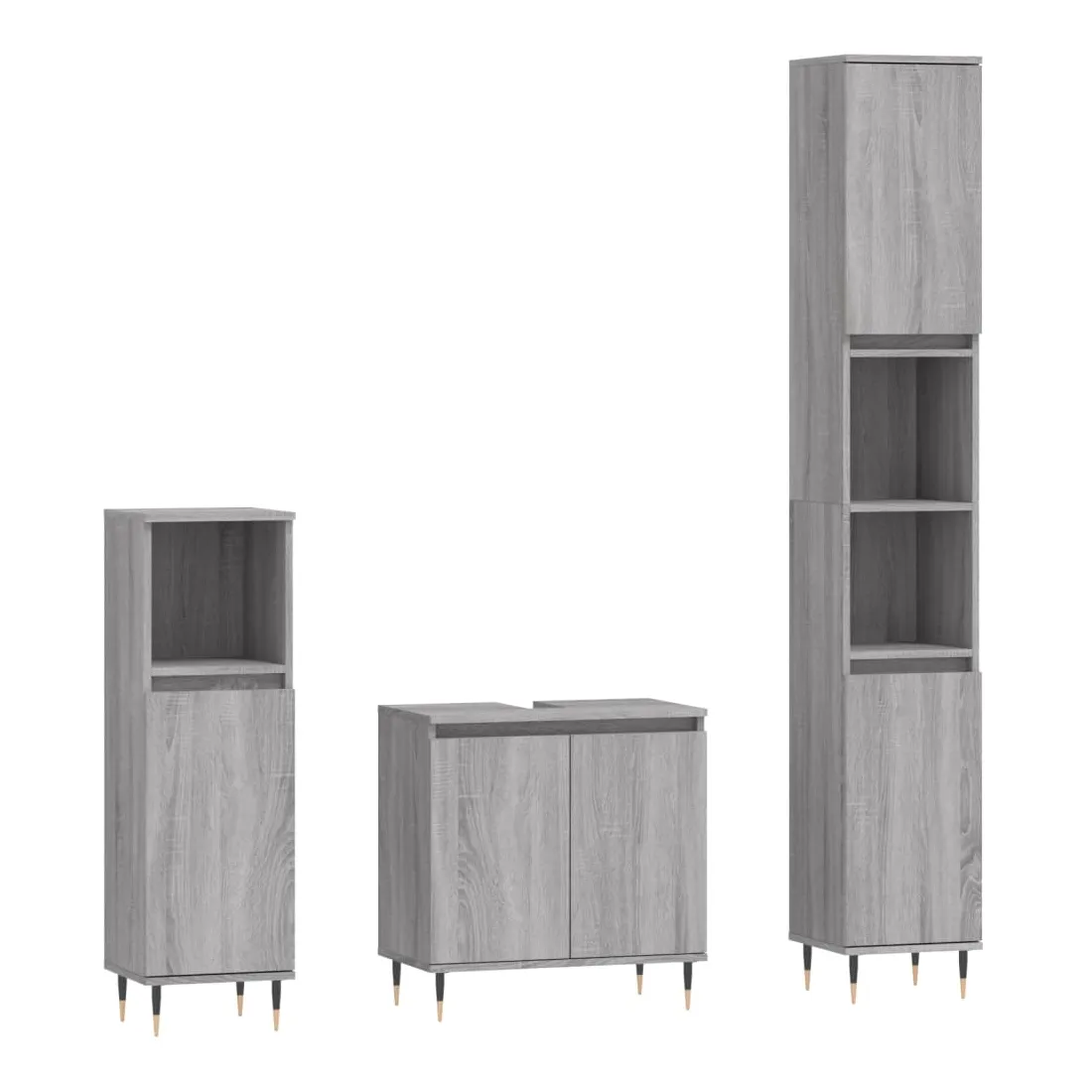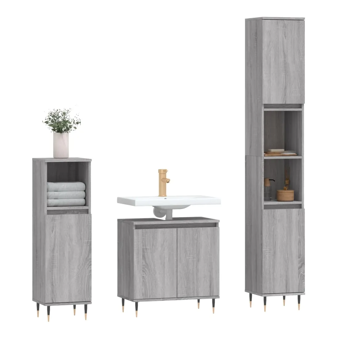 Cet ensemble d'armoires de salle de bain attrayant, avec un grand espace de rangement, présente un design élégant mais pratique. Matériau durable : le bois d'ingénierie est d'une qualité exceptionnelle avec une surface lisse et présente également résistance, stabilité et résistance à l'humidité. Grand espace de rangement : l'espace de rangement facilite l'organisation des articles dans ces meubles de salle de bain. Pieds en métal : les pieds en métal ajoutent un style moderne et calme à votre intérieur tout en assurant la stabilité.Surface facile à nettoyer : l'ensemble de salle de bain est facile à nettoyer avec un chiffon humide. Attention :Pour éviter qu'il ne soit renversé, ce produit doit être utilisé avec le dispositif de fixation au mur fourni. Bon à savoir :Les vis et les chevilles pour l'intérieur du mur ne sont pas incluses. Nous vous conseillons de trouver et d'utiliser des vis et des chevilles adaptées spécifiquement à vos murs. Si vous n'êtes pas sûr, vous pouvez consulter un professionnel. Veuillez lire et suivre chaque étape des instructions.Le lavabo n'est pas inclus dans la livraison.