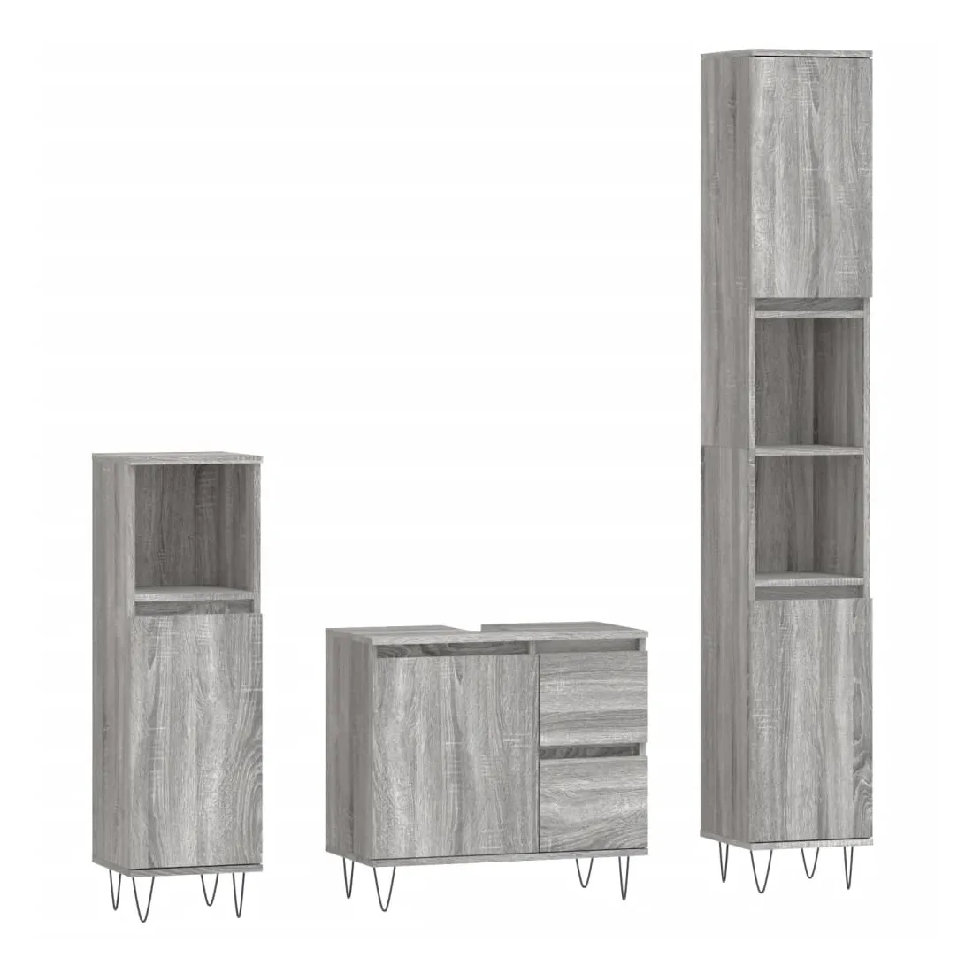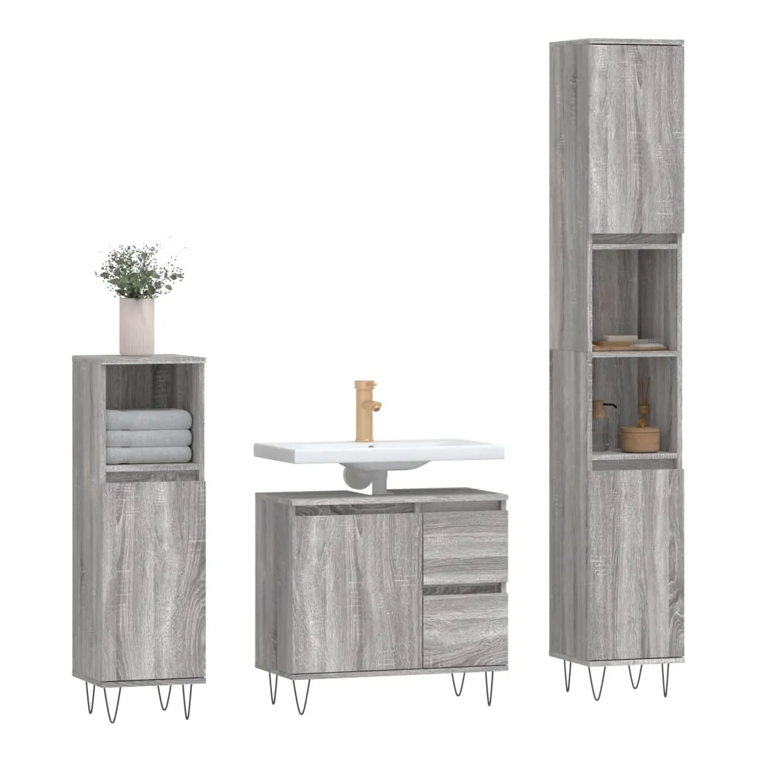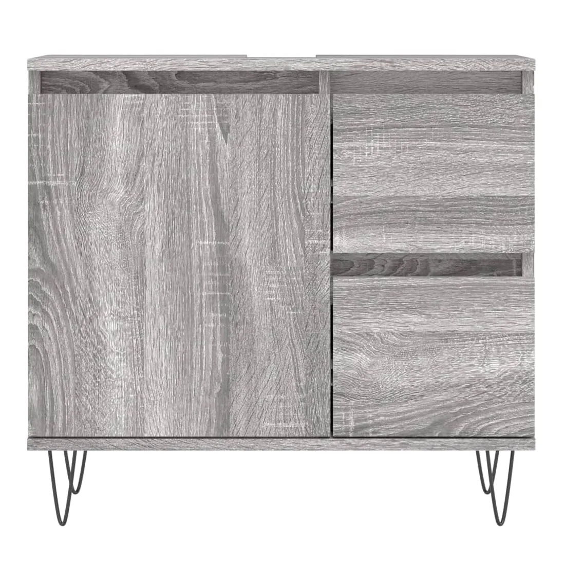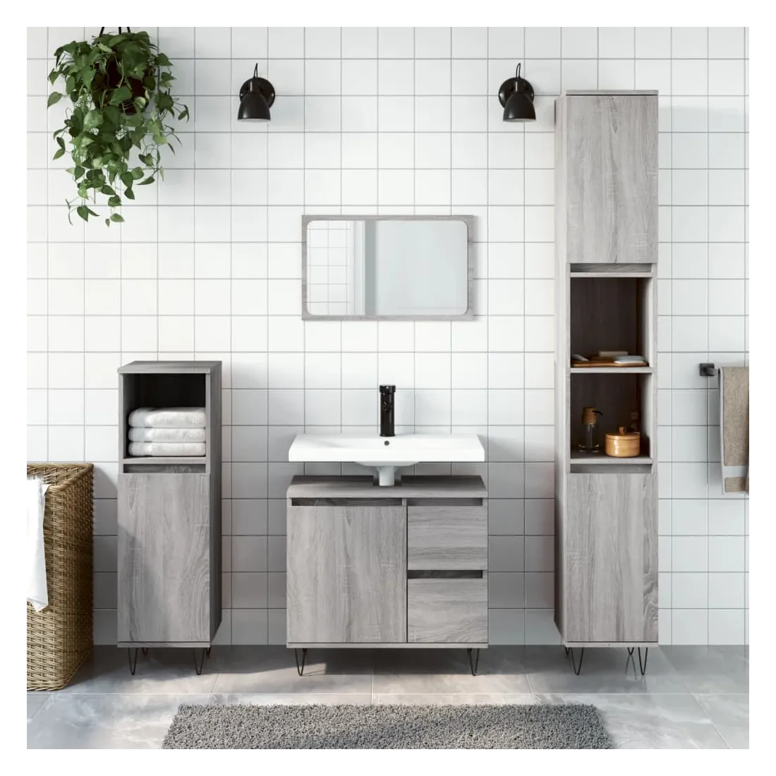 Cet ensemble de meubles de salle de bain tendance est un excellent supplément à votre salle de bain, ce qui lui donne une apparence ordonnée et saisissante ! Matériau durable : le bois d'ingénierie est d'une qualité exceptionnelle avec une surface lisse et présente également résistance, stabilité et résistance à l'humidité. Pieds en fer : les pieds en fer ajoutent un style moderne et calme à votre intérieur tout en assurant la stabilité.Grand espace de rangement : l'armoire de salle de bain offre diverses options de rangement et un espace spacieux pour ranger des articles dans votre salle de bain. Design pratique : le dessus du meuble-lavabo de salle de bain est idéal pour placer le lavabo. Attention :Pour éviter qu'il ne soit renversé, ce produit doit être utilisé avec le dispositif de fixation au mur fourni. Bon à savoir :Le lavabo n'est pas inclus dans la livraison.Les vis et les chevilles pour l'intérieur du mur ne sont pas incluses. Nous vous conseillons de trouver et d'utiliser des vis et des chevilles adaptées spécifiquement à vos murs. Si vous n'êtes pas sûr, vous pouvez consulter un professionnel. Veuillez lire et suivre chaque étape des instructions.