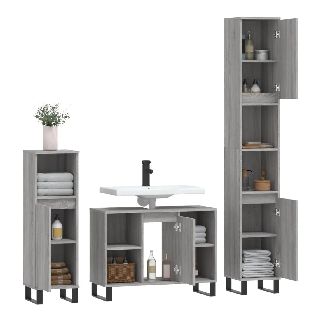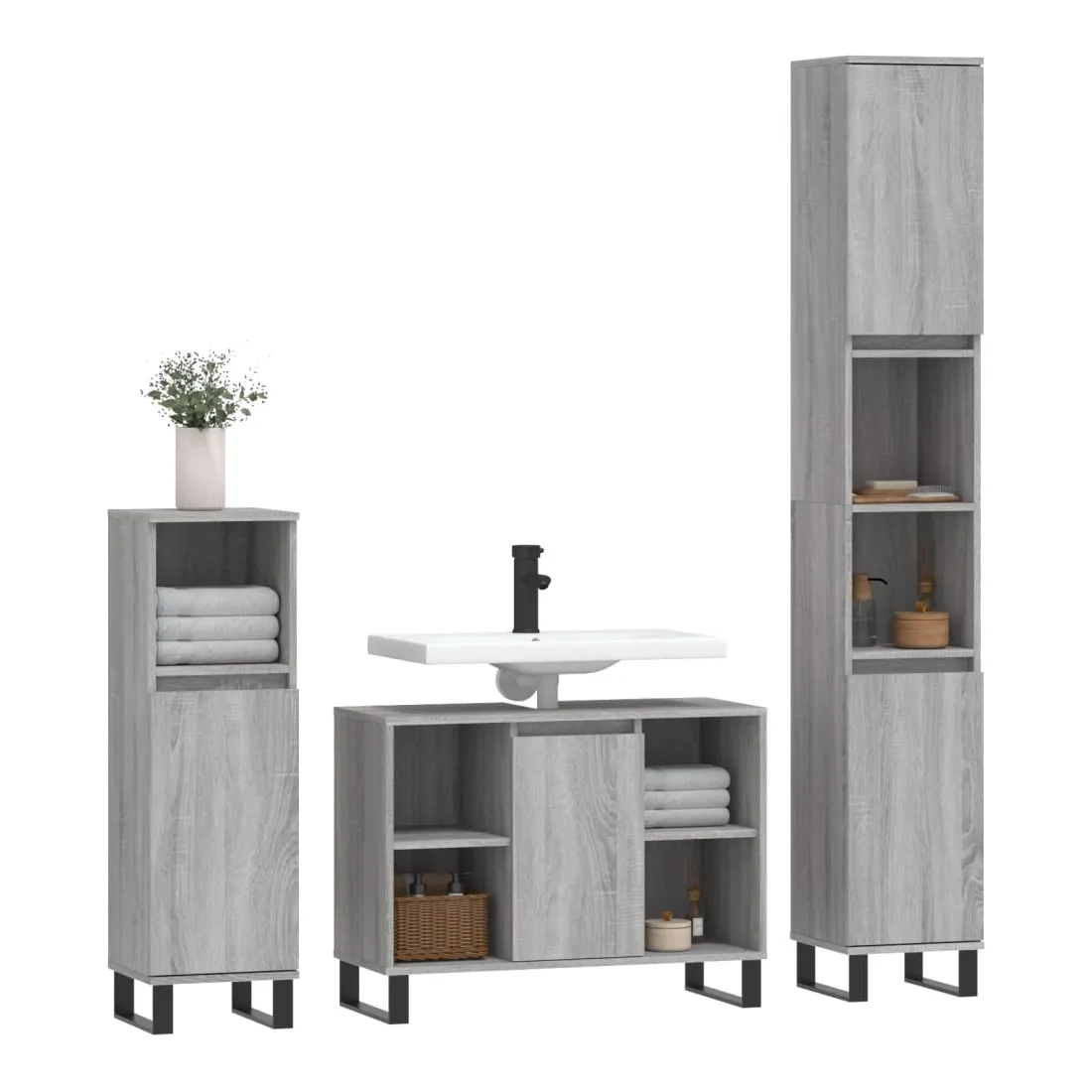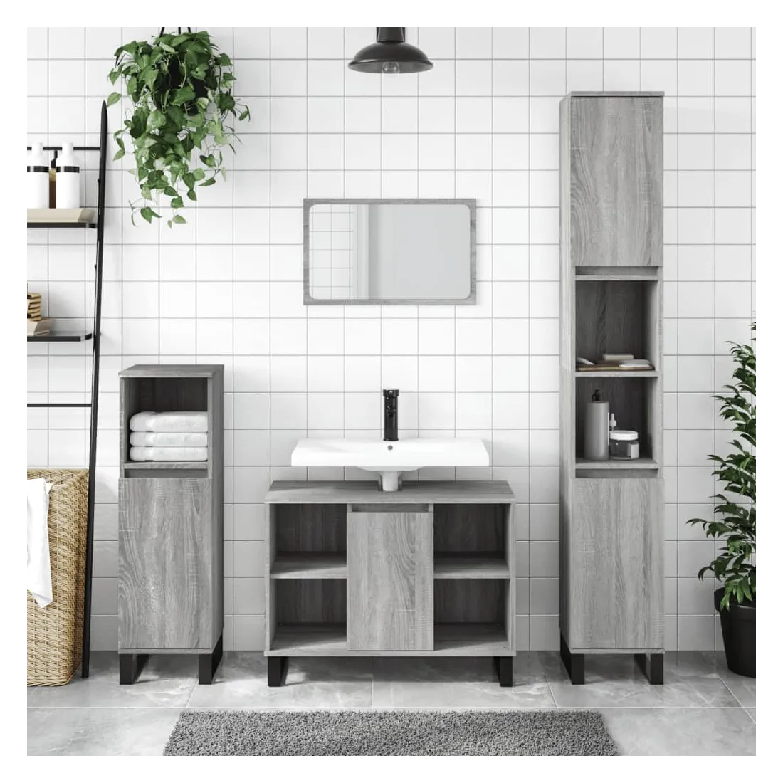 Cet ensemble de meubles de salle de bain tendance est un excellent supplément à votre salle de bain, ce qui lui donne une apparence ordonnée et saisissante ! Matériau durable : le bois d'ingénierie est d'une qualité exceptionnelle avec une surface lisse et présente également résistance, stabilité et résistance à l'humidité. Pieds en fer : les pieds en fer ajoutent un style moderne et calme à votre intérieur tout en assurant la stabilité.Grand espace de rangement : l'armoire de salle de bain offre diverses options de rangement et un espace spacieux pour ranger des articles dans votre salle de bain. Design pratique : le dessus du meuble-lavabo de salle de bain est idéal pour placer le lavabo. Attention :Pour éviter qu'il ne soit renversé, ce produit doit être utilisé avec le dispositif de fixation au mur fourni. Bon à savoir :Le lavabo n'est pas inclus dans la livraison.Les vis et les chevilles pour l'intérieur du mur ne sont pas incluses. Nous vous conseillons de trouver et d'utiliser des vis et des chevilles adaptées spécifiquement à vos murs. Si vous n'êtes pas sûr, vous pouvez consulter un professionnel. Veuillez lire et suivre chaque étape des instructions.