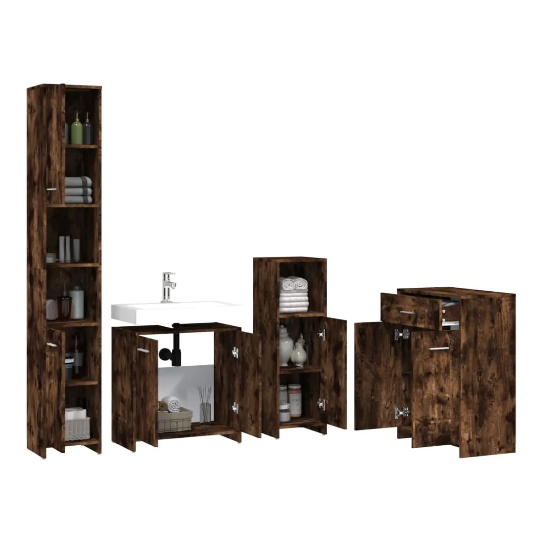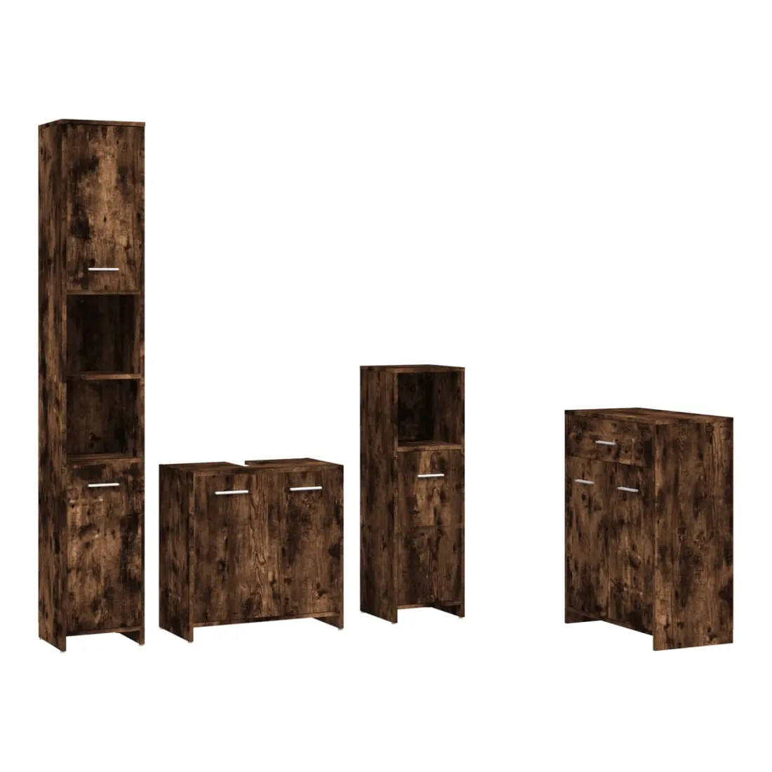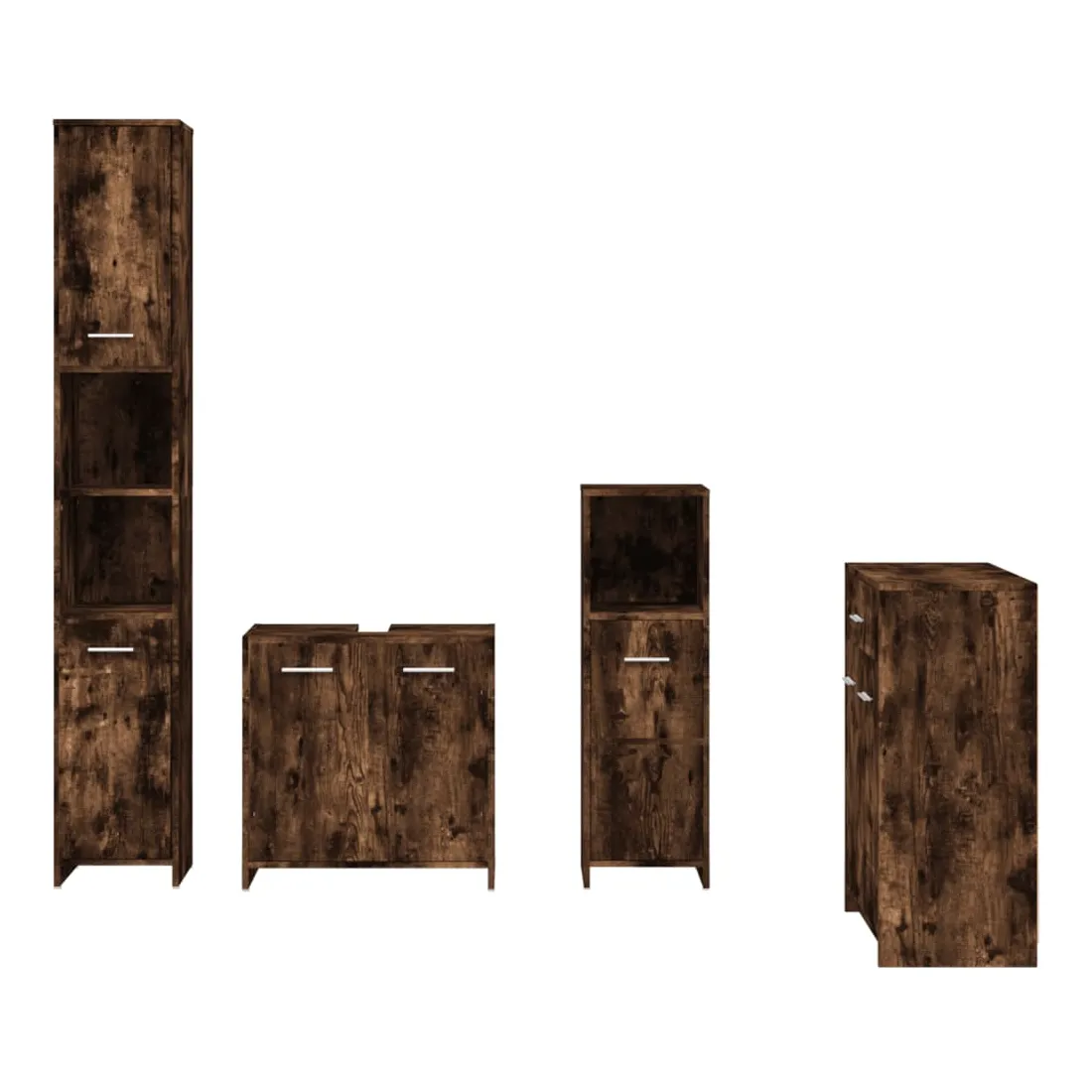 Cet ensemble de meubles de salle de bain de 4 pièces, doté d'un espace de rangement spacieux, est un supplément chic et intemporel à toute salle de bain ou toilettes. Matériau durable : le bois d'ingénierie est d'une qualité exceptionnelle avec une surface lisse et présente également résistance, stabilité et résistance à l'humidité.Grand espace de rangement : ces armoires de salle de bains offrent diverses options de rangement et un espace supplémentaire pour ranger les objets dans votre salle de bains. Design élégant : les lignes épurées et le design élégant font que ce meuble de salle de bain s'intègre parfaitement dans votre salle de bain. Poignées pratiques : il y a une poignée sur chaque porte pour une meilleure ouverture et fermeture. Surface facile à nettoyer : l'unité d'évier de salle de bain est facile à nettoyer avec un chiffon humide. Attention :Afin d'éviter qu'il ne bascule, ce produit doit être utilisé avec le dispositif de fixation murale fourni. Remarque :Chaque produit est livré avec un manuel de montage dans la boîte pour un montage facile.Les vis et les chevilles pour l'intérieur du mur ne sont pas incluses. Recherchez et utilisez des vis et des chevilles adaptées à vos murs. Si vous n'êtes pas sûr, demandez conseil à un professionnel. Lisez et suivez attentivement chaque étape des instructions.Le panneau latéral de l'armoire haute se compose de deux parties connectées.