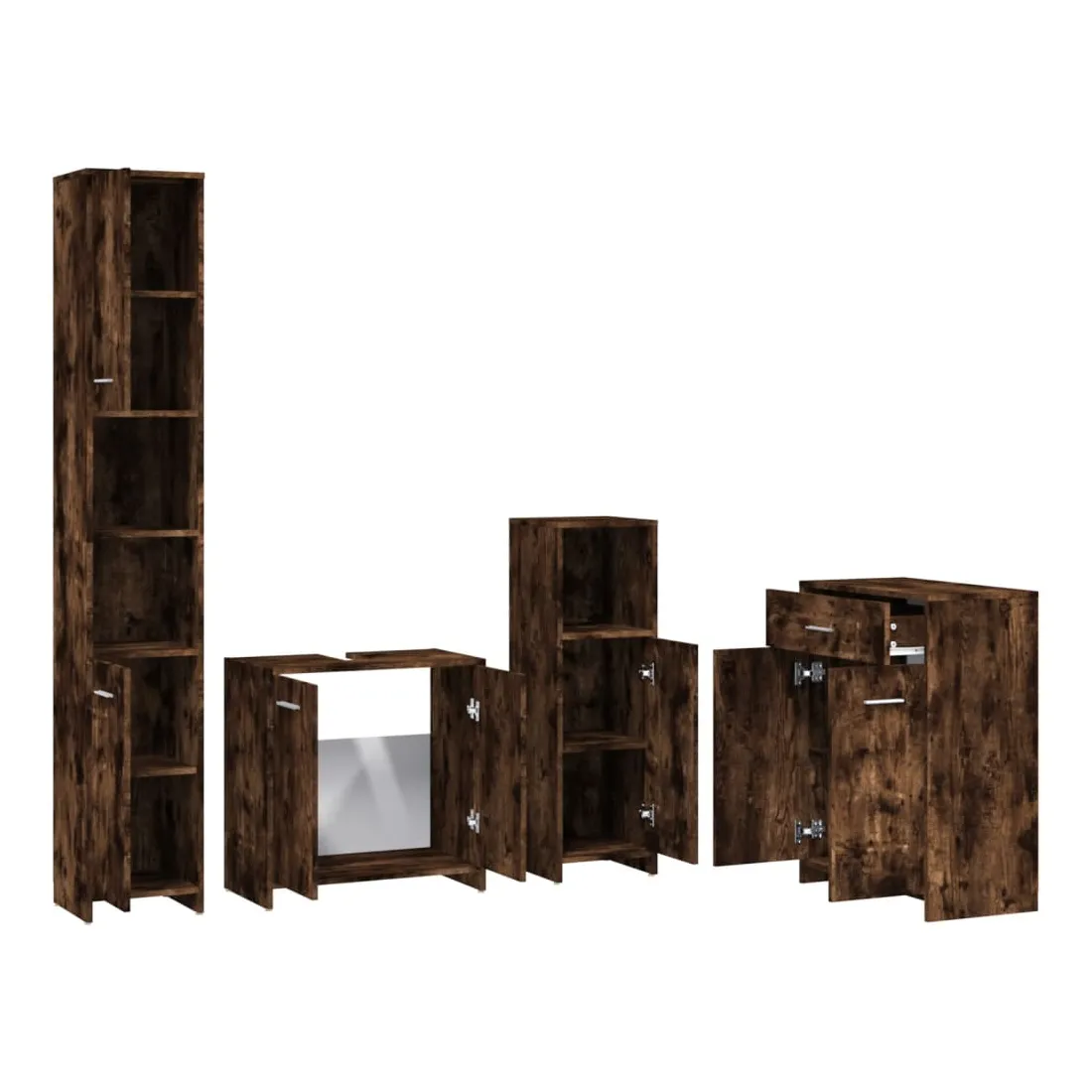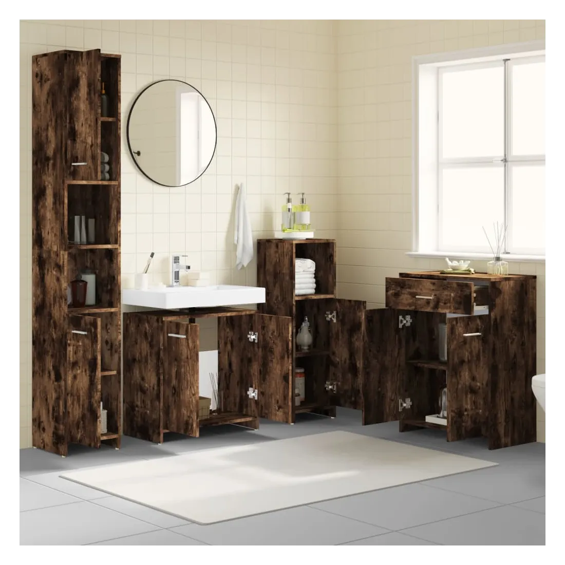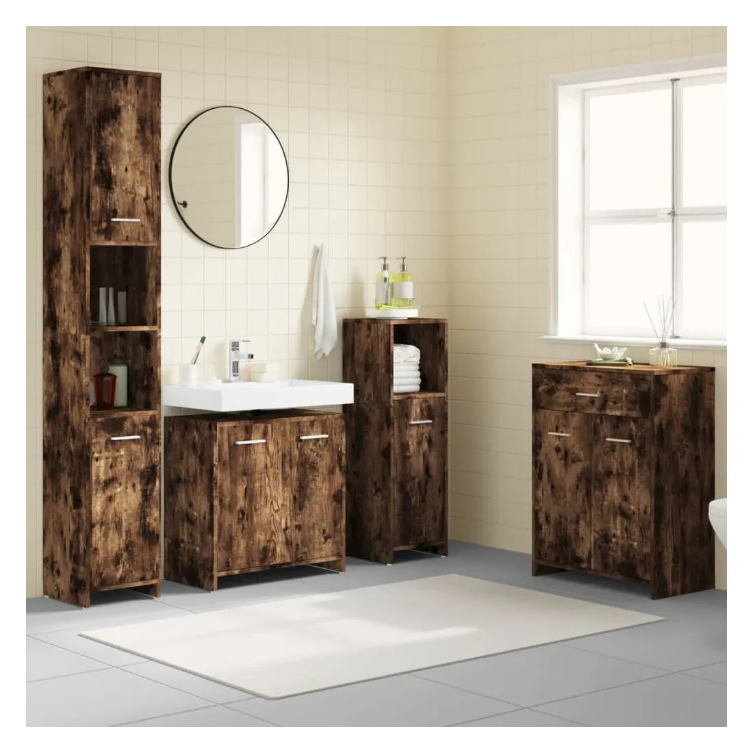 Cet ensemble de meubles de salle de bain de 4 pièces, doté d'un espace de rangement spacieux, est un supplément chic et intemporel à toute salle de bain ou toilettes. Matériau durable : le bois d'ingénierie est d'une qualité exceptionnelle avec une surface lisse et présente également résistance, stabilité et résistance à l'humidité.Grand espace de rangement : ces armoires de salle de bains offrent diverses options de rangement et un espace supplémentaire pour ranger les objets dans votre salle de bains. Design élégant : les lignes épurées et le design élégant font que ce meuble de salle de bain s'intègre parfaitement dans votre salle de bain. Poignées pratiques : il y a une poignée sur chaque porte pour une meilleure ouverture et fermeture. Surface facile à nettoyer : l'unité d'évier de salle de bain est facile à nettoyer avec un chiffon humide. Attention :Afin d'éviter qu'il ne bascule, ce produit doit être utilisé avec le dispositif de fixation murale fourni. Remarque :Chaque produit est livré avec un manuel de montage dans la boîte pour un montage facile.Les vis et les chevilles pour l'intérieur du mur ne sont pas incluses. Recherchez et utilisez des vis et des chevilles adaptées à vos murs. Si vous n'êtes pas sûr, demandez conseil à un professionnel. Lisez et suivez attentivement chaque étape des instructions.Le panneau latéral de l'armoire haute se compose de deux parties connectées.