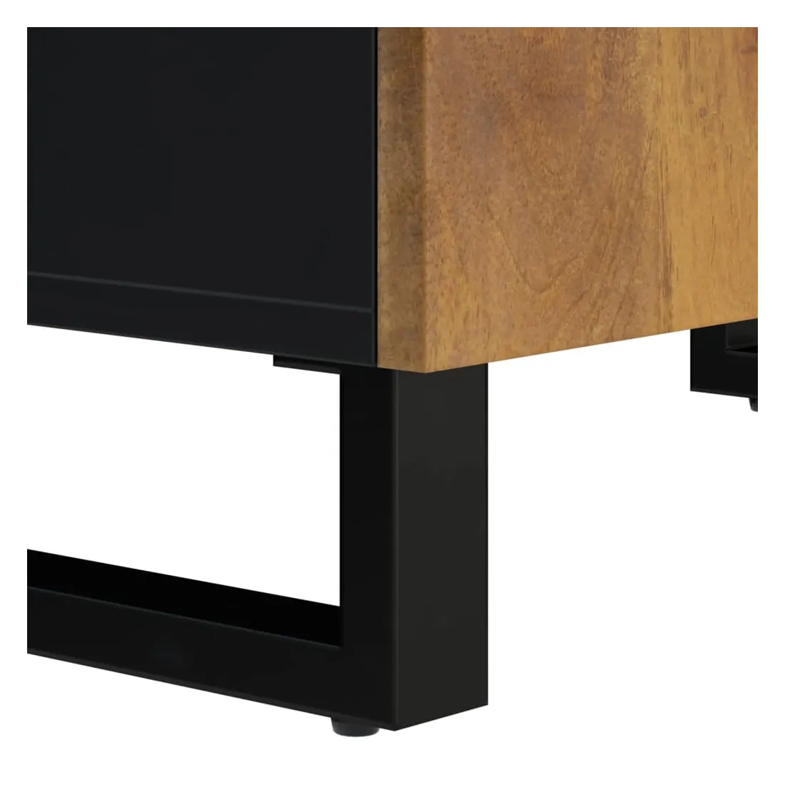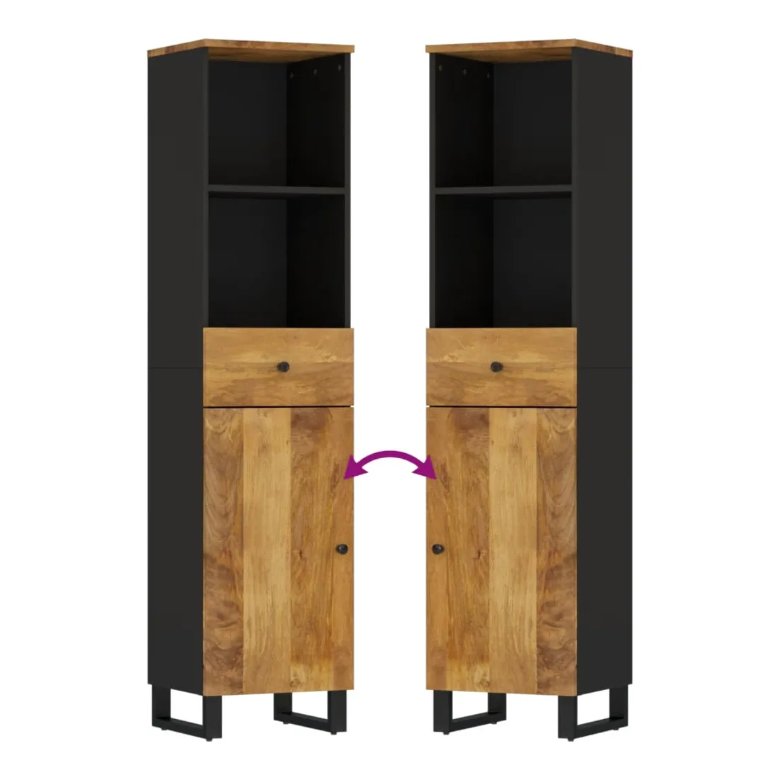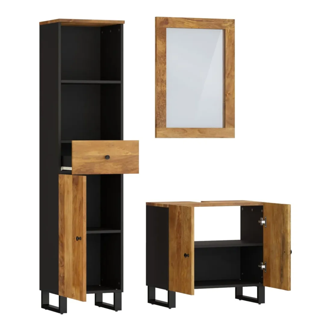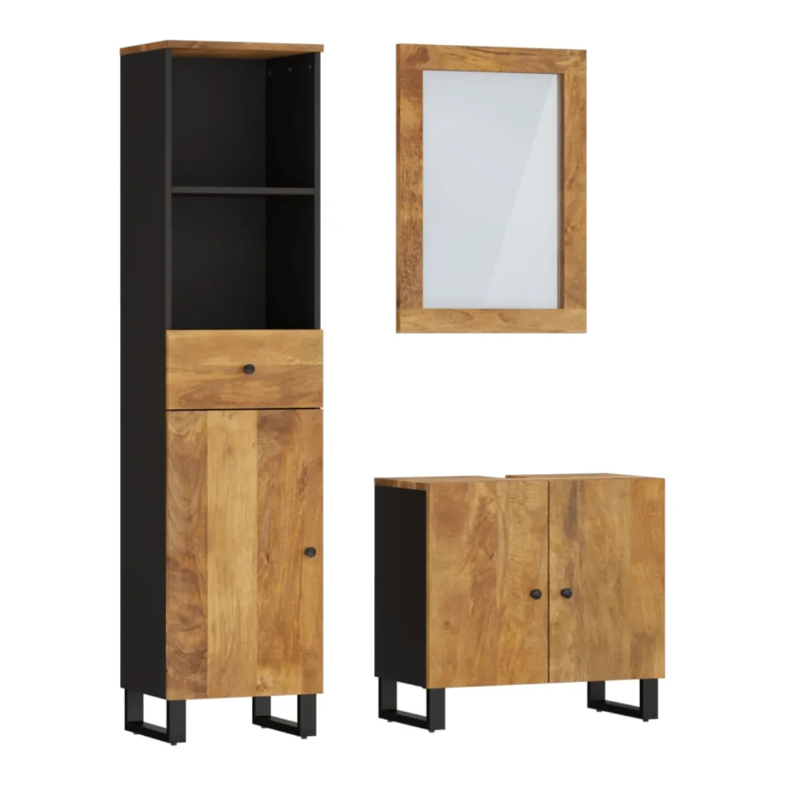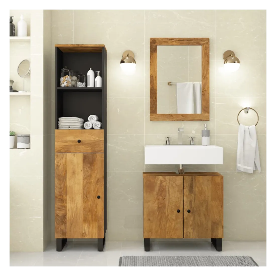 Cet ensemble de meubles de salle de bain pratique, avec un espace de rangement spacieux, est un excellent supplément à votre salle de bain, ce qui lui donne une apparence ordonnée et saisissante ! Bois de manguier massif : l'armoire est fabriquée en bois de manguier massif combinée au bois d'ingénierie. Le bois de manguier massif est un bois dur tropical solide qui fait des meubles robustes. Ses beaux grains de bois rendent chaque meuble légèrement différent l'un de l'autre.Grand espace de rangement : le meuble de rangement de salle de bain offre diverses options de rangement et un espace spacieux pour ranger des articles dans votre salle de bain.Pieds stables : les pieds en fer de l'armoire de salle de bain assurent sa robustesse et stabilité.Design pratique : le dessus du meuble-lavabo de salle de bain est idéal pour placer le lavabo.Image claire : la face du miroir en verre offre une image claire. Ainsi, vous pouvez profiter d'un reflet magnifique et naturel lorsque vous vous tenez devant. Attention :Pour éviter qu'il ne soit renversé, ce produit doit être utilisé avec le dispositif de fixation au mur fourni.Bon à savoir :Le lavabo n'est pas inclus dans la livraison.Les vis et les chevilles pour l'intérieur du mur ne sont pas incluses. Nous vous conseillons de trouver et d'utiliser des vis et des chevilles adaptées spécifiquement à vos murs. Si vous n'êtes pas sûr, vous pouvez consulter un professionnel. Veuillez lire et suivre chaque étape des instructions.Chaque article est unique, avec des variations de couleurs et de grains. La livraison est aléatoire, ce qui garantit l'exclusivité et l'individualité de votre produit.