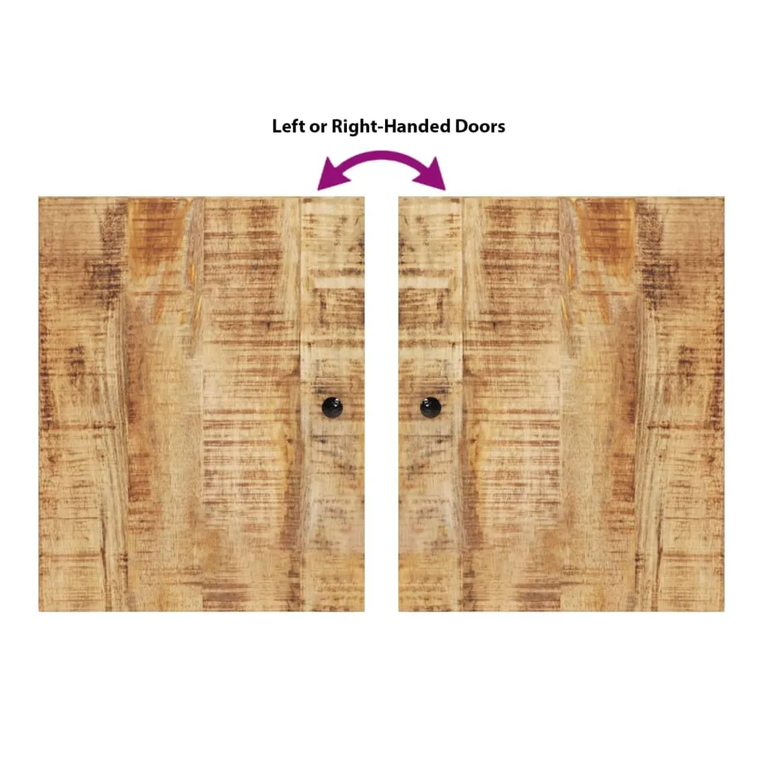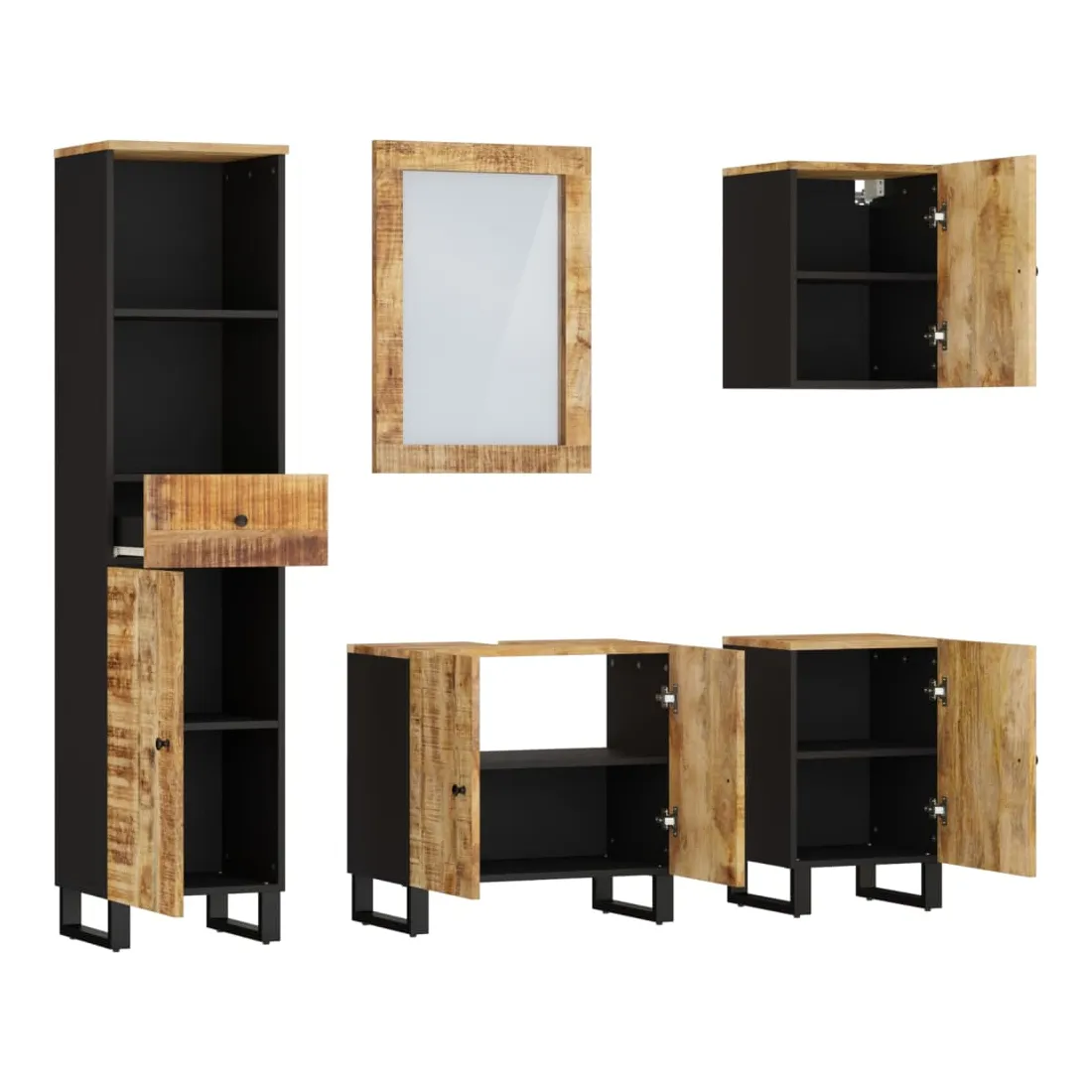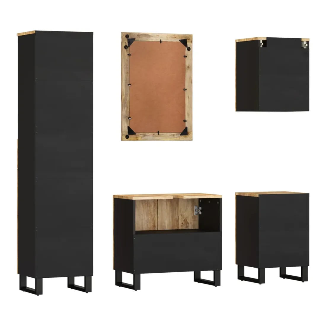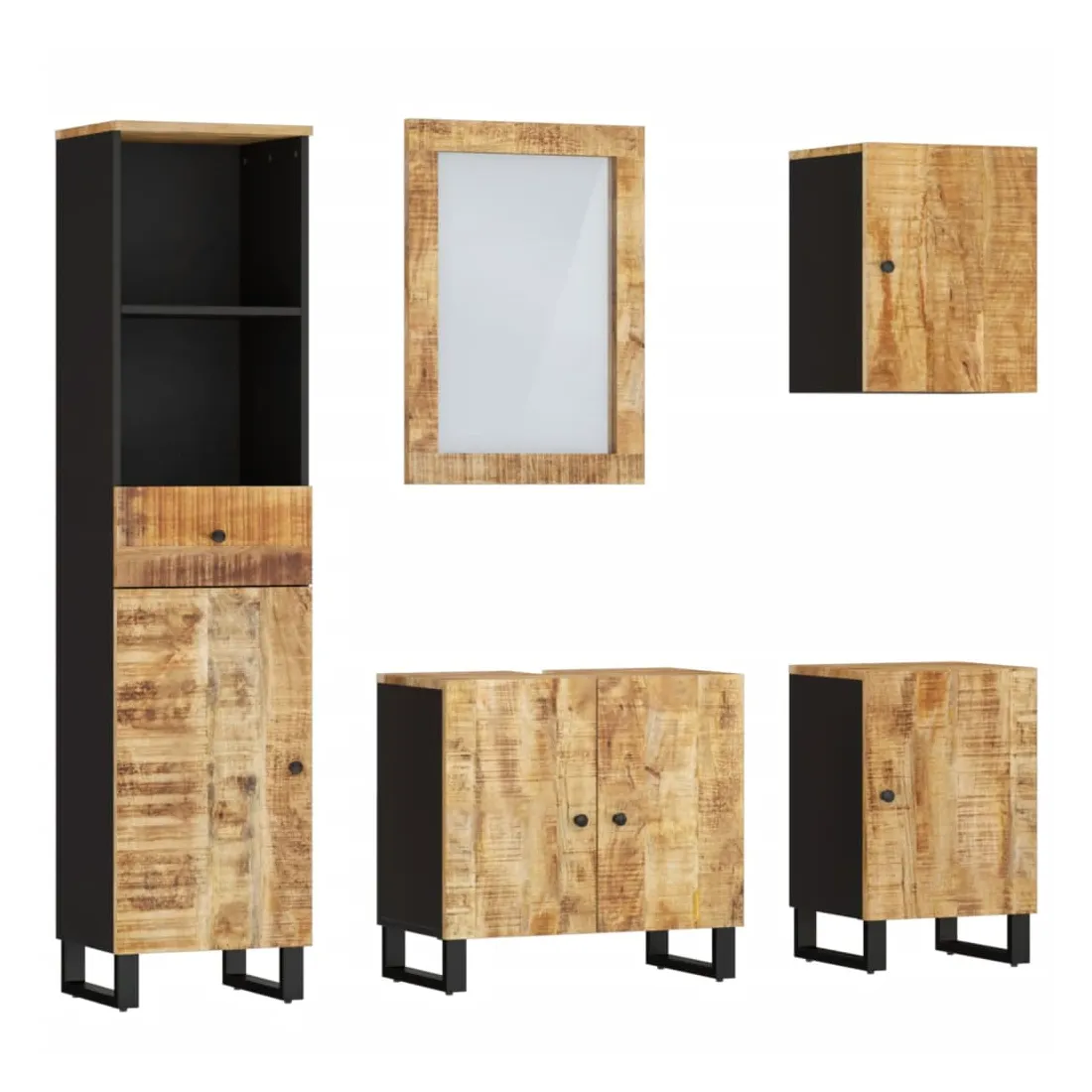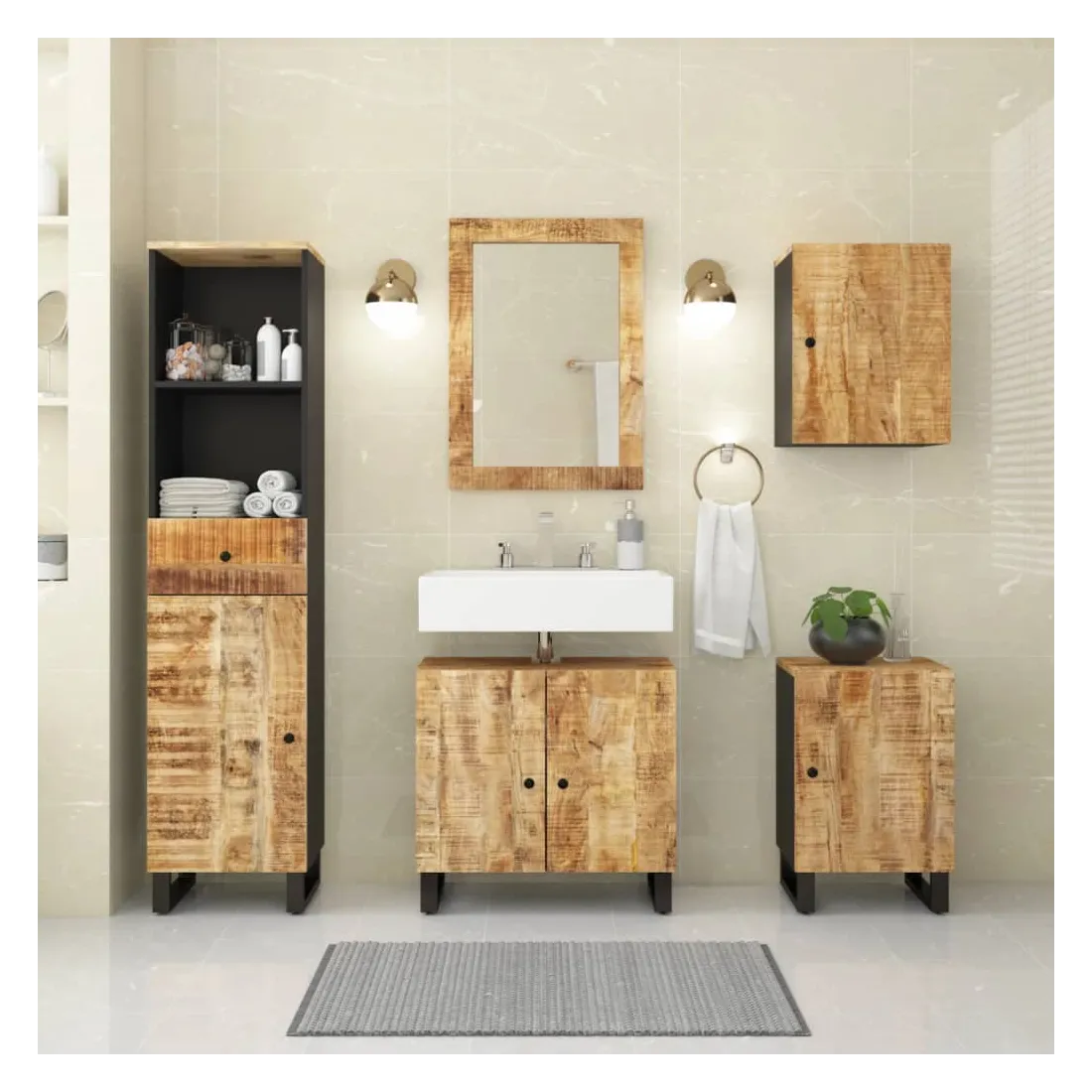 Cet ensemble de meubles de salle de bain pratique, avec un espace de rangement spacieux, est un excellent supplément à votre salle de bain, ce qui lui donne une apparence ordonnée et saisissante ! Bois de manguier massif : l'armoire est fabriquée en bois de manguier massif combinée au bois d'ingénierie. Le bois de manguier massif est un bois dur tropical solide qui fait des meubles robustes. Ses beaux grains de bois rendent chaque meuble légèrement différent l'un de l'autre.Grand espace de rangement : le meuble de rangement de salle de bain offre diverses options de rangement et un espace spacieux pour ranger des articles dans votre salle de bain.Fonction murale : l'armoire murale de salle de bain et le miroir de courtoisie peuvent être fixés au mur. De cette façon, vous pouvez maximiser votre espace au sol et garder la zone propre.Pieds stables : les pieds en fer de l'armoire de salle de bain assurent sa robustesse et stabilité.Design pratique : le dessus du meuble-lavabo de salle de bain est idéal pour placer le lavabo.Image claire : la face du miroir en verre offre une image claire. Ainsi, vous pouvez profiter d'un reflet magnifique et naturel lorsque vous vous tenez devant. Attention :Pour éviter qu'il ne soit renversé, ce produit doit être utilisé avec le dispositif de fixation au mur fourni.Bon à savoir :Le lavabo n'est pas inclus dans la livraison.Les vis et les chevilles pour l'intérieur du mur ne sont pas incluses. Nous vous conseillons de trouver et d'utiliser des vis et des chevilles adaptées spécifiquement à vos murs. Si vous n'êtes pas sûr, vous pouvez consulter un professionnel. Veuillez lire et suivre chaque étape des instructions.Chaque article est unique, avec des variations de couleurs et de grains. La livraison est aléatoire, ce qui garantit l'exclusivité et l'individualité de votre produit.