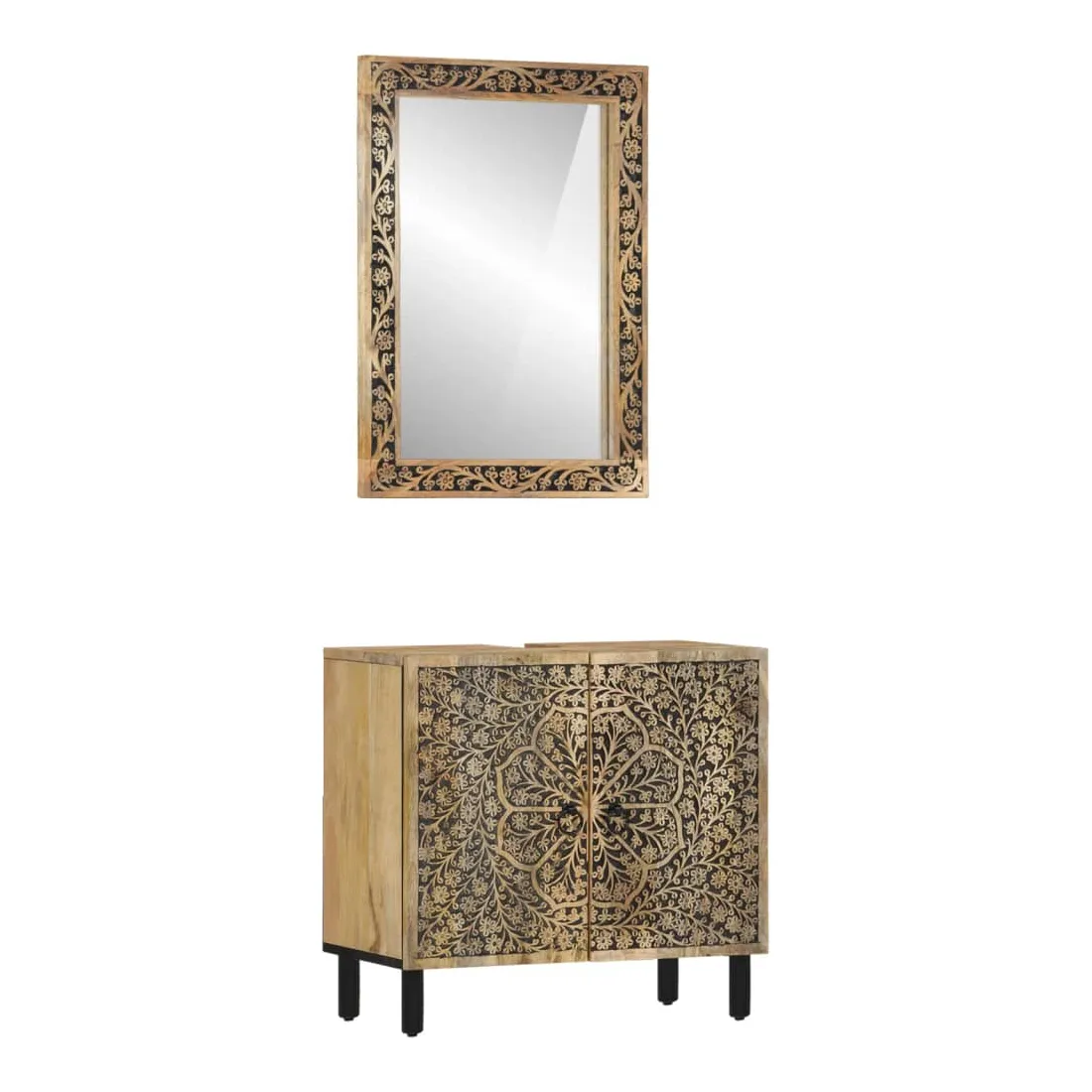 Cet ensemble de meubles de salle de bain pratique, avec un espace de rangement spacieux, est un excellent supplément à votre salle de bain, ce qui lui donne une apparence ordonnée et saisissante ! Bois de manguier massif : le bois de manguier massif est un bois dur tropical solide qui fait des meubles robustes. Ses beaux grains de bois rendent chaque meuble légèrement différent l'un de l'autre. Grand espace de rangement : les meubles de salle de bain en bois offrent diverses options de rangement et un espace spacieux pour ranger des objets dans votre salle de bain. Design peu encombrant : le miroir de courtoisie peut être facilement fixé au mur pour économiser de l'espace au sol. Le haut de l'armoire de toilette est idéal pour placer l'évier, ce qui permet d'utiliser pleinement l'espace libre sous l'évier. Image claire : la face en verre du miroir offre une réflexion fine et non déformée. Il convient donc pour se maquiller, se raser ou vérifier son costume avant de sortir. Attention :Pour éviter qu'il ne bascule, ce produit doit être utilisé avec le dispositif de fixation murale fourni. Bon à savoir :Chaque article est unique, avec des variations de couleurs et de grains. La livraison est aléatoire, ce qui garantit l'exclusivité et l'individualité de votre produit.