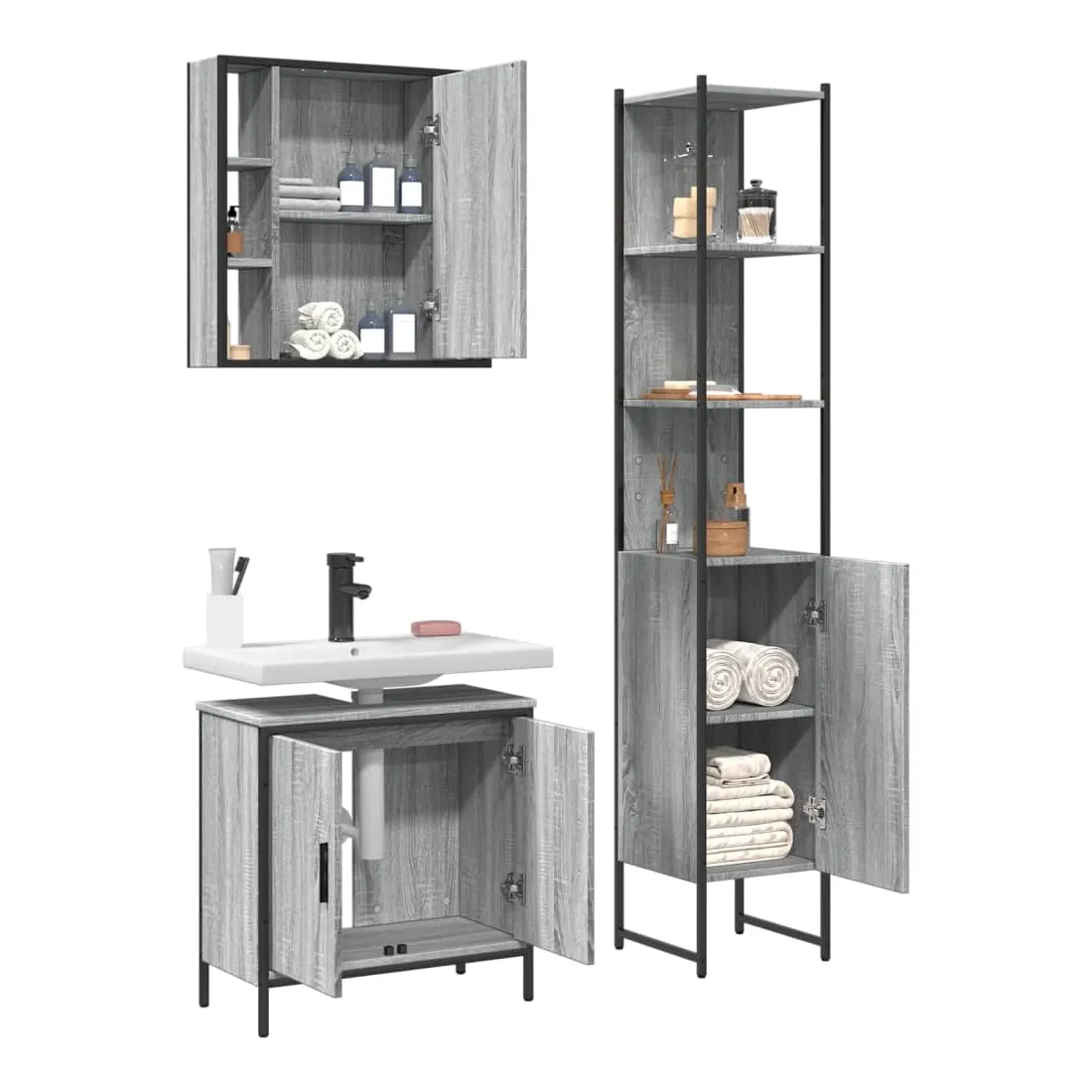 Cet ensemble d'armoires de salle de bain attrayant, avec un grand espace de rangement, présente un design élégant mais pratique. Construction robuste : l'acier revêtu de poudre et le bois d'ingénierie garantissent une construction robuste et offrent un support solide à vos articles.Grand espace de rangement : ce meuble de salle de bain offre un grand espace de rangement pour accueillir facilement vos articles de toilette et articles de bain essentiels tels que savons, shampoing, dentifrice, etc.Étagère de rangement supplémentaire : le miroir de bain est doté d'une étagère inférieure qui offre un espace de rangement supplémentaire pour les accessoires de salle de bains tels que les brosses à dents, les nettoyants pour le visage, les rasoirs, etc.Image claire : la face en verre du miroir offre une réflexion fine et non déformée. Il convient donc pour se maquiller, se raser ou vérifier son costume avant de sortir.Pieds réglables : les pieds réglables munis de coussinets en plastique maintiennent l'armoire de salle de bain en équilibre sur un sol inégal et augmentent sa stabilité. Attention :Pour éviter qu'il ne bascule, ce produit doit être utilisé avec le dispositif de fixation murale fourni. Bon à savoir :Les vis et les chevilles pour l'intérieur du mur ne sont pas incluses. Nous vous conseillons de trouver et d'utiliser des vis et des chevilles adaptées spécifiquement à vos murs. Si vous n'êtes pas sûr, vous pouvez consulter un professionnel. Veuillez lire et suivre chaque étape des instructions.