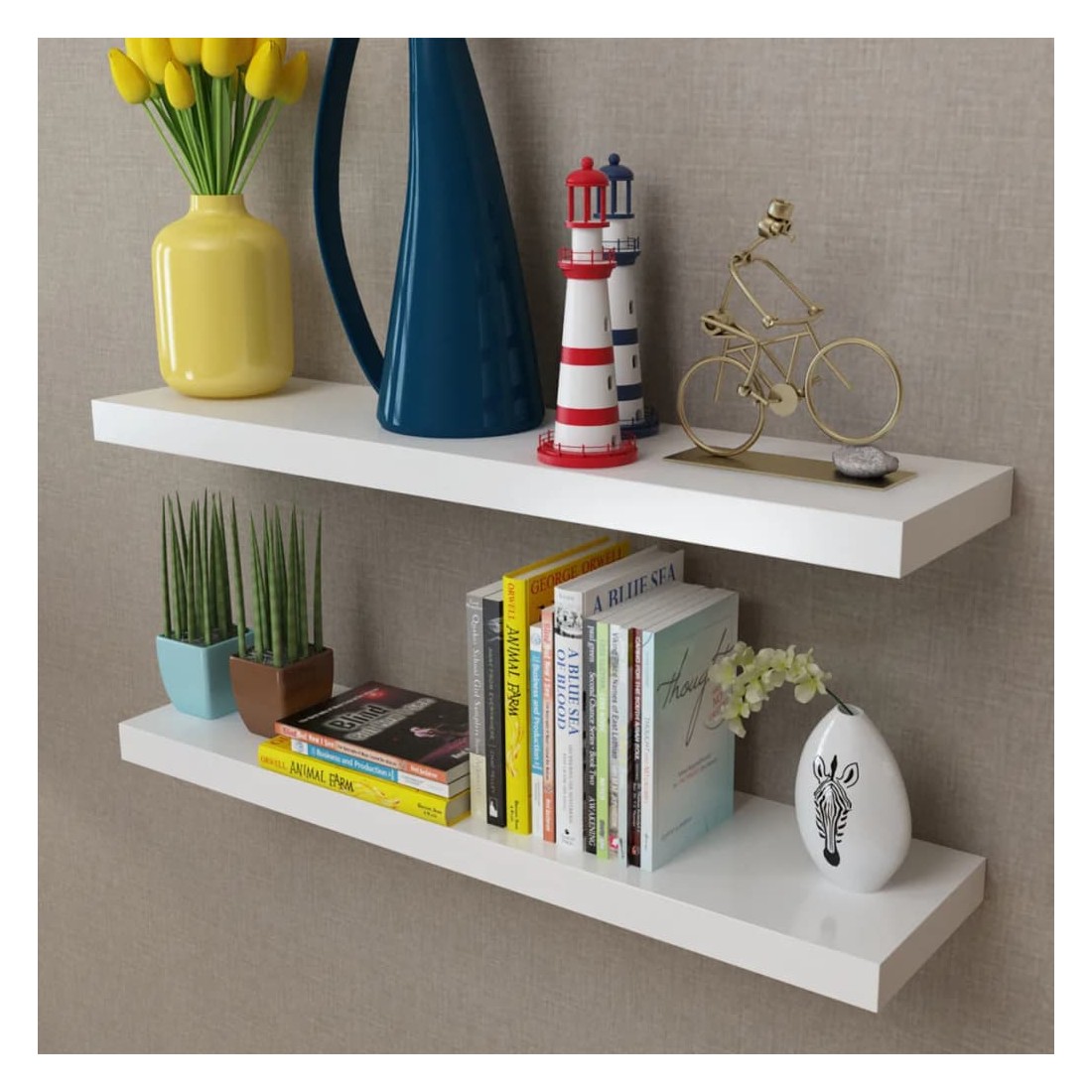 Cet ensemble se compose de 2 étagères murales qui deviendront le point de mire de votre maison. Avec un système de montage invisible, ces étagères murales sont faciles à installer et constituent le lieu idéal pour stocker des objets tels que des prix, des livres, des objets de collection, des ornements, etc. Ces étagères conviendront pour tous les décors et fera d'un mur vide, un article de fond! Cette étagère suspendue est faite de MDF de haute qualité avec une finition mate. La livraison inclus 2 étagères murales, vis et chevilles.