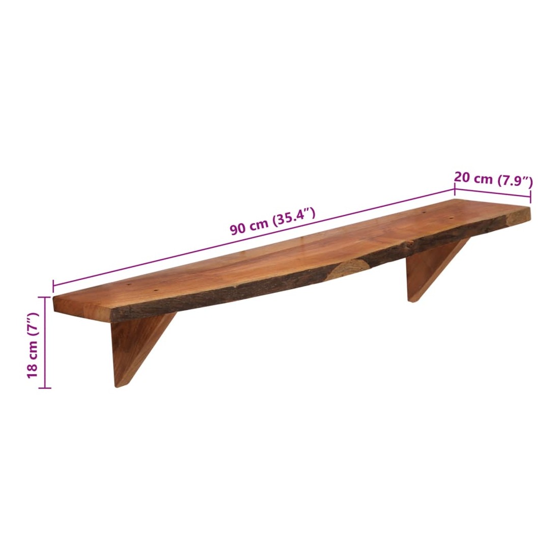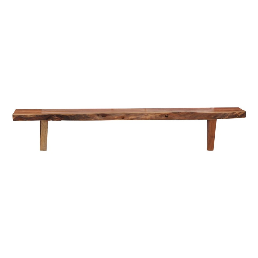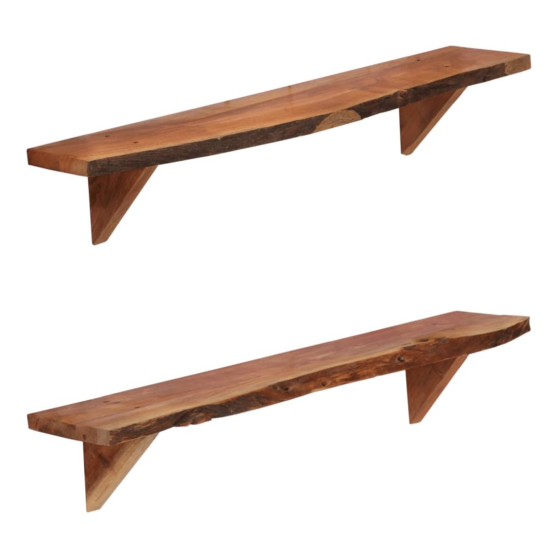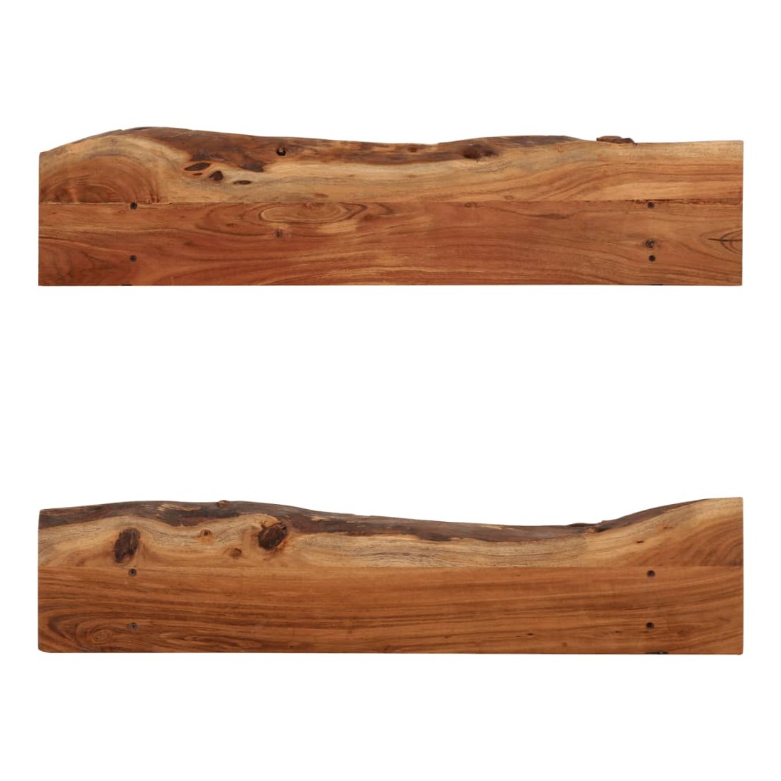 Ces étagères murales dégagent un charme rustique. Elles seront le centre de l'attention dans votre intérieur. Ces étagères murales sont faites de bois d'acacia massif qui a reçu une finition naturelle avec un bel aspect. Ces étagères murales sont entièrement faites à la main et le savoir-faire artisanal exquis ainsi que les grains de bois raffinés rendent chaque meuble unique et légèrement différent l'un de l'autre. De plus, la perfection de la fabrication garantit que chaque étape du processus est exécutée avec le plus grand soin, que ce soit le polissage, la peinture ou le vernissage. Ces étagères en bois serviront de solution idéale pour ranger et présenter votre collection de livres, magazines, documents, ainsi que des objets décoratifs comme des cadres photo et des objets de collection. Bon à savoir : chaque article est unique et présente des variations de couleurs, de grains et de formes. La livraison est aléatoire, ce qui garantit l'exclusivité et l'individualité de votre produit. La livraison comprend 2 étagères murales.