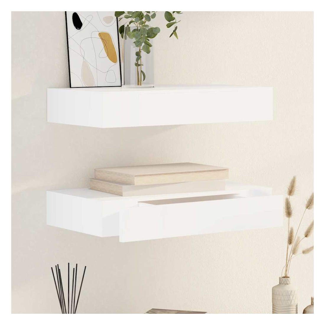 Cette étagère murale deviendra le point central de votre maison. Avec un système de montage invisible, cette étagère murale est facile à installer et constitue le lieu idéal pour ranger des objets tels que des récompenses, des livres, des objets de collection, des ornements, etc. Elle comporte un tiroir pour les petits objets tels que clés, DVD, blocs-notes, stylos et autres bibelots. Cette étagère présentera n'importe quelle décoration et transformera un mur vide en une caractéristique ! Cette étagère suspendue est fabriquée en MDF de haute qualité avec une finition mate. La livraison inclus 2 étagères murales, vis et chevilles.