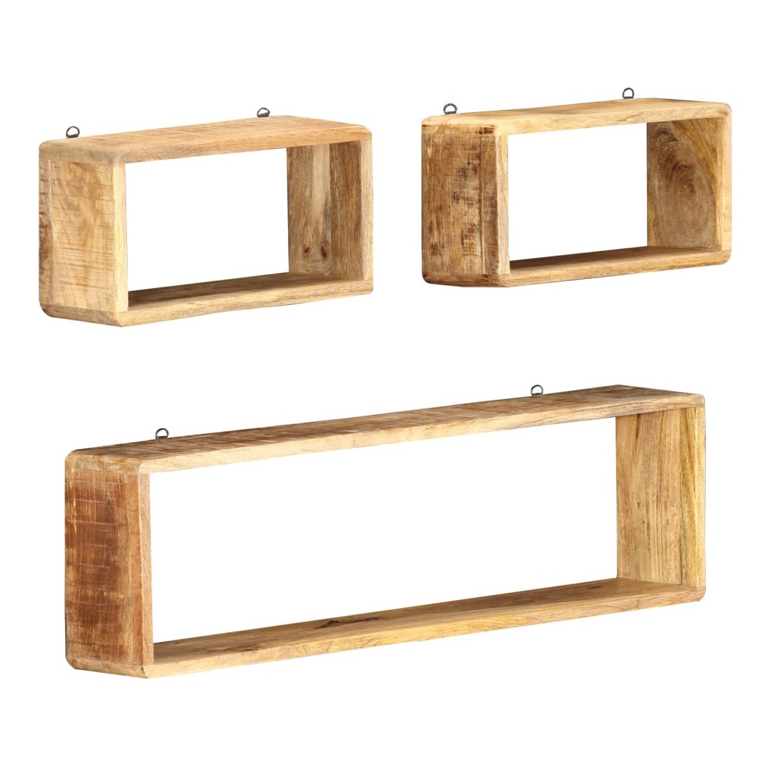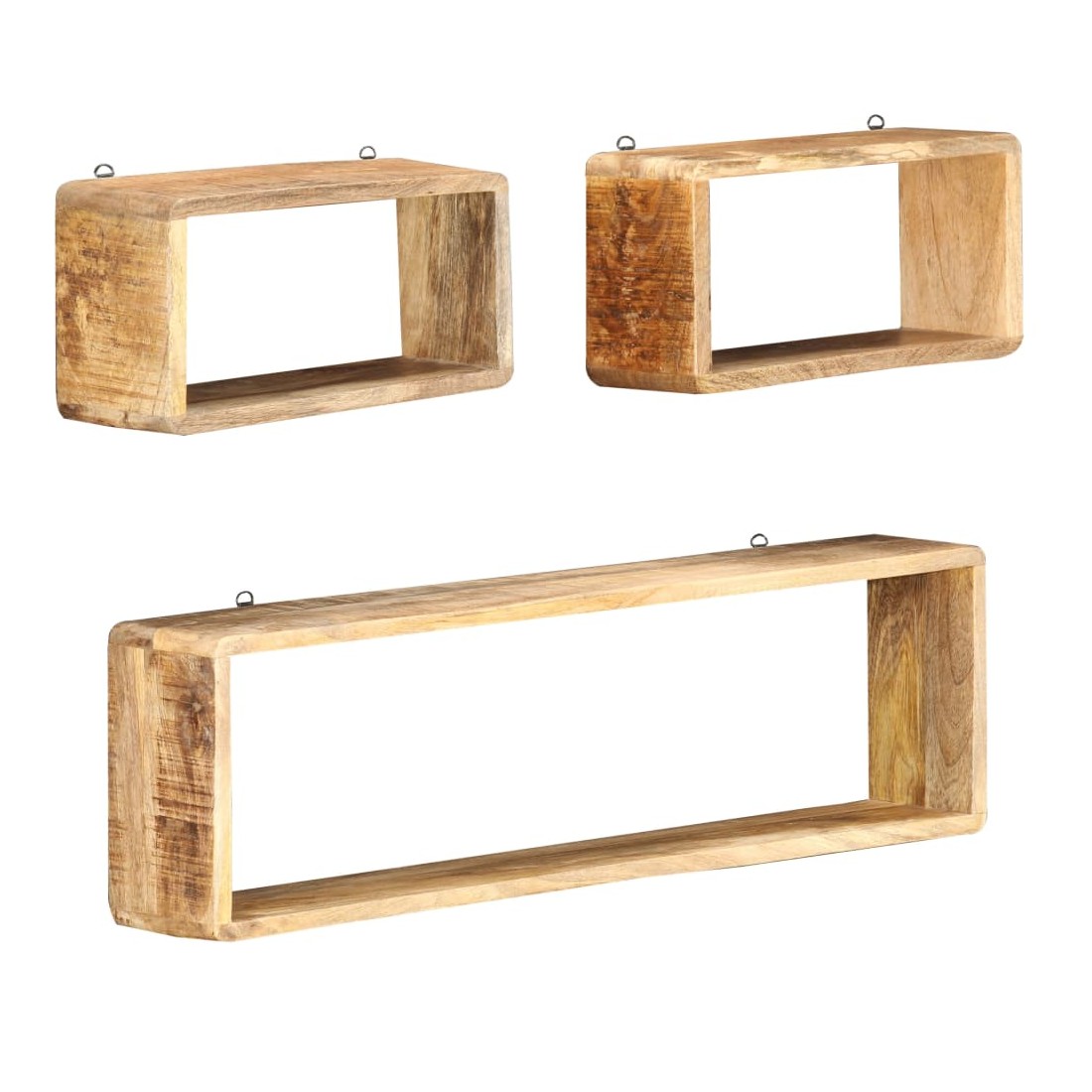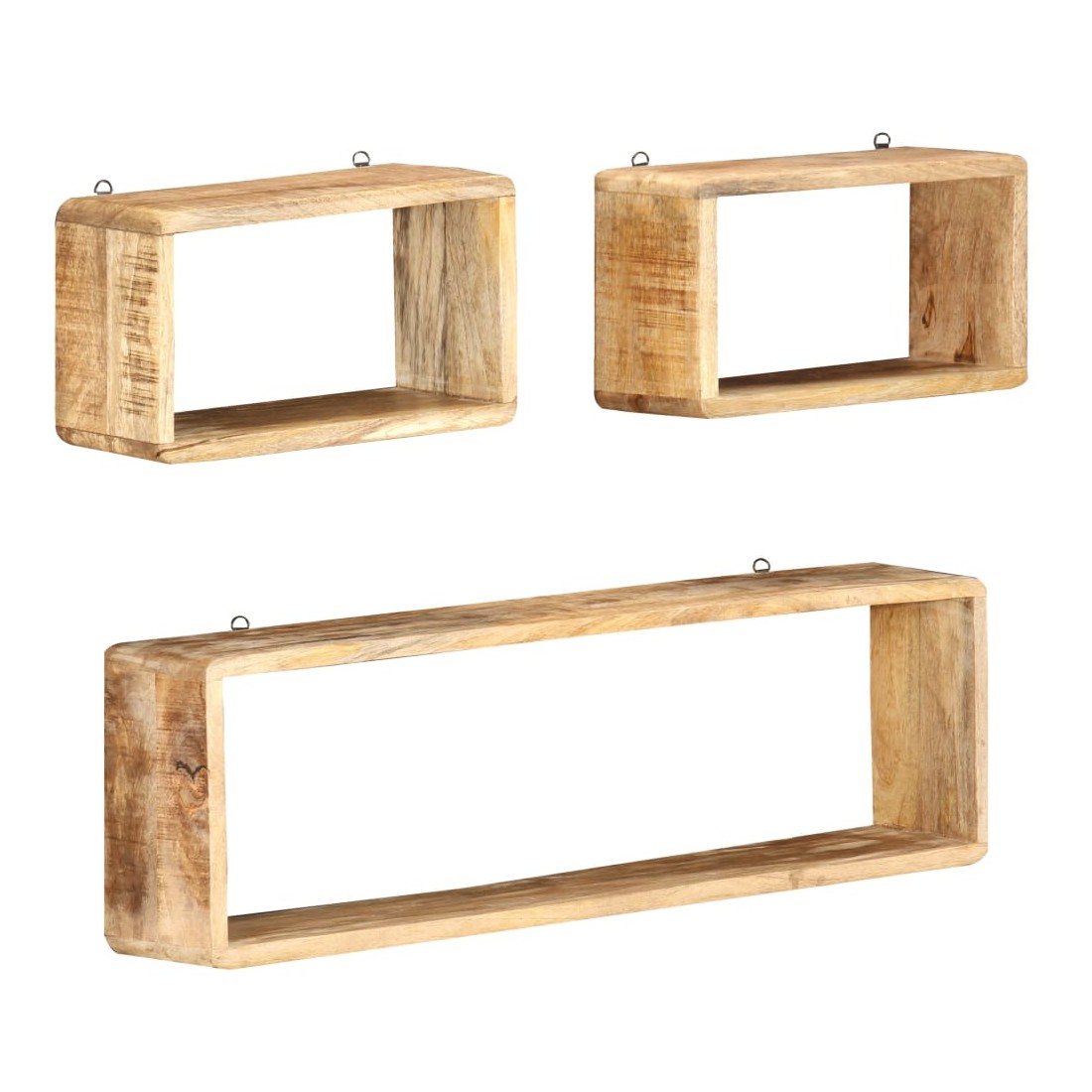 Fabriquées en bois massif de récupération, ces 3 étagères cube apporteront une touche de convivialité et d'esthétisme à votre intérieur. Les variations de grain et de couleur confèrent à ces étagères un caractère unique. Ces étagères murales sont en bois de manguier massif, qui est un bois dur dense et robuste avec des belles stries et des contours bruns ou dorés à sa surface. L'artisanat parfait garantit que chaque étape du processus est effectuée avec le plus grand soin, qu'il s'agisse de polissage, de peinture ou de laquage. Cet ensemble de 3 étagères cube en bois sera une solution idéale pour stocker et afficher vos livres, récompenses, objets de collection, ornements, etc. La livraison comprend 3 étagères murales. Remarque importante : les grains de bois varient d'une pièce à l'autre, rendant chaque pièce unique. La livraison est aléatoire, ce qui garantit l'exclusivité et l'individualité de votre produit.