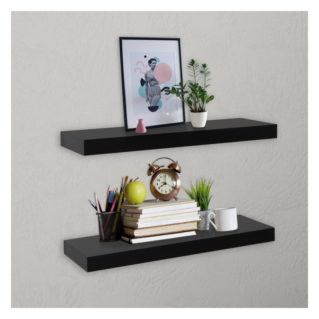 Cet ensemble se compose de 2 étagères murales qui deviendront le point de mire de votre maison. Avec un système de montage invisible, ces étagères murales sont faciles à installer et constituent le lieu idéal pour stocker des objets tels que des prix, des livres, des objets de collection, des ornements, etc. Cette étagère d'affichage conviendra à n'importe quel décor et transformera un mur vide en une fonctionnalité ! Ces étagères suspendues sont en MDF avec peinture, qui est durable et facile à nettoyer. Les étagères sont faciles à assembler.