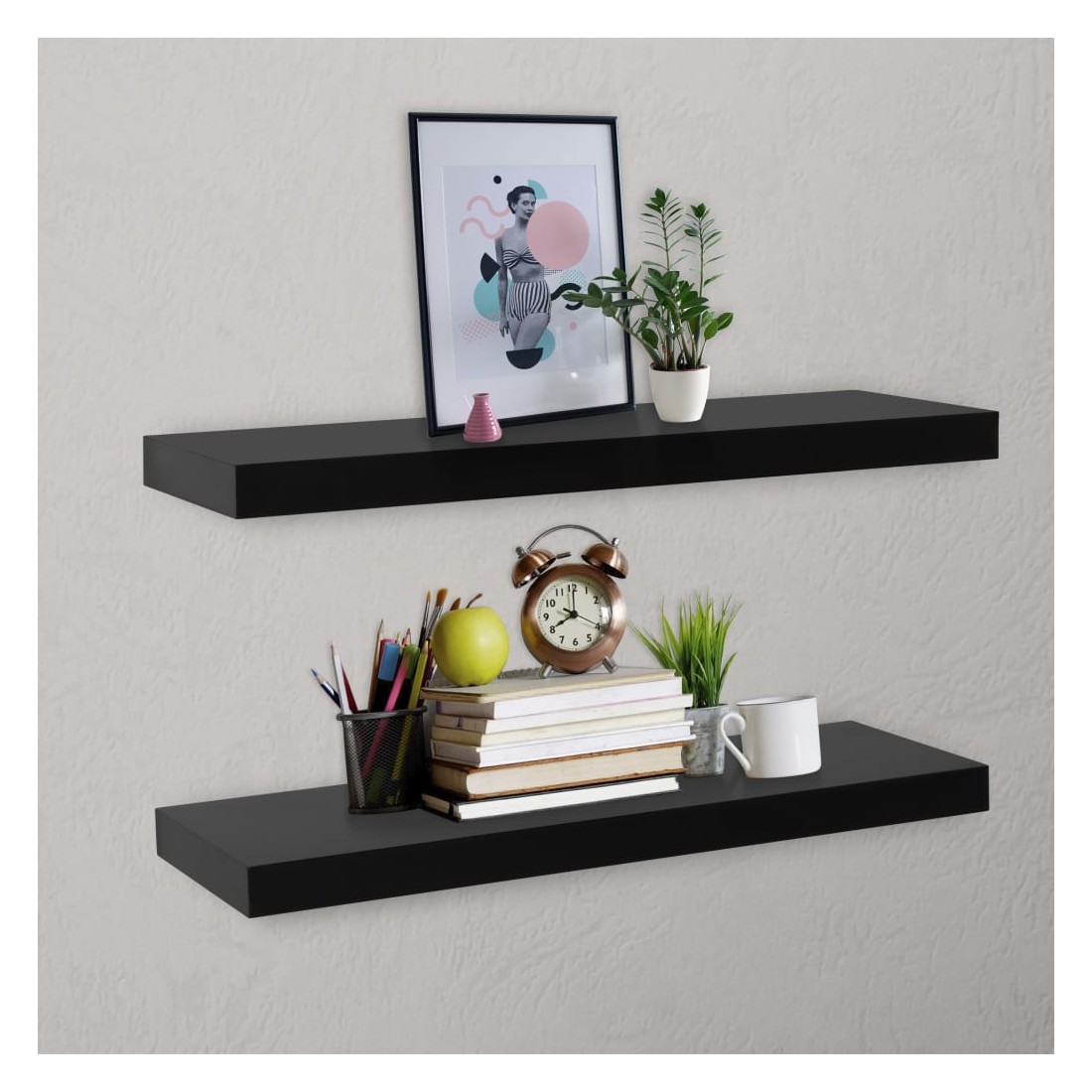 Cet ensemble se compose de 2 étagères murales qui deviendront le point de mire de votre maison. Avec un système de montage invisible, ces étagères murales sont faciles à installer et constituent le lieu idéal pour stocker des objets tels que des prix, des livres, des objets de collection, des ornements, etc. Cette étagère d'affichage conviendra à n'importe quel décor et transformera un mur vide en une fonctionnalité ! Ces étagères suspendues sont en MDF avec peinture, qui est durable et facile à nettoyer. Les étagères sont faciles à assembler.