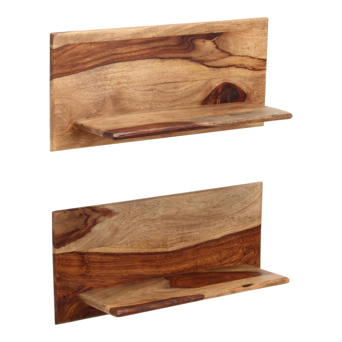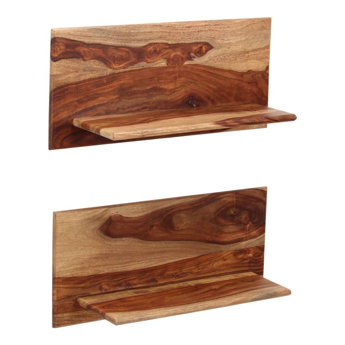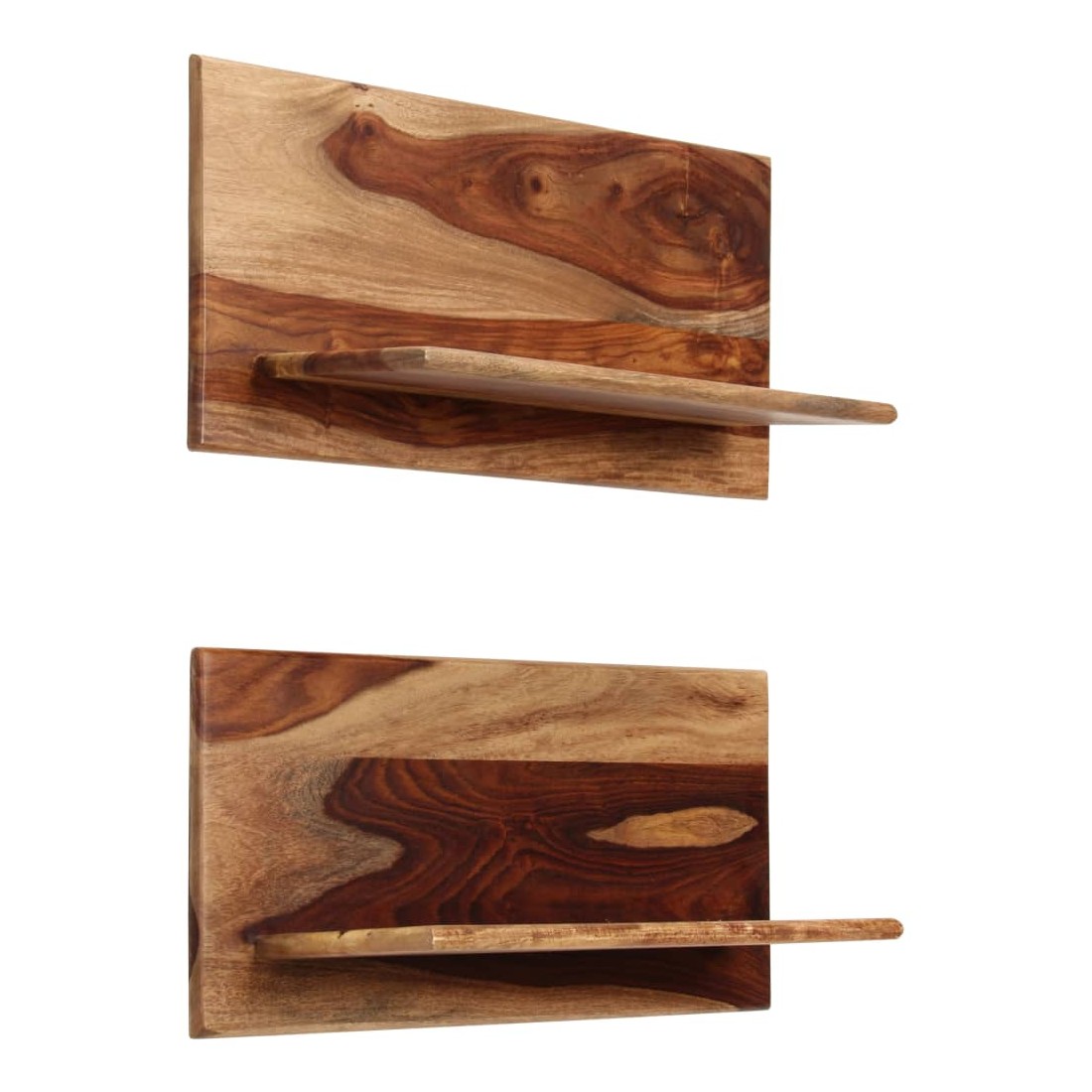 Ces étagères murales dégagent un charme rustique. Elles seront le centre de l'attention dans votre intérieur. Ces étagères murales sont faites de bois massif de Sesham, également connu sous le nom de bois de rose ou palissandre, un bois dur tropical qui est célèbre pour ses grains naturels et sa texture lisse. De plus, il ne se déforme pas, ne se fend pas et présente une résistance naturelle à la pourriture. Ces étagères murales sont entièrement faites à la main et le savoir-faire artisanal exquis ainsi que les grains de bois raffinés rendent chaque meuble unique et légèrement différent l'un de l'autre. De plus, la perfection de la fabrication garantit que chaque étape du processus est réalisée avec le plus grand soin, que ce soit le polissage, la peinture ou le vernissage. Ces étagères en bois serviront de solution idéale pour ranger et présenter votre collection de livres, magazines, documents, ainsi que des objets décoratifs comme des cadres photo et des objets de collection. Remarque importante : les grains de bois varient d'une pièce à l'autre, rendant chaque pièce unique ; La livraison est aléatoire, ce qui garantit l'exclusivité et l'individualité de votre produit. La livraison comprend 2 étagères murales.