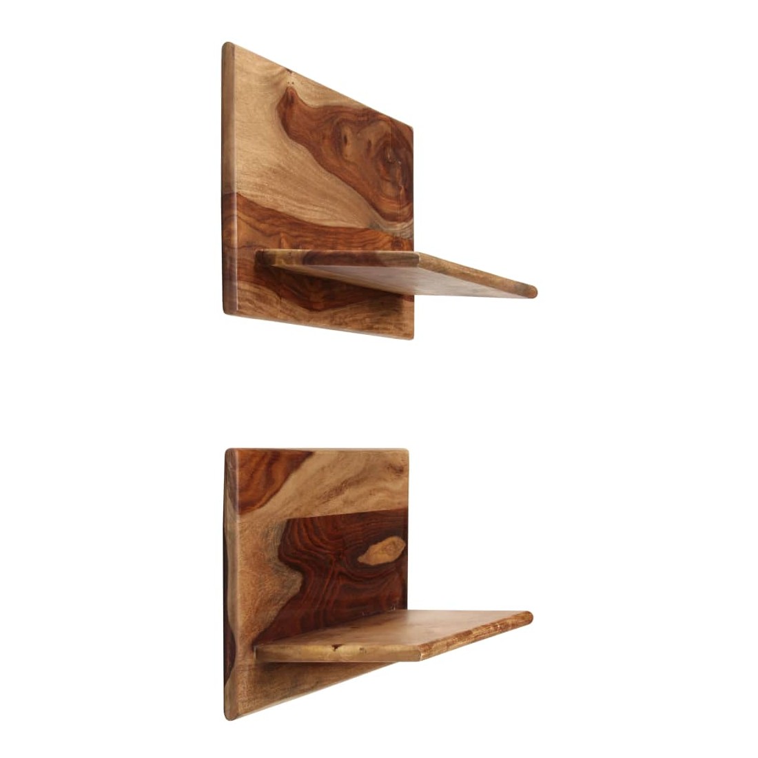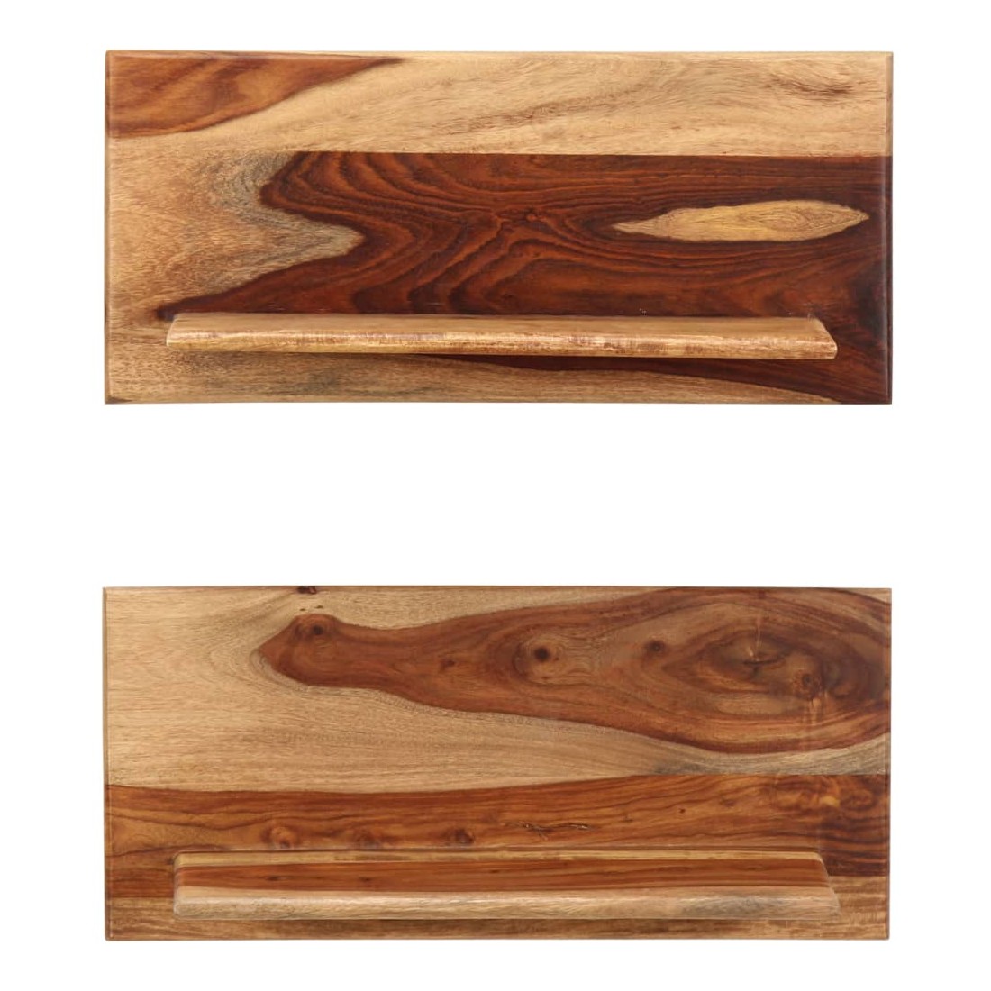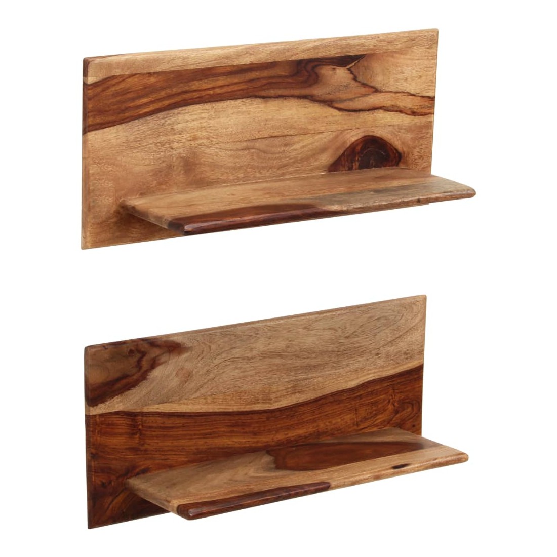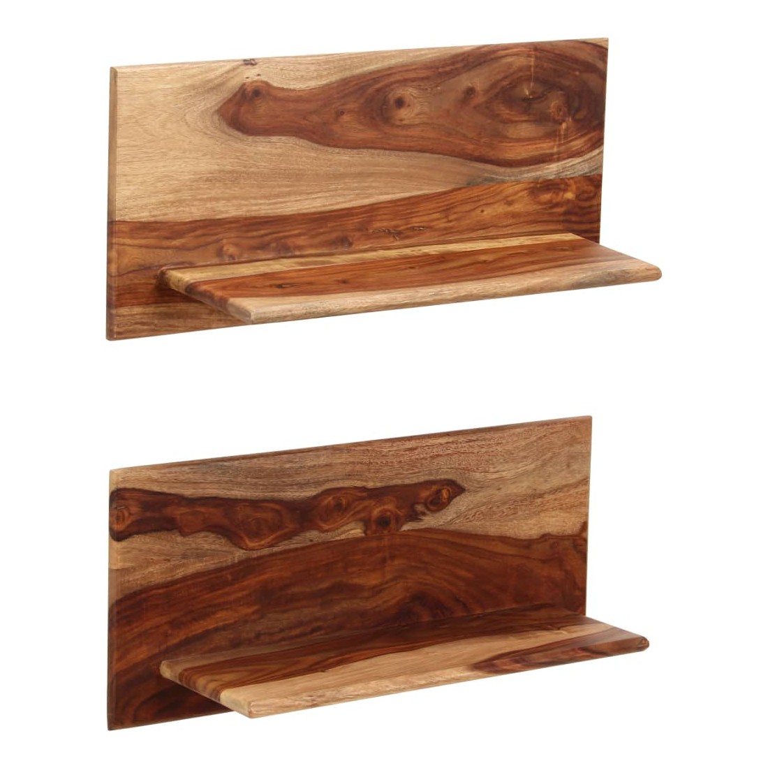 Ces étagères murales dégagent un charme rustique. Elles seront le centre de l'attention dans votre intérieur. Ces étagères murales sont faites de bois massif de Sesham, également connu sous le nom de bois de rose ou palissandre, un bois dur tropical qui est célèbre pour ses grains naturels et sa texture lisse. De plus, il ne se déforme pas, ne se fend pas et présente une résistance naturelle à la pourriture. Ces étagères murales sont entièrement faites à la main et le savoir-faire artisanal exquis ainsi que les grains de bois raffinés rendent chaque meuble unique et légèrement différent l'un de l'autre. De plus, la perfection de la fabrication garantit que chaque étape du processus est réalisée avec le plus grand soin, que ce soit le polissage, la peinture ou le vernissage. Ces étagères en bois serviront de solution idéale pour ranger et présenter votre collection de livres, magazines, documents, ainsi que des objets décoratifs comme des cadres photo et des objets de collection. Remarque importante : les grains de bois varient d'une pièce à l'autre, rendant chaque pièce unique ; La livraison est aléatoire, ce qui garantit l'exclusivité et l'individualité de votre produit. La livraison comprend 2 étagères murales.