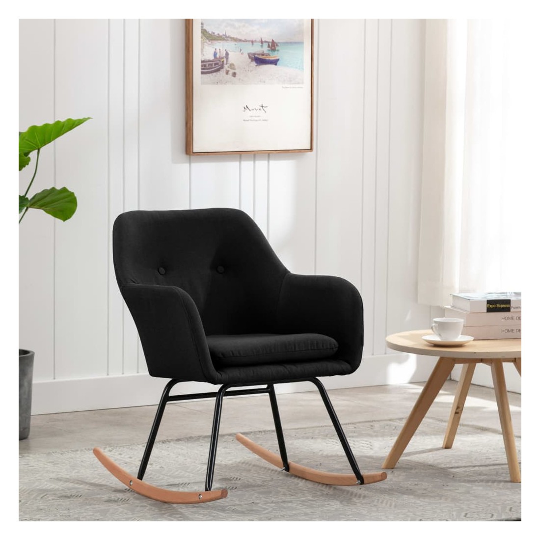 Cette chaise à bascule au design moderne apporte une sensation chaleureuse et un confort à votre espace de vie. La chaise à bascule est recouverte de tissu doux et a un cadre en métal enduit de poudre, ce qui la rend stable et douce pour l'utiliser. Le coussin bien rembourré, amovible et facile à nettoyer, vous apporte un confort d'assise supplémentaire. De plus, les pieds en bois de hêtre offrent également une grande stabilité. Avec la conception de pieds longs, la chaise ne basculera pas facilement. Cette chaise peut être utilisée dans votre salon, jardin, sur la terrasse et toute autre pièce.