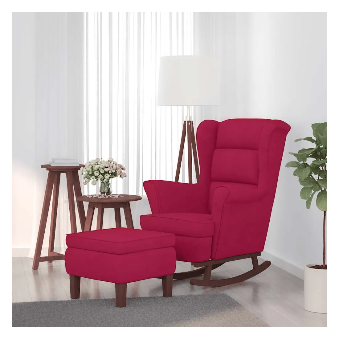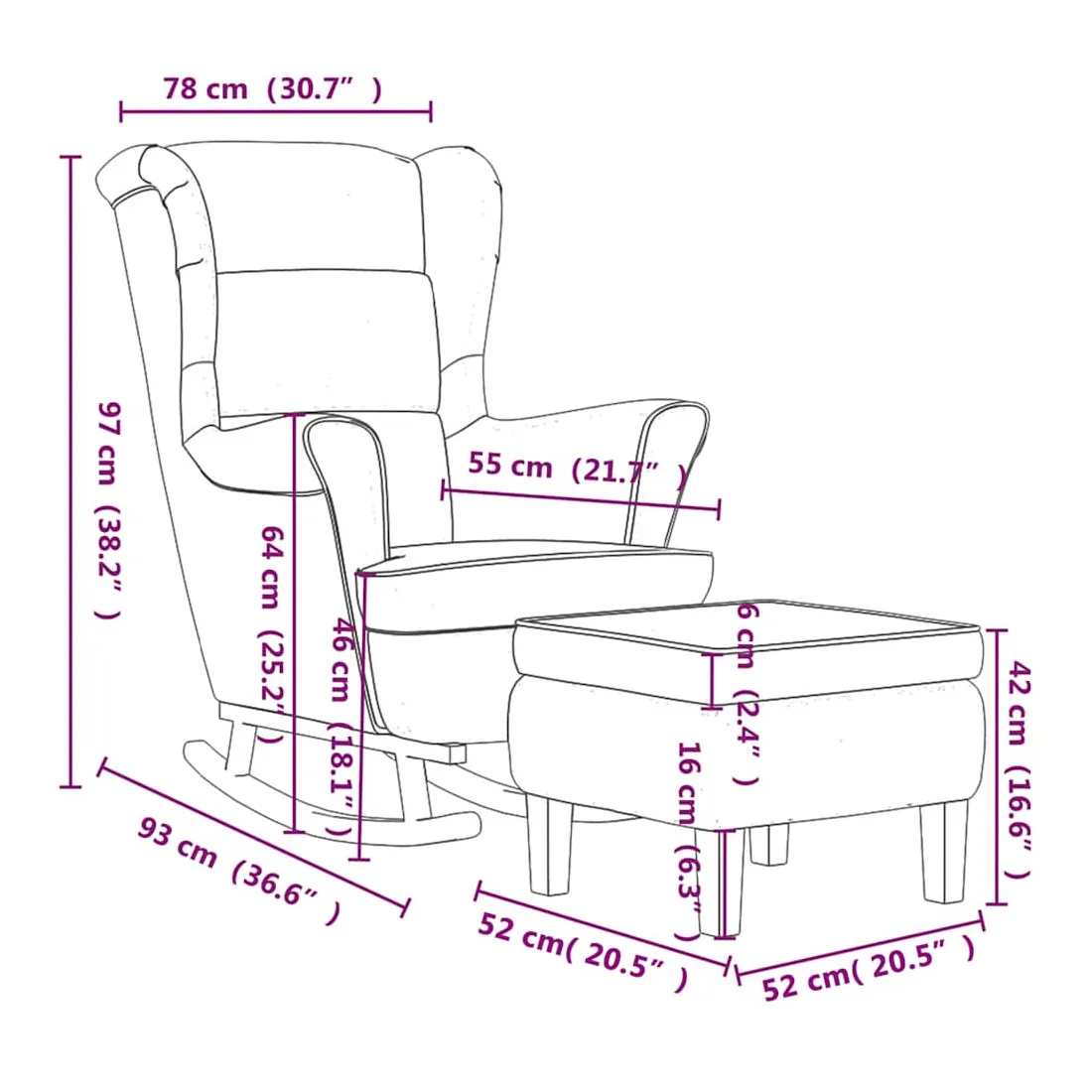 Ce fauteuil à bascule avec tabouret devient le point central de votre salon, ainsi qu'un lieu de prédilection pour lire ou vous détendre. Velours doux : le fauteuil avec repose-pied sont fabriqués en velours, qui est un tissu doux et luxueux, il se reconnaît à sa pile dense de fibres uniformément coupées qui ont une sieste lisse. Le tissu de velours se caractérise par une sensation de douceur distinctive, ce qui le rend agréable au toucher.Pieds à bascule : détendez-vous en vous asseyant confortablement tout en profitant d'un mouvement de bercement doux et apaisant de cette chaise longue.Accoudoirs confortables : les accoudoirs de ce fauteuil de salon permettent à vos bras de se reposer confortablement.Tabouret pratique : ce tabouret ottoman convient pour poser vos pieds à la fin de la journée. Vous pouvez également l'utiliser comme siège supplémentaire dans votre salon ou votre entrée. Remarque :Chaque produit est livré avec un manuel de montage dans la boîte pour un montage facile.