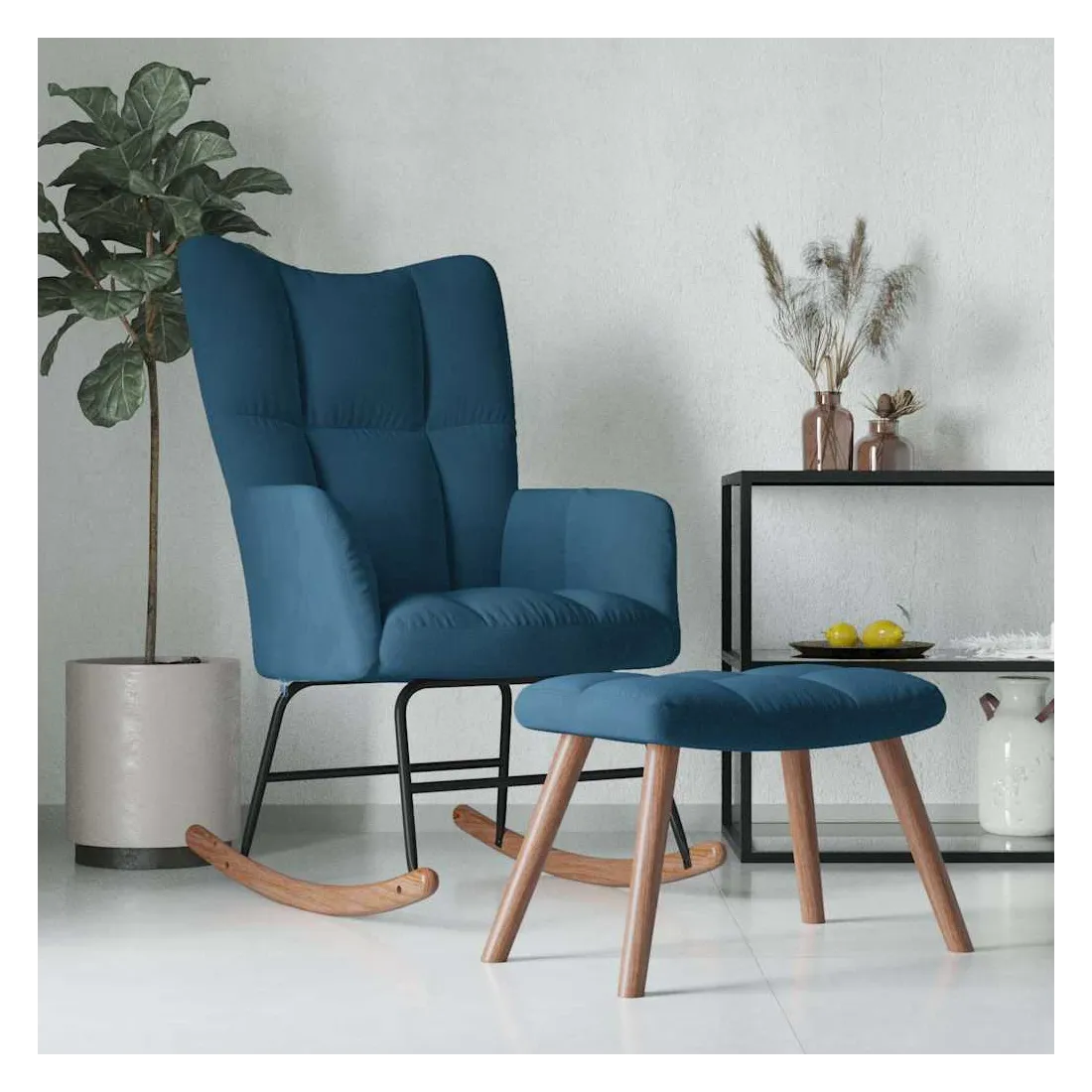 Ce fauteuil à bascule avec tabouret présente un design chic et élégant et apportera une touche moderne à votre décoration. Avec ses blocs, ce fauteuil de détente est esthétiquement agréable. Grâce à sa mousse épaisse et son revêtement en velours doux au toucher, vous profiterez d'un confort optimal. Grâce à ses longs rails à bascule, le fauteuil ne basculera pas facilement. De plus, grâce à sa structure et ses pieds en acier, ainsi qu'à ses rails à bascule en bois, ce fauteuil de salon avec tabouret est stable et durable.