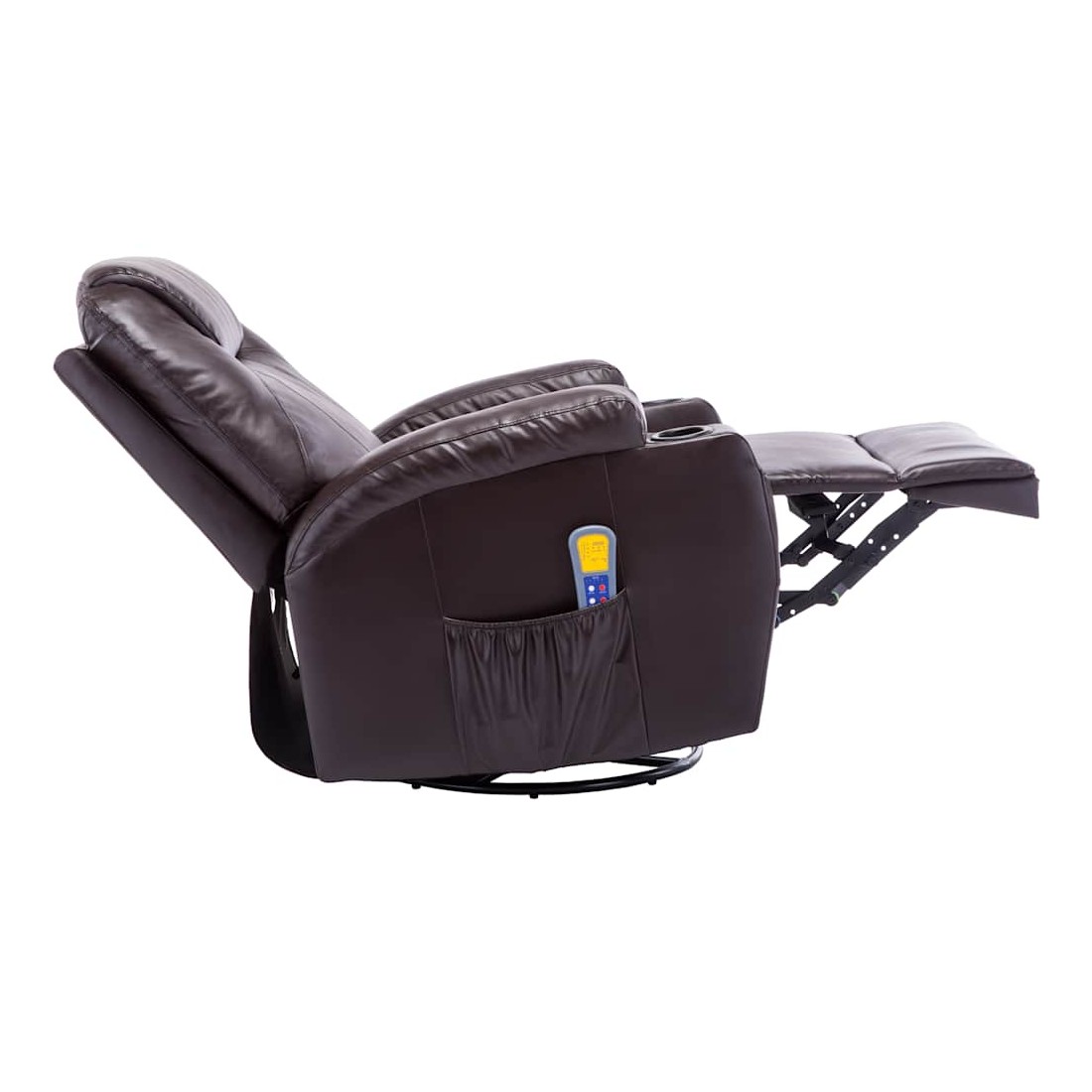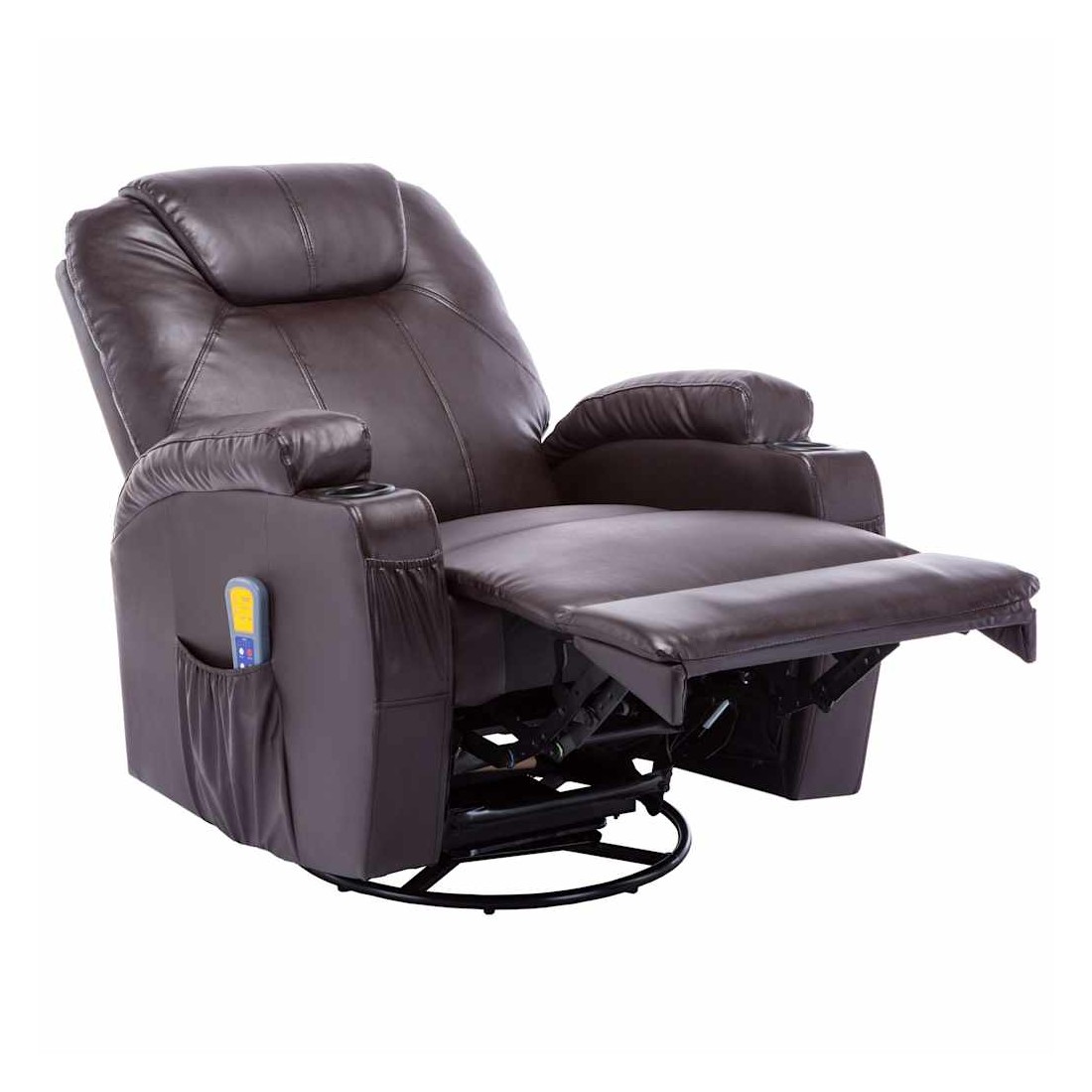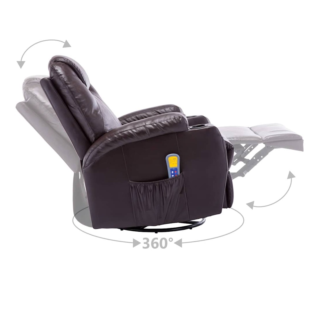 Notre fauteuil électrique à bascule de massage de haute qualité sera un choix parfait pour vous permettre de vous détendre complètement après une journée bien remplie. Tapissé en similicuir premium avec le siège et le dossier bien rembourrés, ce fauteuil pivotant et inclinable est conçu pour vous offrir le confort ultime. Le fauteuil dispose de son système pivotant qui peut fournir une vue à 360 ° de la pièce. Le fauteuil pivotant de massage dispose de 8 nœuds de massage pour apaiser tout votre corps. Le dossier et le repose-pied peuvent être ajustés selon différents angles en fonction de vos besoins. La télécommande incluse peut être rangée dans la poche latérale du fauteuil de massage. Le fauteuil électrique de massage est facile à assembler. Remarque : ce produit est doté d'un connecteur USB, mais la source d'alimentation certifiée de USB 5V n'est pas incluse.