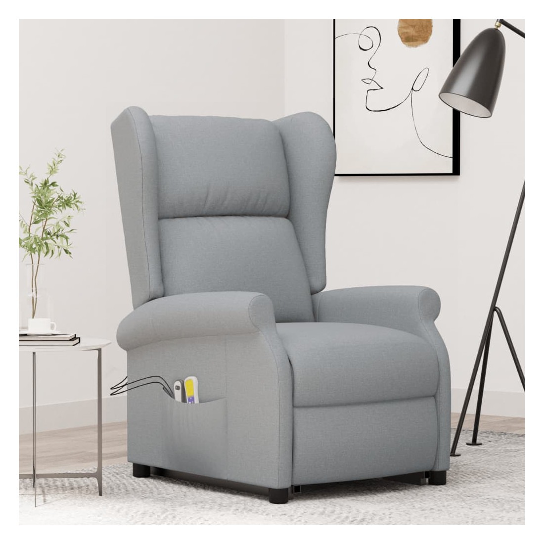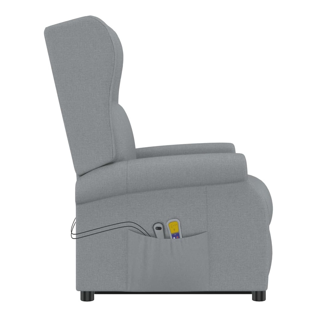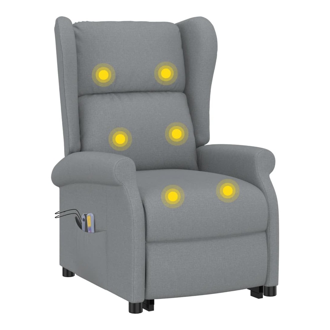 Asseyez-vous et laissez-vous aller dans ce fauteuil de massage debout très confortable ! Fonction d'inclinaison manuelle : Ce fauteuil inclinable est spécialement conçu avec 3 positions d'inclinaison pour que vous puissiez régler manuellement le dossier et le repose-pieds selon votre confort.Fonction de levage électrique : Ce fauteuil inclinable pour personnes âgées est équipé d'un moteur électrique pour la fonction de levage. Grâce à la fonction qui pousse l'ensemble du fauteuil vers le haut, vous pouvez facilement vous lever sans stresser votre dos et vos genoux grâce à la commande manuelle à 2 boutons.Fonction de vibration : Les 6 points de massage vous permettent de bénéficier d'un massage mieux ciblé. De plus, la commande manuelle incluse vous permet de choisir différents programmes de massage. La fonction de massage est alimentée par le connecteur USB, mais la source d'alimentation USB 5 V certifiée n'est pas incluse.Expérience d'assise confortable : L'assise, le dossier et les larges accoudoirs recouverts de tissu au rembourrage épais offrent une sensation de confort et de chaleur, vous donnant l'impression d'être bien assis. Le tissu, à l'aspect simple et épuré, est respirant et résistant.Cadre solide et stable : Le cadre en bois et en métal assure une structure solide et stable. Ce fauteuil inclinable est confortable et résistant.