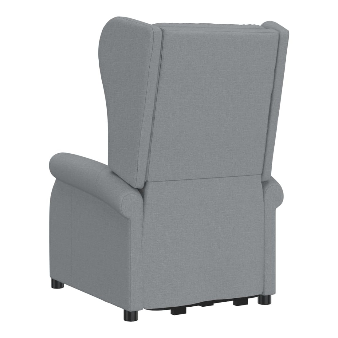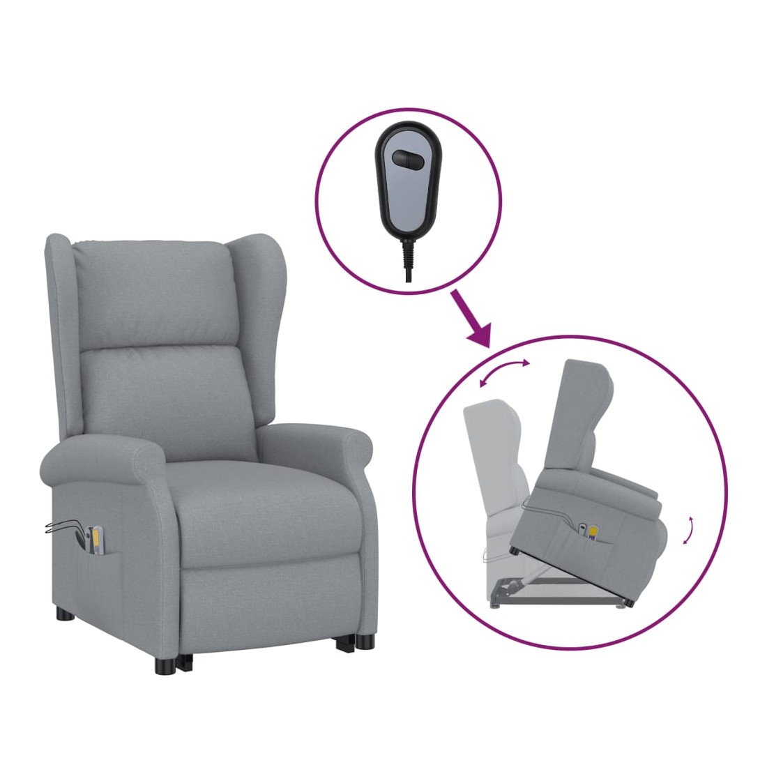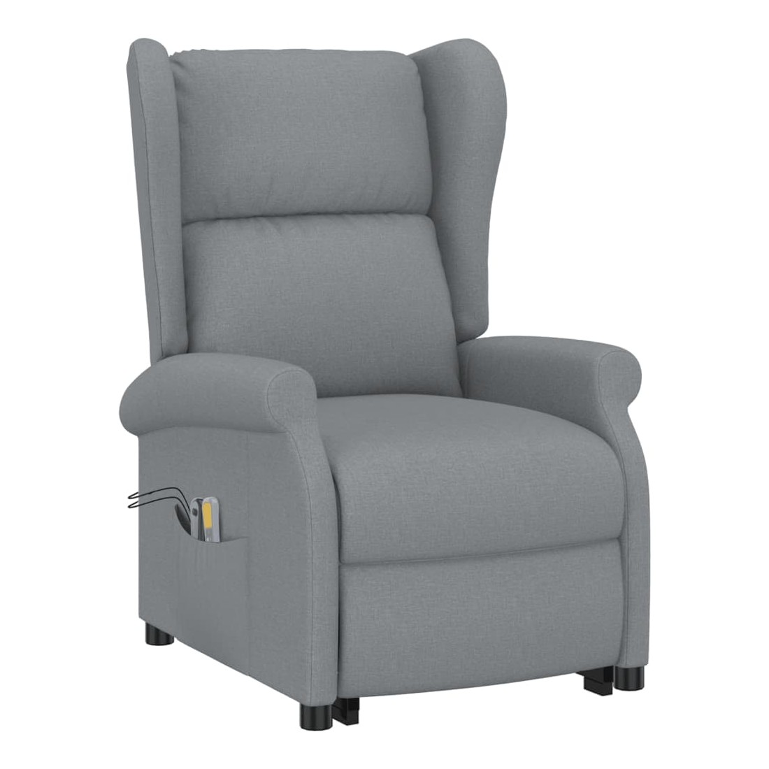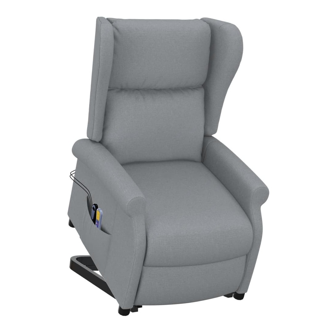 Asseyez-vous et laissez-vous aller dans ce fauteuil de massage debout très confortable ! Fonction d'inclinaison manuelle : Ce fauteuil inclinable est spécialement conçu avec 3 positions d'inclinaison pour que vous puissiez régler manuellement le dossier et le repose-pieds selon votre confort.Fonction de levage électrique : Ce fauteuil inclinable pour personnes âgées est équipé d'un moteur électrique pour la fonction de levage. Grâce à la fonction qui pousse l'ensemble du fauteuil vers le haut, vous pouvez facilement vous lever sans stresser votre dos et vos genoux grâce à la commande manuelle à 2 boutons.Fonction de vibration : Les 6 points de massage vous permettent de bénéficier d'un massage mieux ciblé. De plus, la commande manuelle incluse vous permet de choisir différents programmes de massage. La fonction de massage est alimentée par le connecteur USB, mais la source d'alimentation USB 5 V certifiée n'est pas incluse.Expérience d'assise confortable : L'assise, le dossier et les larges accoudoirs recouverts de tissu au rembourrage épais offrent une sensation de confort et de chaleur, vous donnant l'impression d'être bien assis. Le tissu, à l'aspect simple et épuré, est respirant et résistant.Cadre solide et stable : Le cadre en bois et en métal assure une structure solide et stable. Ce fauteuil inclinable est confortable et résistant.