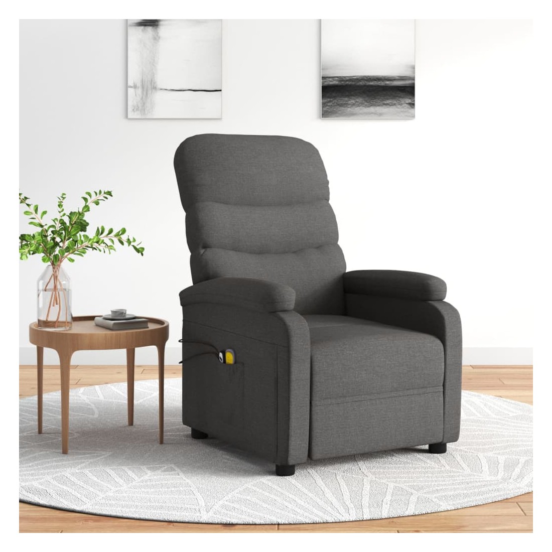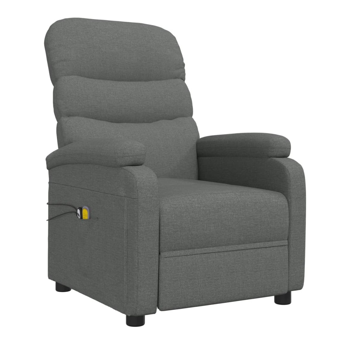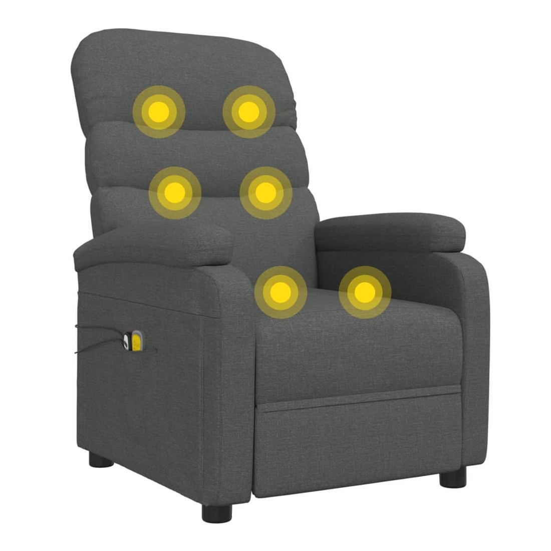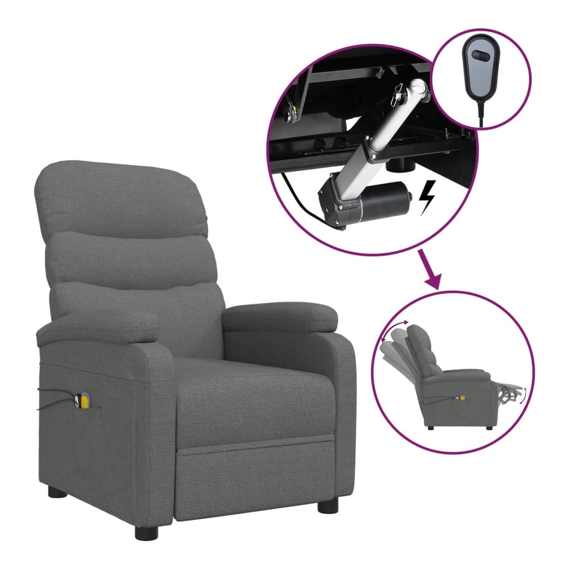 Asseyez-vous et détendez-vous dans ce fauteuil de massage électrique très confortable ! Fonction d'inclinaison électrique : le fauteuil inclinable est équipé d'un moteur électrique pour la fonction d'inclinaison. Il offre 3 positions d'inclinaison et vous pouvez facilement régler le dossier et le repose-pied à l'aide de la commande manuelle à 2 boutons incluse, en fonction de votre confort.Fonction de vibration : les 6 points de massage vous permettent de faire l'expérience d'un massage mieux ciblé. De plus, la télécommande incluse vous permet de choisir différents programmes de massage. La fonction de massage est alimentée par le connecteur USB, mais la source d'alimentation USB 5V certifiée n'est pas incluse.Expérience d'assise confortable : le siège, le dossier et les larges accoudoirs rembourrés épais recouverts de tissu procurent une sensation confortable et chaleureuse, vous permettant de vous sentir enveloppé lorsque vous êtes assis. Le tissu présente un aspect simple et épuré, et est respirant et durable.Cadre solide et stable : le cadre en bois et en métal offre une structure solide et une grande stabilité. Ce fauteuil inclinable est confortable et durable.