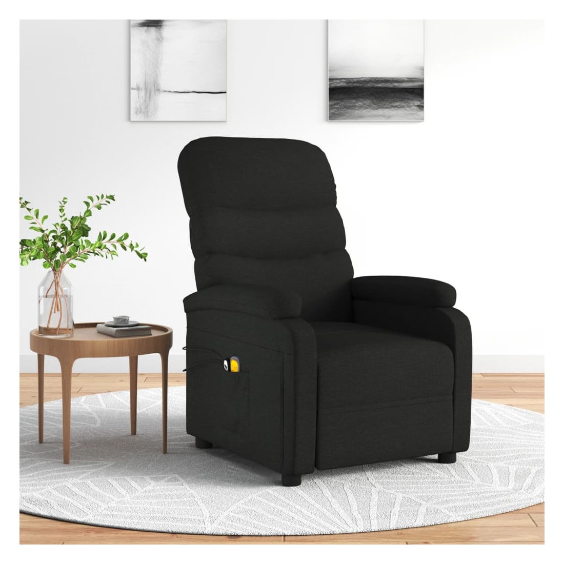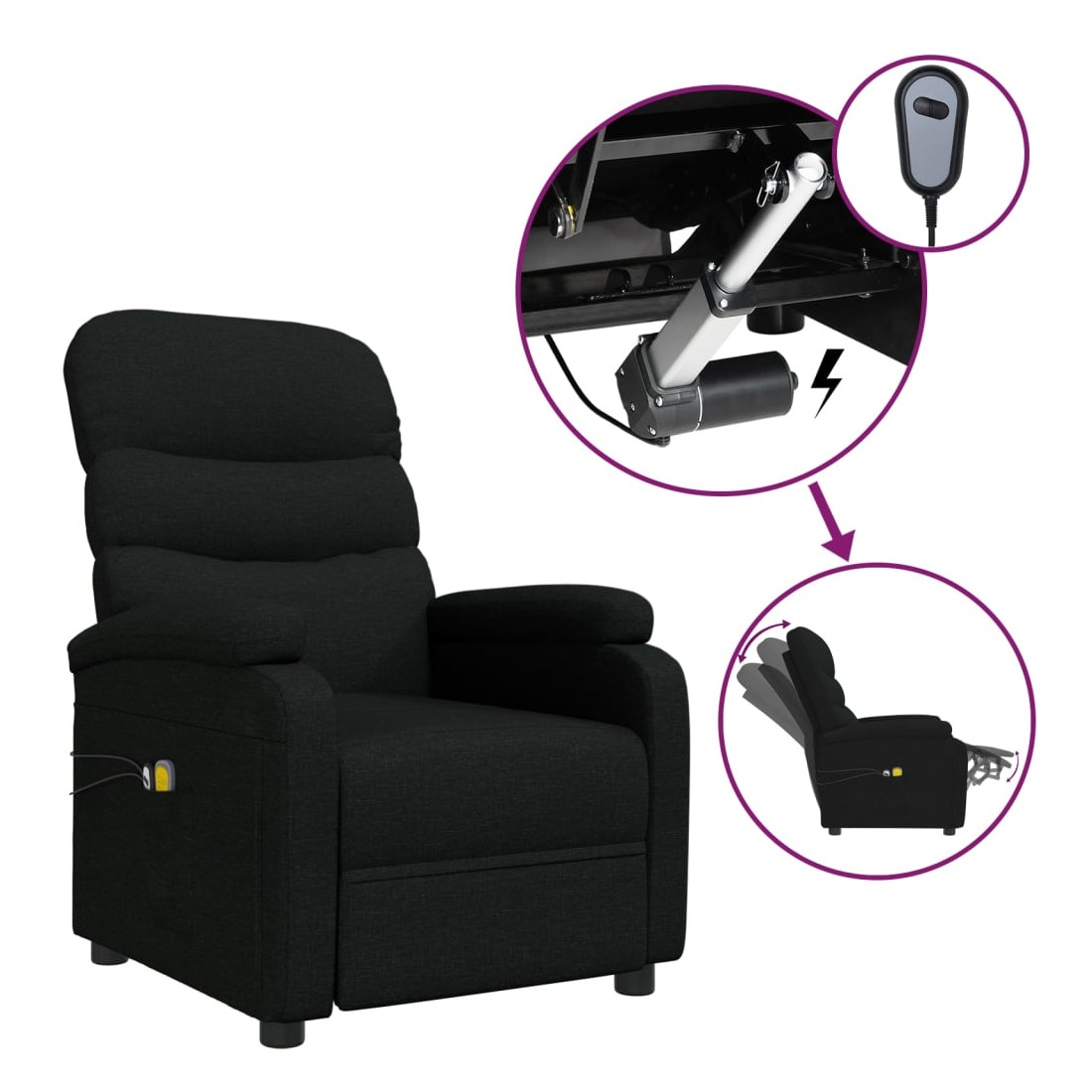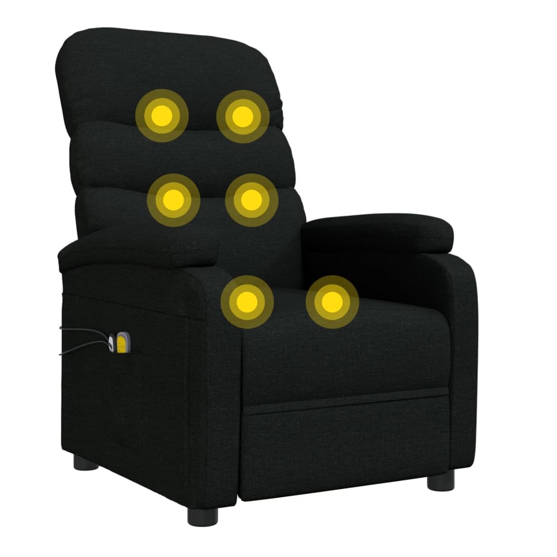 Asseyez-vous et détendez-vous dans ce fauteuil de massage électrique très confortable ! Fonction d'inclinaison électrique : le fauteuil inclinable est équipé d'un moteur électrique pour la fonction d'inclinaison. Il offre 3 positions d'inclinaison et vous pouvez facilement régler le dossier et le repose-pied à l'aide de la commande manuelle à 2 boutons incluse, en fonction de votre confort.Fonction de vibration : les 6 points de massage vous permettent de faire l'expérience d'un massage mieux ciblé. De plus, la télécommande incluse vous permet de choisir différents programmes de massage. La fonction de massage est alimentée par le connecteur USB, mais la source d'alimentation USB 5V certifiée n'est pas incluse.Expérience d'assise confortable : le siège, le dossier et les larges accoudoirs rembourrés épais recouverts de tissu procurent une sensation confortable et chaleureuse, vous permettant de vous sentir enveloppé lorsque vous êtes assis. Le tissu présente un aspect simple et épuré, et est respirant et durable.Cadre solide et stable : le cadre en bois et en métal offre une structure solide et une grande stabilité. Ce fauteuil inclinable est confortable et durable.