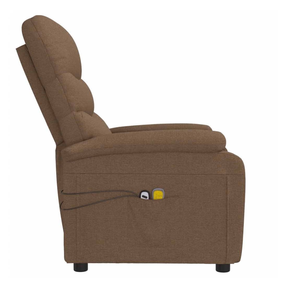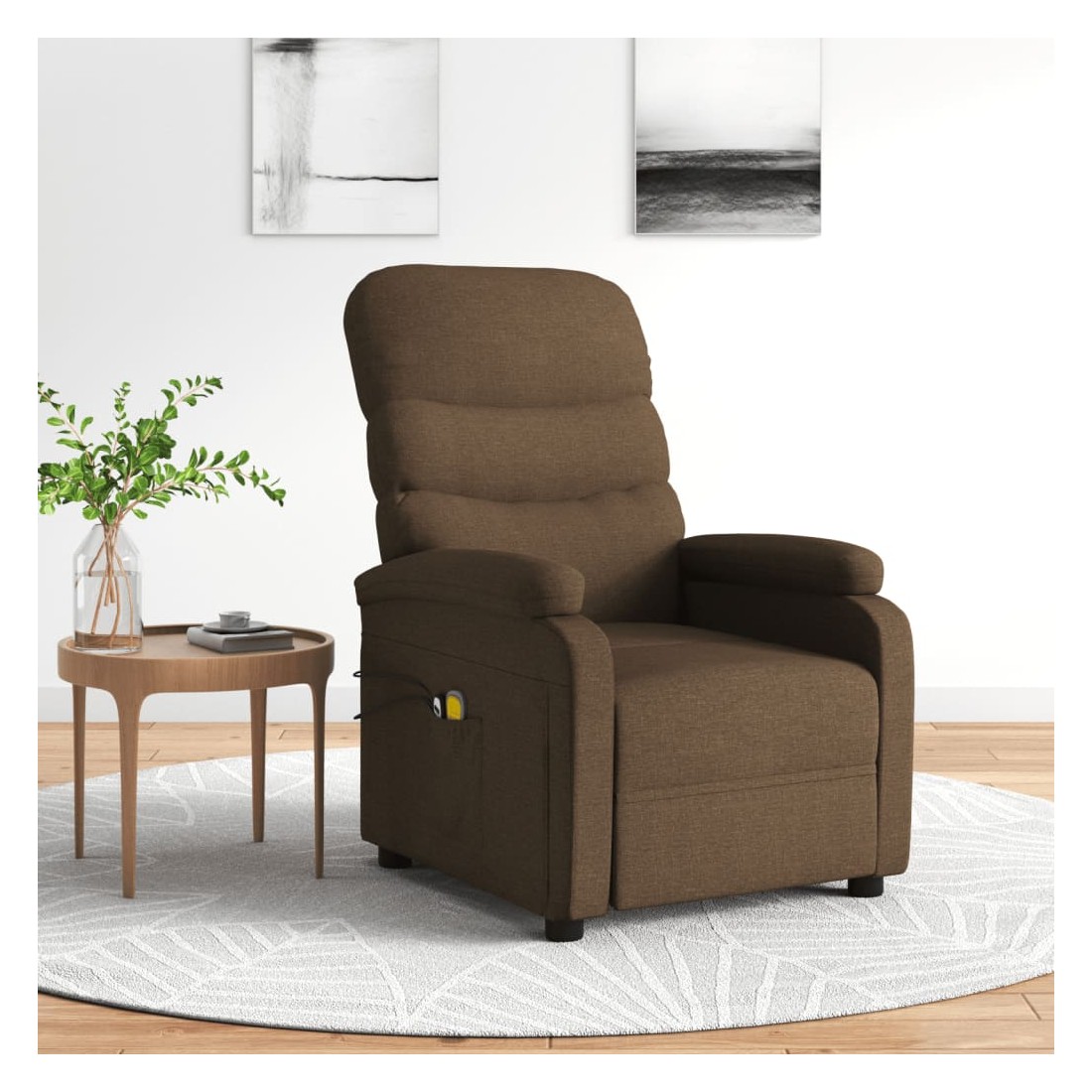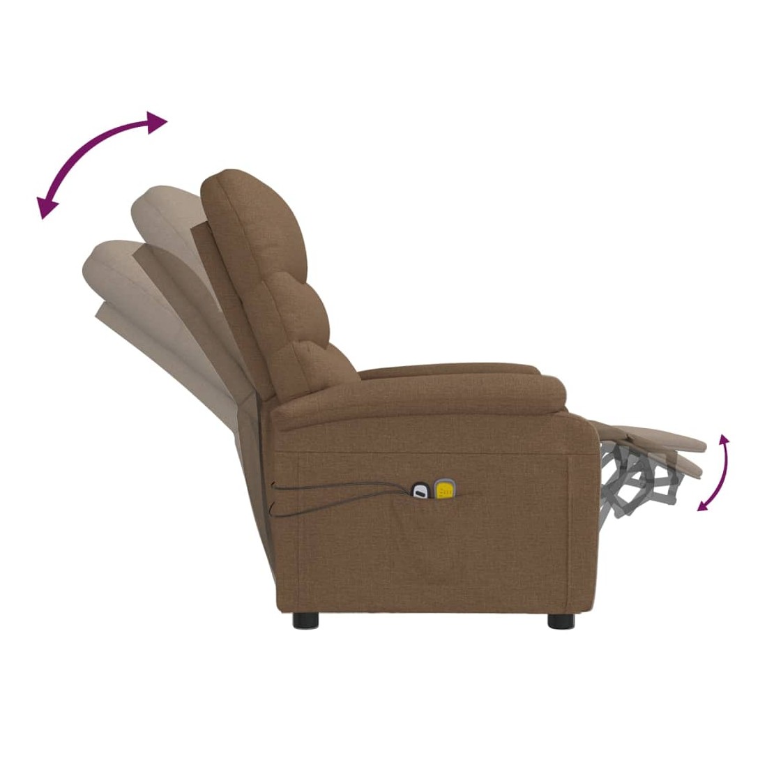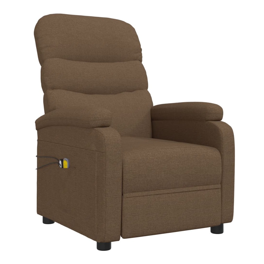 Asseyez-vous et détendez-vous dans ce fauteuil de massage électrique très confortable ! Fonction d'inclinaison électrique : le fauteuil inclinable est équipé d'un moteur électrique pour la fonction d'inclinaison. Il offre 3 positions d'inclinaison et vous pouvez facilement régler le dossier et le repose-pied à l'aide de la commande manuelle à 2 boutons incluse, en fonction de votre confort.Fonction de vibration : les 6 points de massage vous permettent de faire l'expérience d'un massage mieux ciblé. De plus, la télécommande incluse vous permet de choisir différents programmes de massage. La fonction de massage est alimentée par le connecteur USB, mais la source d'alimentation USB 5V certifiée n'est pas incluse.Expérience d'assise confortable : le siège, le dossier et les larges accoudoirs rembourrés épais recouverts de tissu procurent une sensation confortable et chaleureuse, vous permettant de vous sentir enveloppé lorsque vous êtes assis. Le tissu présente un aspect simple et épuré, et est respirant et durable.Cadre solide et stable : le cadre en bois et en métal offre une structure solide et une grande stabilité. Ce fauteuil inclinable est confortable et durable.