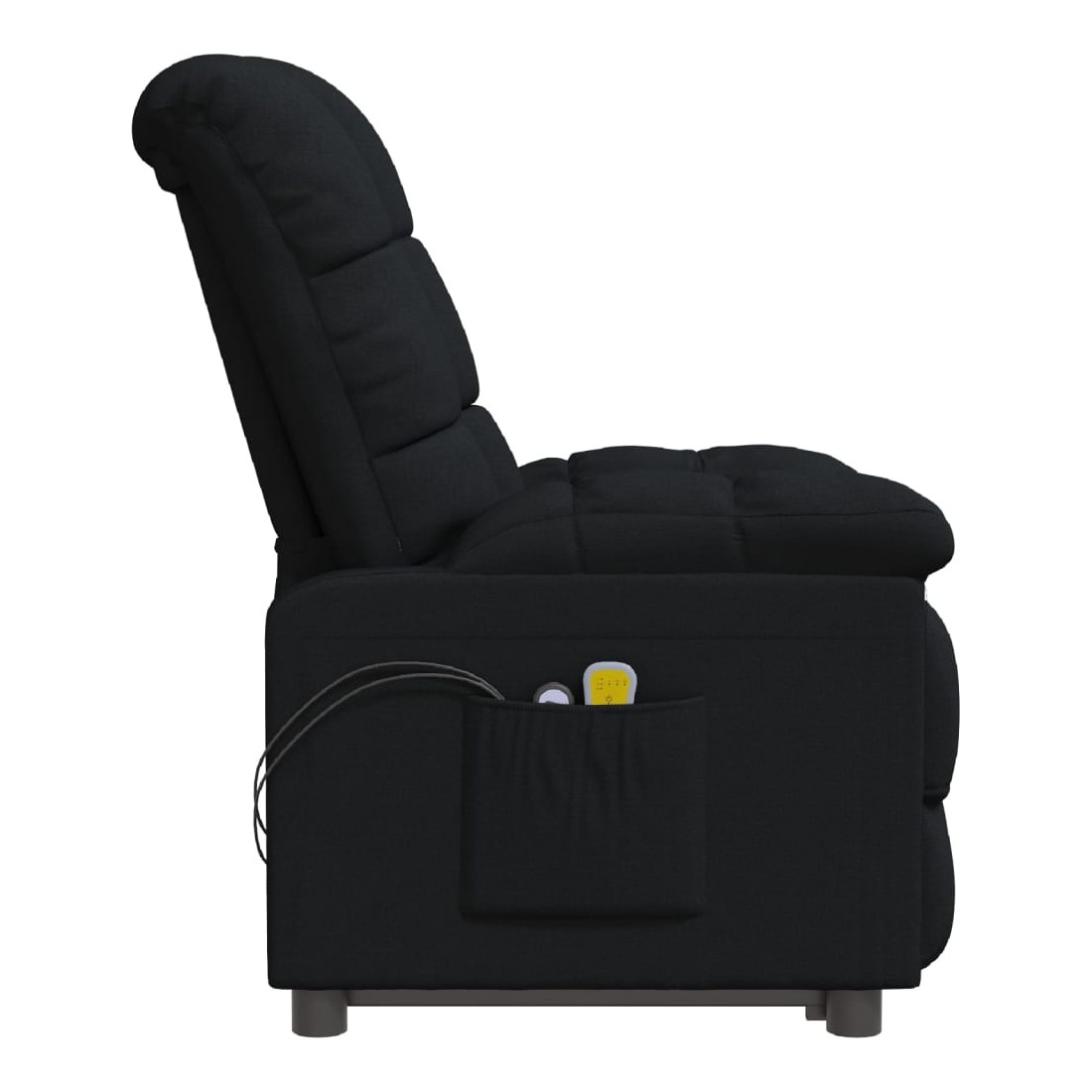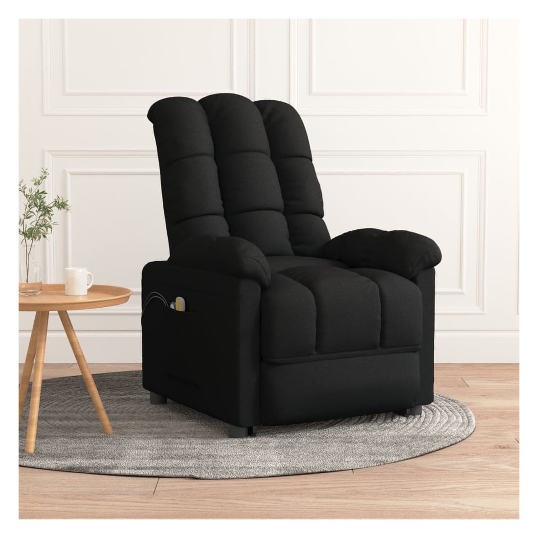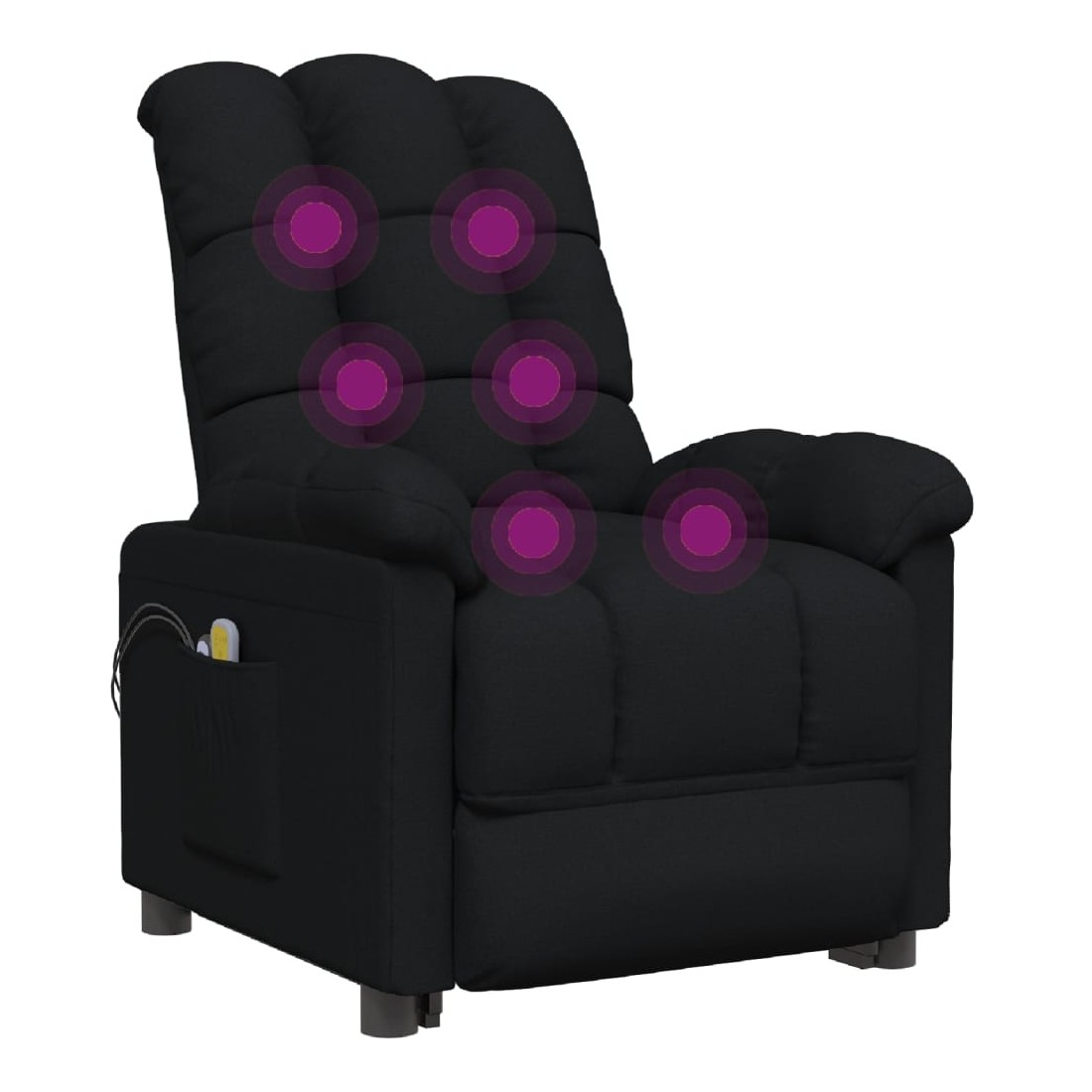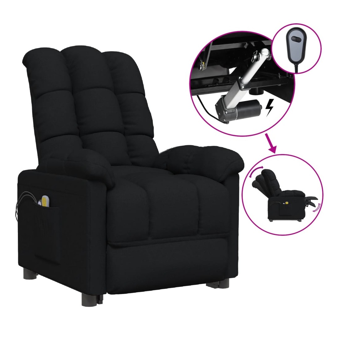 Asseyez-vous et détendez-vous dans ce fauteuil de massage électrique très confortable ! Fonction d'inclinaison électrique : le fauteuil inclinable est équipé d'un moteur électrique pour la fonction d'inclinaison. Il offre 3 positions d'inclinaison et vous pouvez facilement régler le dossier et le repose-pied à l'aide de la commande manuelle à 2 boutons incluse, en fonction de votre confort.Fonction de vibration : les 6 points de massage vous permettent de faire l'expérience d'un massage mieux ciblé. De plus, la télécommande incluse vous permet de choisir différents programmes de massage. La fonction de massage est alimentée par le connecteur USB, mais la source d'alimentation USB 5V certifiée n'est pas incluse.Expérience d'assise confortable : le siège, le dossier et les larges accoudoirs rembourrés épais recouverts de tissu procurent une sensation confortable et chaleureuse, vous permettant de vous sentir enveloppé lorsque vous êtes assis. Le tissu présente un aspect simple et épuré, et est respirant et durable.Cadre solide et stable : le cadre en bois et en métal offre une structure solide et une grande stabilité. Ce fauteuil inclinable est confortable et durable.