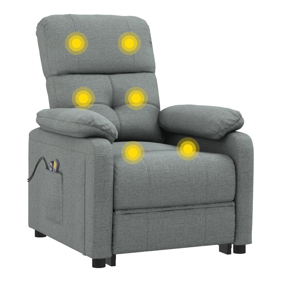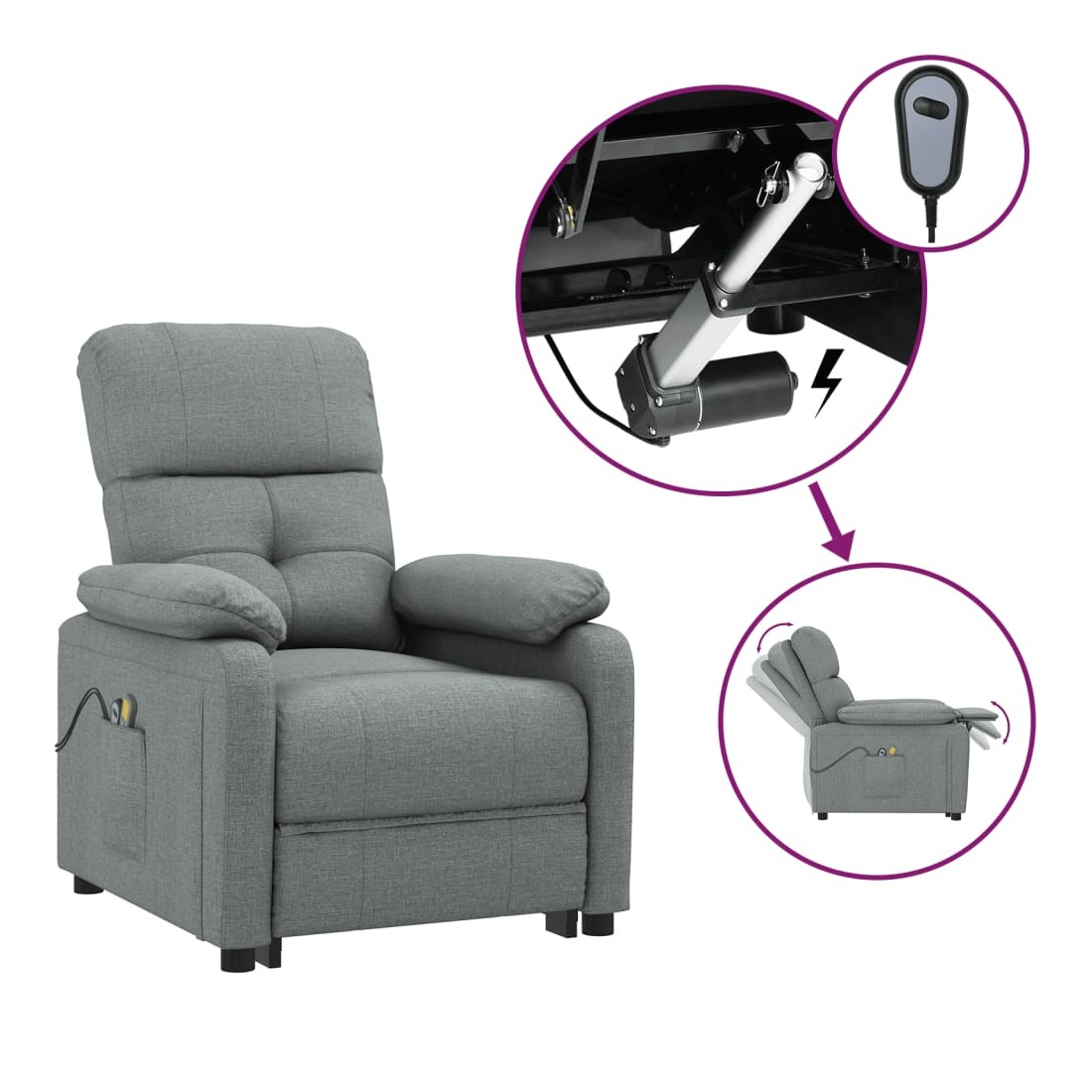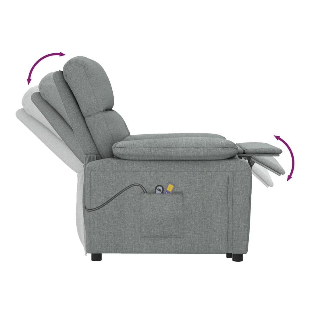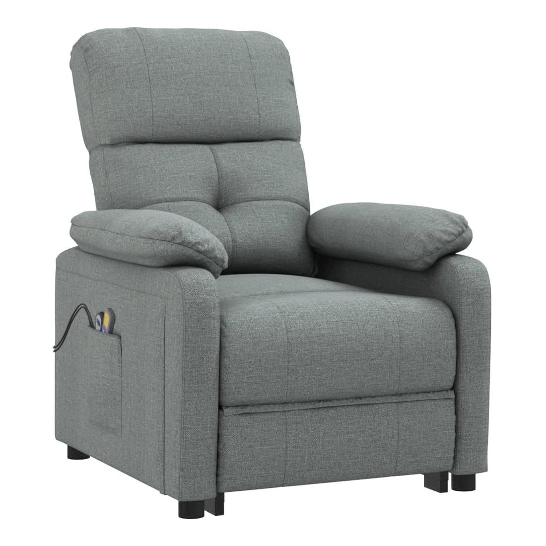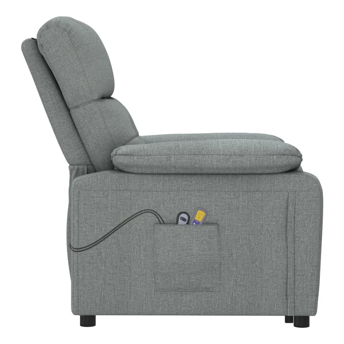 Asseyez-vous et détendez-vous dans ce fauteuil de massage électrique très confortable ! Fonction d'inclinaison électrique : le fauteuil inclinable est équipé d'un moteur électrique pour la fonction d'inclinaison. Il offre 3 positions d'inclinaison et vous pouvez facilement régler le dossier et le repose-pied à l'aide de la commande manuelle à 2 boutons incluse, en fonction de votre confort.Fonction de vibration : les 6 points de massage vous permettent de faire l'expérience d'un massage mieux ciblé. De plus, la télécommande incluse vous permet de choisir différents programmes de massage. La fonction de massage est alimentée par le connecteur USB, mais la source d'alimentation USB 5V certifiée n'est pas incluse.Expérience d'assise confortable : le siège, le dossier et les larges accoudoirs rembourrés épais recouverts de tissu procurent une sensation confortable et chaleureuse, vous permettant de vous sentir enveloppé lorsque vous êtes assis. Le tissu présente un aspect simple et épuré, et est respirant et durable.Cadre solide et stable : le cadre en bois et en métal offre une structure solide et une grande stabilité. Ce fauteuil inclinable est confortable et durable.