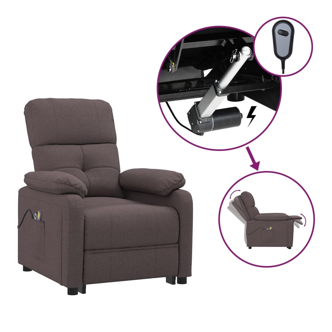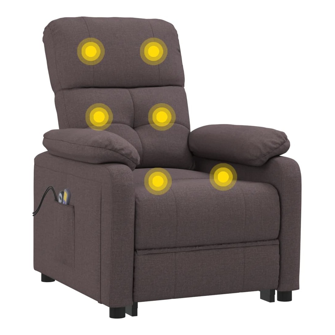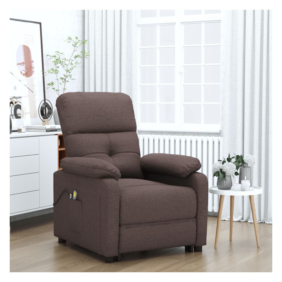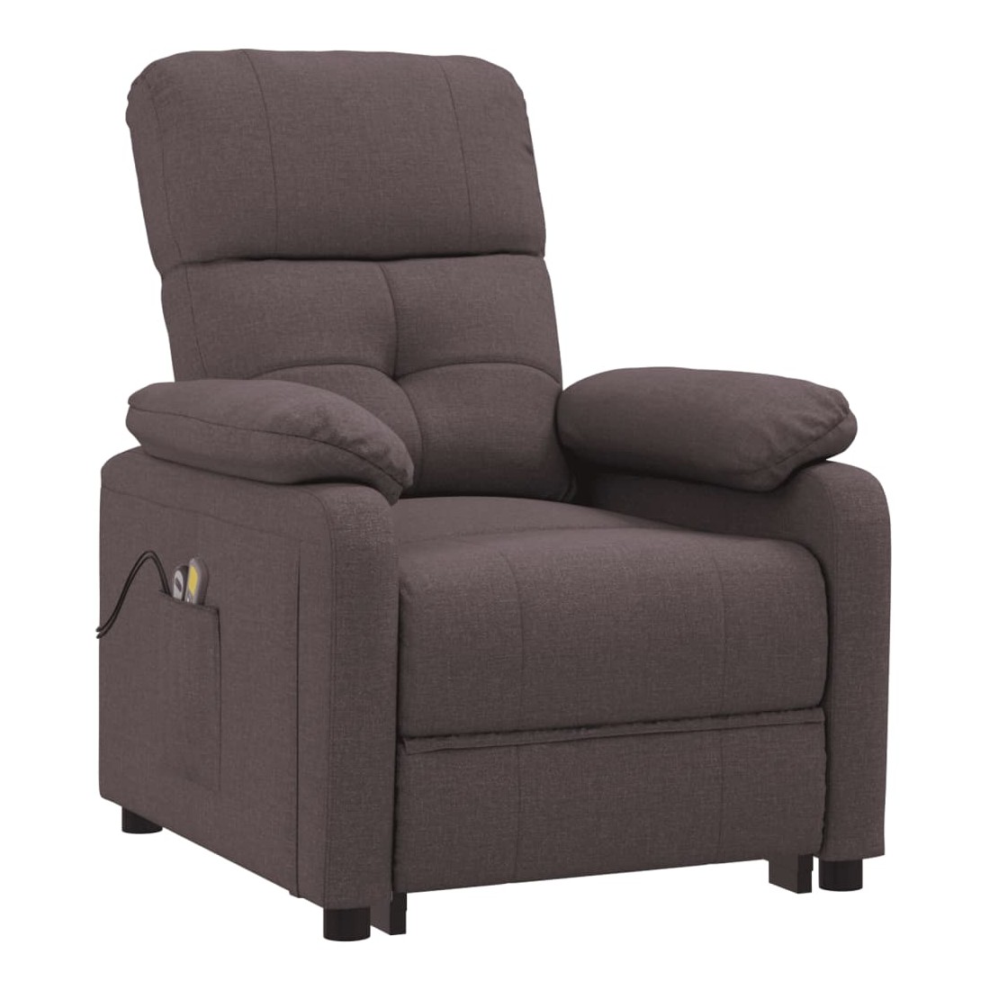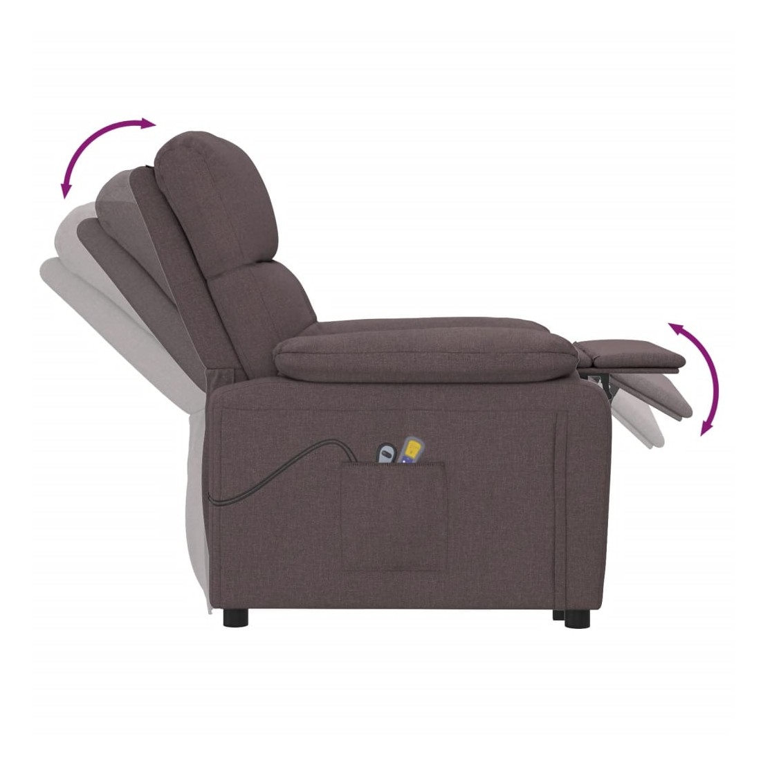 Asseyez-vous et détendez-vous dans ce fauteuil de massage électrique très confortable ! Fonction d'inclinaison électrique : le fauteuil inclinable est équipé d'un moteur électrique pour la fonction d'inclinaison. Il offre 3 positions d'inclinaison et vous pouvez facilement régler le dossier et le repose-pied à l'aide de la commande manuelle à 2 boutons incluse, en fonction de votre confort.Fonction de vibration : les 6 points de massage vous permettent de faire l'expérience d'un massage mieux ciblé. De plus, la télécommande incluse vous permet de choisir différents programmes de massage. La fonction de massage est alimentée par le connecteur USB, mais la source d'alimentation USB 5V certifiée n'est pas incluse.Expérience d'assise confortable : le siège, le dossier et les larges accoudoirs rembourrés épais recouverts de tissu procurent une sensation confortable et chaleureuse, vous permettant de vous sentir enveloppé lorsque vous êtes assis. Le tissu présente un aspect simple et épuré, et est respirant et durable.Cadre solide et stable : le cadre en bois et en métal offre une structure solide et une grande stabilité. Ce fauteuil inclinable est confortable et durable.