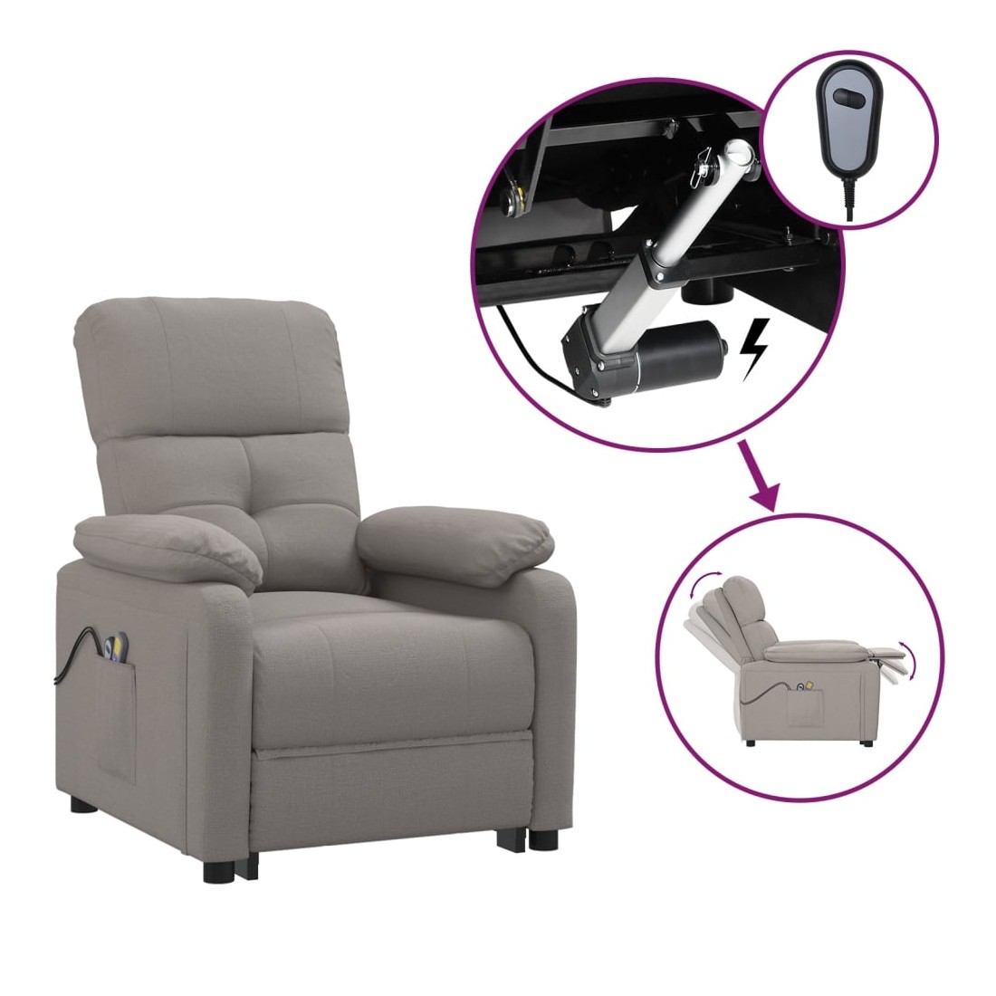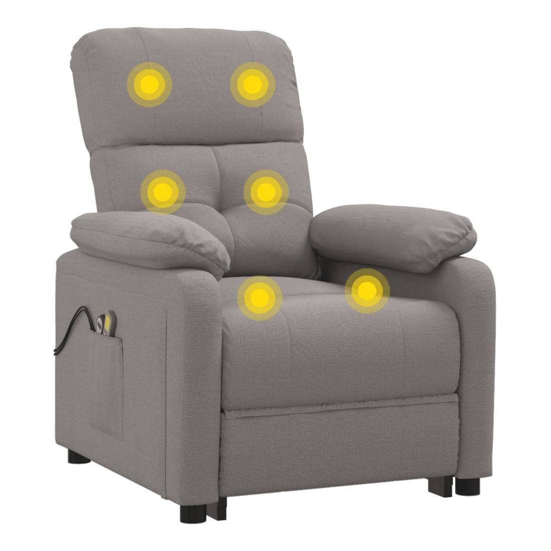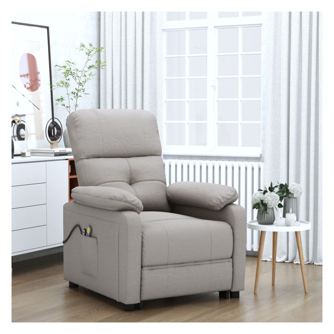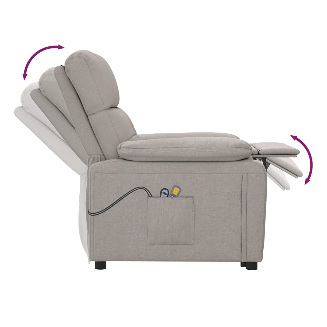 Asseyez-vous et détendez-vous dans ce fauteuil de massage électrique très confortable ! Fonction d'inclinaison électrique : le fauteuil inclinable est équipé d'un moteur électrique pour la fonction d'inclinaison. Il offre 3 positions d'inclinaison et vous pouvez facilement régler le dossier et le repose-pied à l'aide de la commande manuelle à 2 boutons incluse, en fonction de votre confort.Fonction de vibration : les 6 points de massage vous permettent de faire l'expérience d'un massage mieux ciblé. De plus, la télécommande incluse vous permet de choisir différents programmes de massage. La fonction de massage est alimentée par le connecteur USB, mais la source d'alimentation USB 5V certifiée n'est pas incluse.Expérience d'assise confortable : le siège, le dossier et les larges accoudoirs rembourrés épais recouverts de tissu procurent une sensation confortable et chaleureuse, vous permettant de vous sentir enveloppé lorsque vous êtes assis. Le tissu présente un aspect simple et épuré, et est respirant et durable.Cadre solide et stable : le cadre en bois et en métal offre une structure solide et une grande stabilité. Ce fauteuil inclinable est confortable et durable.