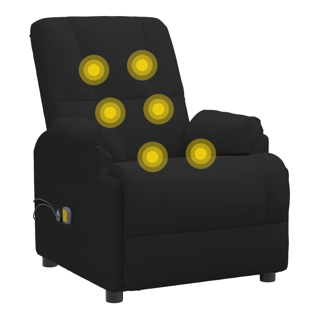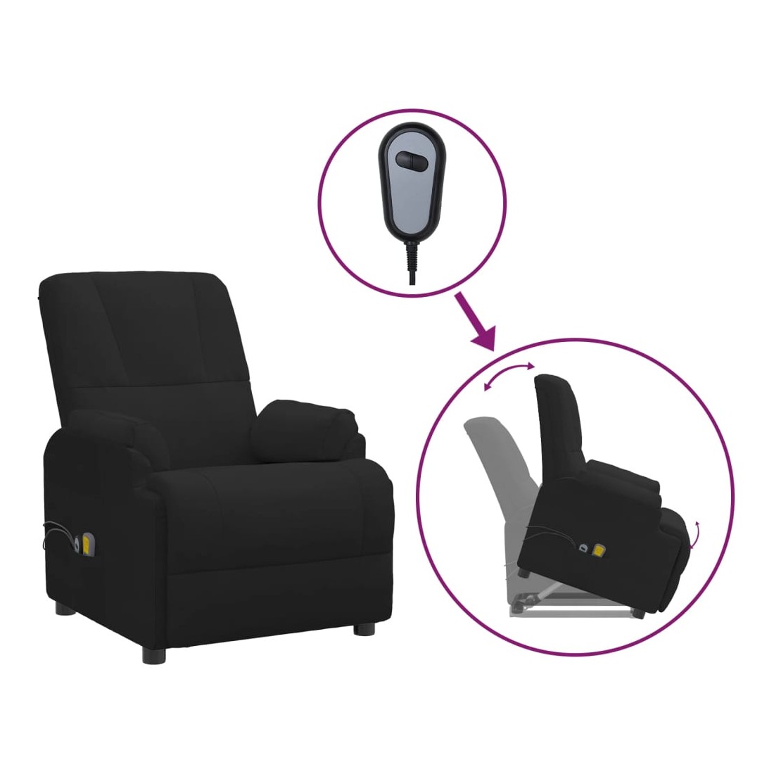 Asseyez-vous et détendez-vous dans ce fauteuil de massage très confortable ! Fonction d'inclinaison manuelle : le fauteuil inclinable est spécialement conçu avec 3 positions d'inclinaison afin que vous puissiez régler manuellement le dossier et le repose-pieds selon votre confort.Fonction de levage électrique : ce fauteuil inclinable pour personnes âgées est équipé d'un moteur électrique pour la fonction de levage. Grâce à la fonction qui pousse toute la chaise vers le haut, vous pouvez facilement vous tenir debout sans stresser votre dos et vos genoux grâce à la commande manuelle à 2 boutons.Fonction de vibration : les 6 points de massage vous permettent de faire l'expérience d'un massage mieux ciblé. De plus, la télécommande incluse vous permet de choisir différents programmes de massage. La fonction de massage est alimentée par le connecteur USB, mais la source d'alimentation USB 5V certifiée n'est pas incluse.Expérience de siège confortable : le siège, le dossier et les larges accoudoirs bien rembourrés recouverts de similicuir daim offrent une sensation confortable et chaleureuse, vous faisant vous sentir enlacé lorsque vous êtes assis. Le similicuir daim est composé de fibres ultra-fines, particulièrement résistantes aux taches. Le similicuir daim est un excellent choix pour le rembourrage des meubles en raison de sa durabilité et de son nettoyage facile.Cadre solide et stable : le cadre en bois et en métal offre une structure solide et une grande stabilité. Ce fauteuil inclinable est confortable et durable.