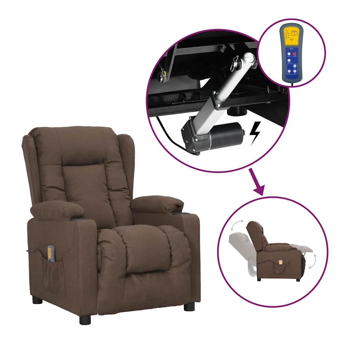 Asseyez-vous et détendez-vous dans ce fauteuil de massage très confortable ! Fonction d'inclinaison manuelle : le fauteuil inclinable est spécialement conçu avec 3 positions d'inclinaison afin que vous puissiez régler manuellement le dossier et le repose-pieds selon votre confort.Fonction de levage électrique : ce fauteuil inclinable pour personnes âgées est équipé d'un moteur électrique pour la fonction de levage. Grâce à la fonction qui pousse toute la chaise vers le haut, vous pouvez facilement vous tenir debout sans stresser votre dos et vos genoux grâce à la commande manuelle à 2 boutons.Fonction de vibration : les 6 points de massage proposés te permettent de bénéficier d'un massage mieux ciblé. De plus, la commande manuelle incluse te permet de choisir différents programmes de massage. La fonction de massage est alimentée par le connecteur USB, mais la source d'alimentation USB 5 V certifiée n'est pas incluse.Expérience d'assise confortable : le siège, le dossier et les larges accoudoirs rembourrés épais recouverts de tissu procurent une sensation confortable et chaleureuse, vous permettant de vous sentir enveloppé lorsque vous êtes assis. Le tissu présente un aspect simple et épuré, et est respirant et durable.Cadre solide et stable : le cadre en bois et en métal offre une structure solide et une grande stabilité. Ce fauteuil inclinable est confortable et durable.