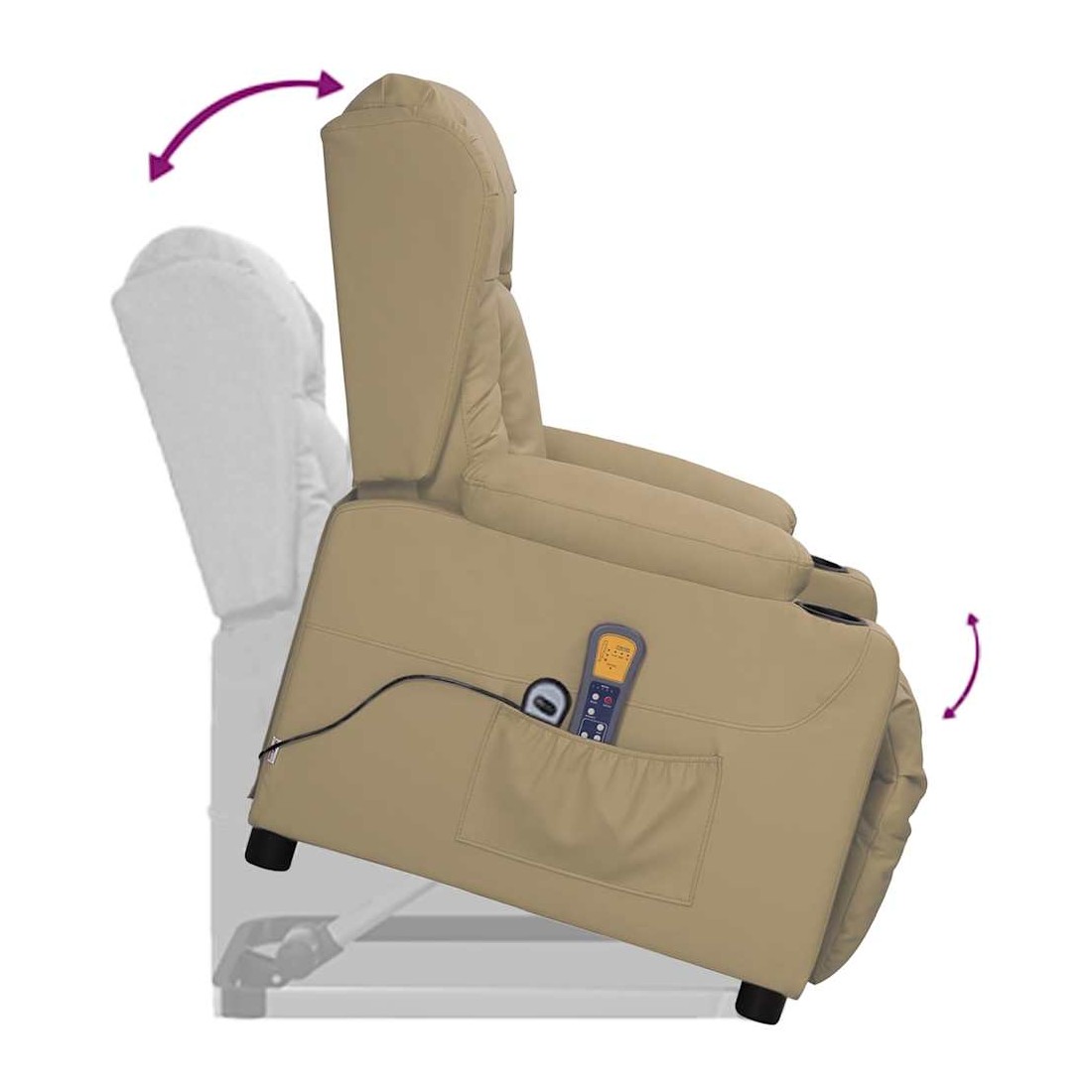 Asseyez-vous et détendez-vous dans ce fauteuil de massage très confortable ! Fonction d'inclinaison manuelle : le fauteuil inclinable est spécialement conçu avec 3 positions d'inclinaison afin que vous puissiez régler manuellement le dossier et le repose-pieds selon votre confort.Fonction de levage électrique : ce fauteuil inclinable pour personnes âgées est équipé d'un moteur électrique pour la fonction de levage. Grâce à la fonction qui pousse toute la chaise vers le haut, vous pouvez facilement vous tenir debout sans stresser votre dos et vos genoux grâce à la commande manuelle à 2 boutons.Fonction de vibration : les 6 points de massage proposés te permettent de bénéficier d'un massage mieux ciblé. De plus, la commande manuelle incluse te permet de choisir différents programmes de massage. La fonction de massage est alimentée par le connecteur USB, mais la source d'alimentation USB 5 V certifiée n'est pas incluse.Expérience de siège confortable : le siège, le dossier et les larges accoudoirs rembourrés épais recouverts de similicuir procurent une sensation confortable et chaleureuse, vous faisant vous sentir enlacé lorsque vous êtes assis. Le simili cuir est un matériau très résistant. Il est résistant aux taches, ce qui le rend facile à nettoyer avec un chiffon humide. La surface lisse donne également un aspect luxueux et la beauté du cuir véritable.Cadre solide et stable : le cadre en bois et en métal offre une structure solide et une grande stabilité. Ce fauteuil inclinable est confortable et durable.