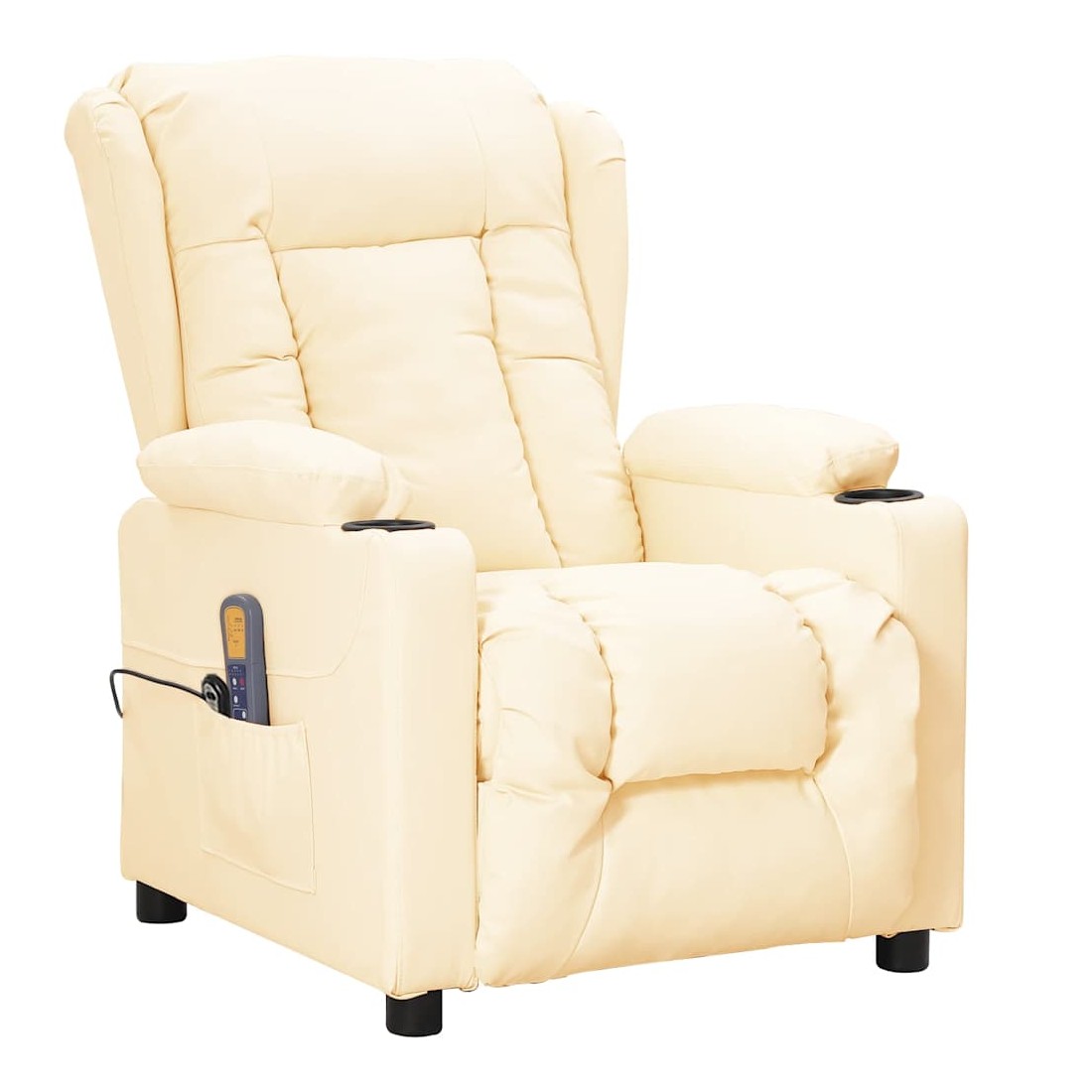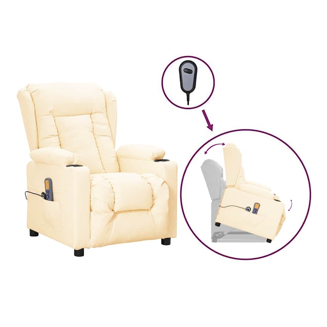 Asseyez-vous et détendez-vous dans ce fauteuil de massage très confortable ! Fonction d'inclinaison manuelle : le fauteuil inclinable est spécialement conçu avec 3 positions d'inclinaison afin que vous puissiez régler manuellement le dossier et le repose-pieds selon votre confort.Fonction de levage électrique : ce fauteuil inclinable pour personnes âgées est équipé d'un moteur électrique pour la fonction de levage. Grâce à la fonction qui pousse toute la chaise vers le haut, vous pouvez facilement vous tenir debout sans stresser votre dos et vos genoux grâce à la commande manuelle à 2 boutons.Fonction de vibration : les 6 points de massage proposés te permettent de bénéficier d'un massage mieux ciblé. De plus, la commande manuelle incluse te permet de choisir différents programmes de massage. La fonction de massage est alimentée par le connecteur USB, mais la source d'alimentation USB 5 V certifiée n'est pas incluse.Expérience de siège confortable : le siège, le dossier et les larges accoudoirs rembourrés épais recouverts de similicuir procurent une sensation confortable et chaleureuse, vous faisant vous sentir enlacé lorsque vous êtes assis. Le simili cuir est un matériau très résistant. Il est résistant aux taches, ce qui le rend facile à nettoyer avec un chiffon humide. La surface lisse donne également un aspect luxueux et la beauté du cuir véritable.Cadre solide et stable : le cadre en bois et en métal offre une structure solide et une grande stabilité. Ce fauteuil inclinable est confortable et durable.