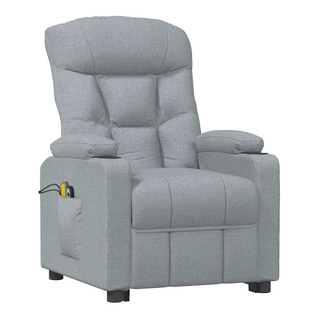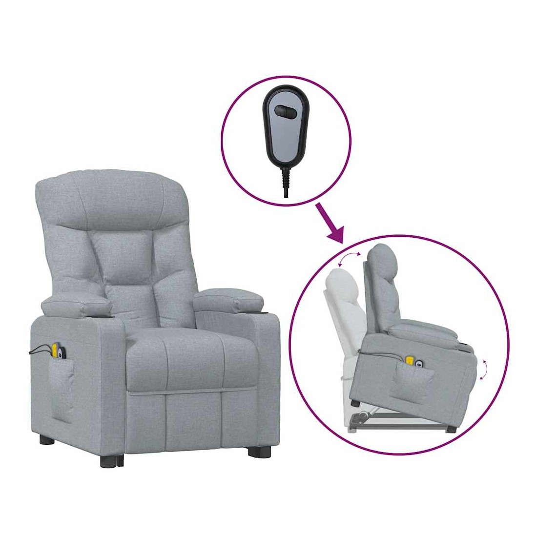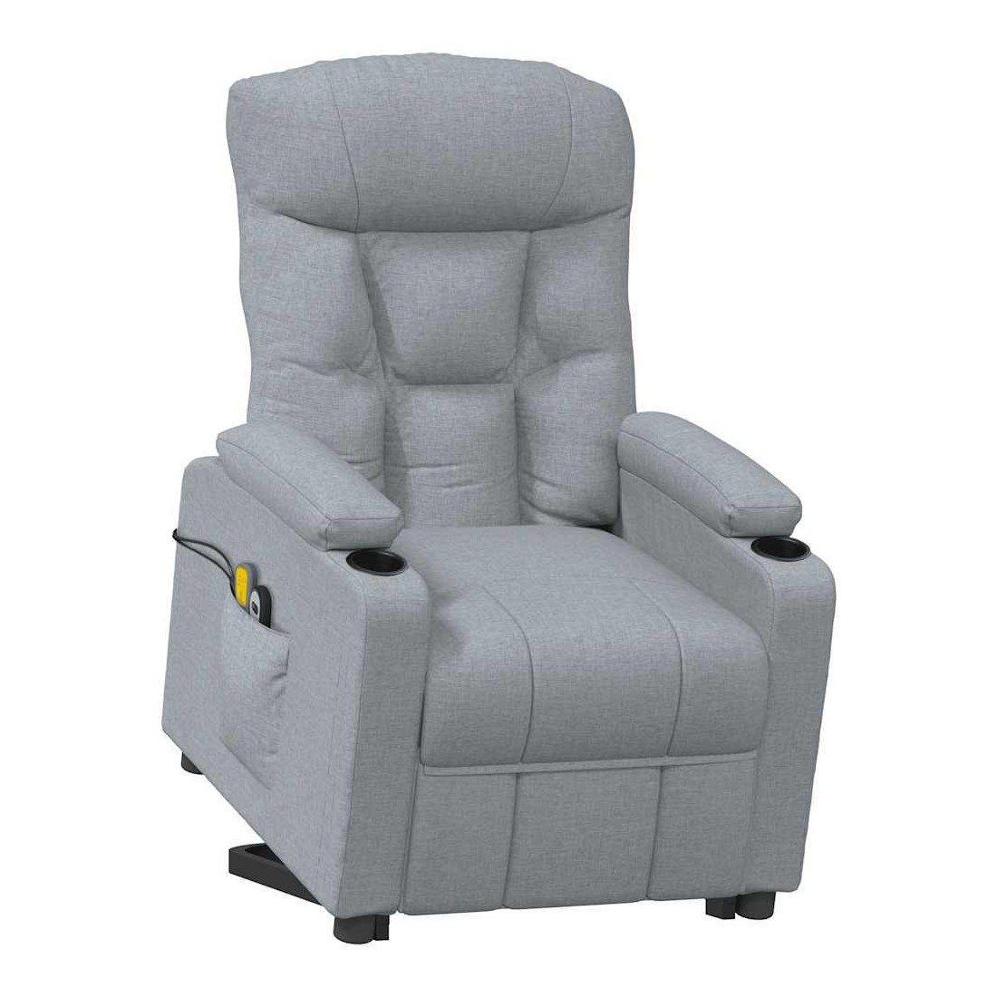 Asseyez-vous et détendez-vous dans ce fauteuil de massage très confortable ! Fonction d'inclinaison manuelle : le fauteuil inclinable est spécialement conçu avec 3 positions d'inclinaison afin que vous puissiez régler manuellement le dossier et le repose-pieds selon votre confort.Fonction de levage électrique : ce fauteuil inclinable pour personnes âgées est équipé d'un moteur électrique pour la fonction de levage. Grâce à la fonction qui pousse toute la chaise vers le haut, vous pouvez facilement vous tenir debout sans stresser votre dos et vos genoux grâce à la commande manuelle à 2 boutons.Fonction de vibration : les 6 points de massage vous permettent de faire l'expérience d'un massage mieux ciblé. De plus, la télécommande incluse vous permet de choisir différents programmes de massage. La fonction de massage est alimentée par le connecteur USB, mais la source d'alimentation USB 5V certifiée n'est pas incluse.Expérience d'assise confortable : le siège, le dossier et les larges accoudoirs rembourrés épais recouverts de tissu procurent une sensation confortable et chaleureuse, vous permettant de vous sentir enveloppé lorsque vous êtes assis. Le tissu présente un aspect simple et épuré, et est respirant et durable.Cadre solide et stable : le cadre en bois et en métal offre une structure solide et une grande stabilité. Ce fauteuil inclinable est confortable et durable.