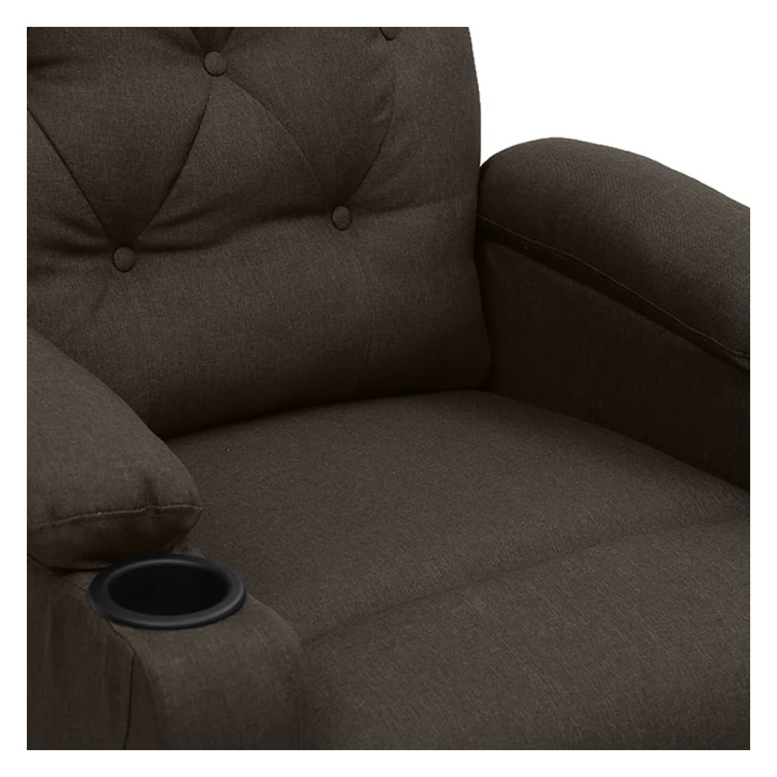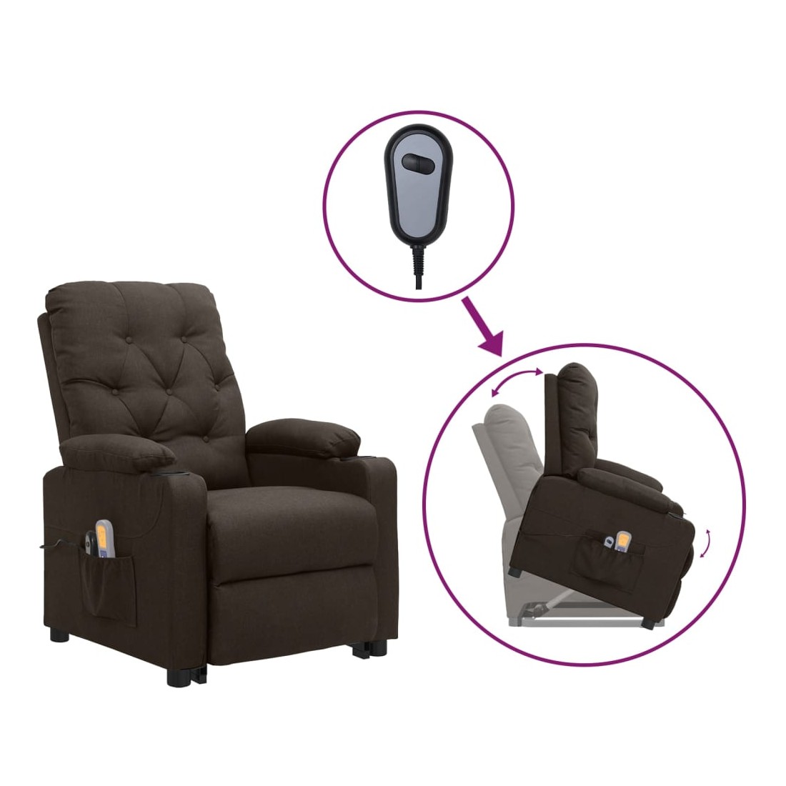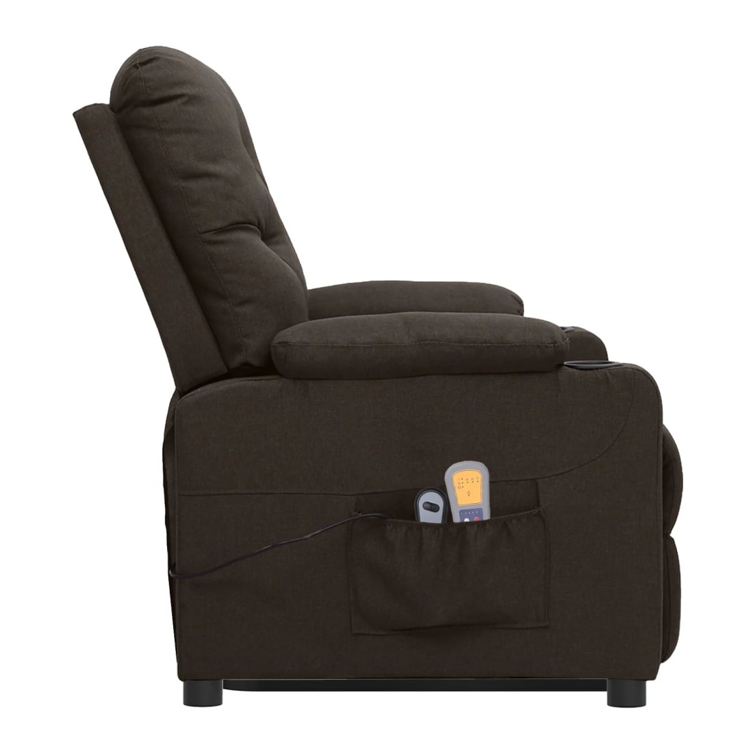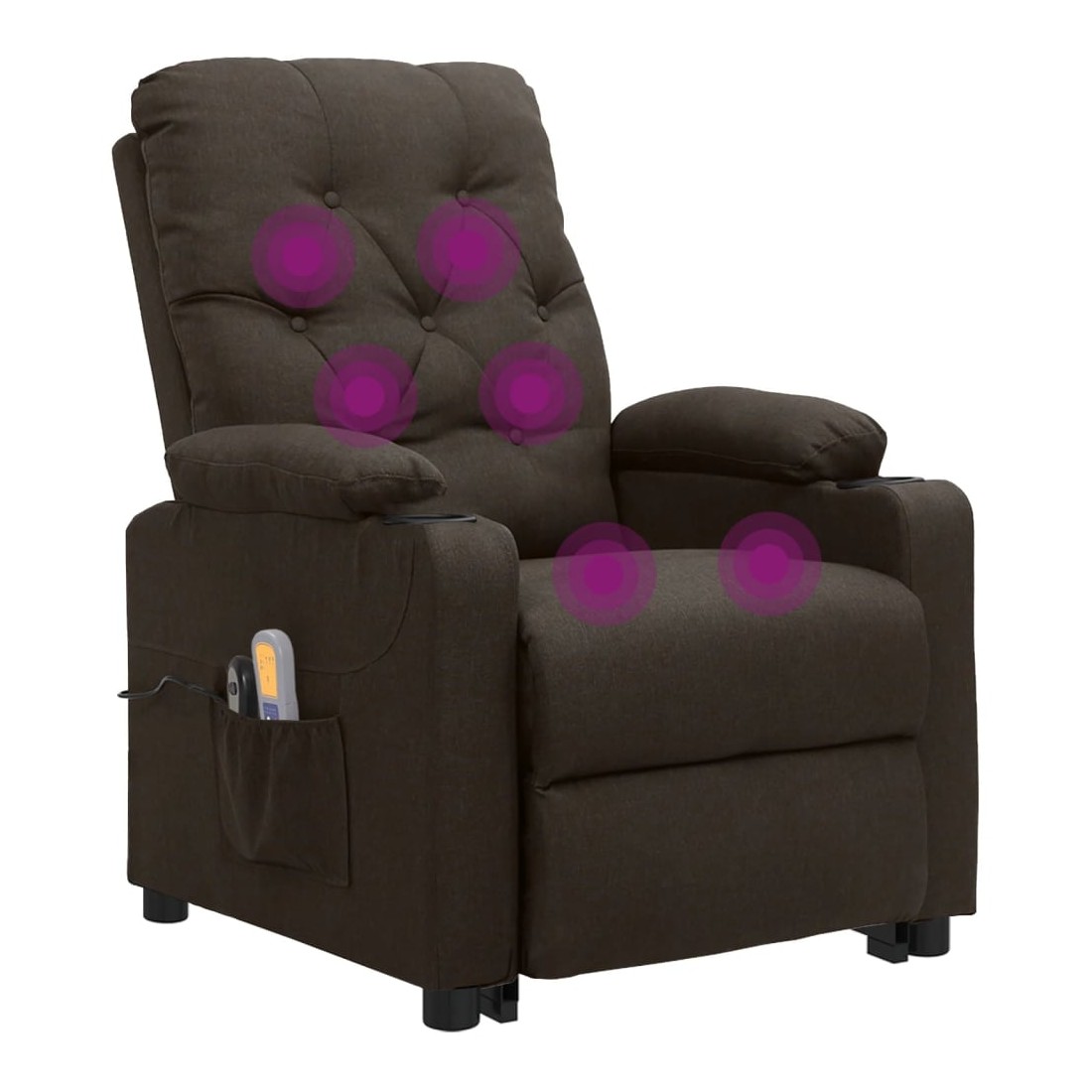 Asseyez-vous et détendez-vous dans ce fauteuil de massage très confortable ! Fonction d'inclinaison manuelle : le fauteuil inclinable est spécialement conçu avec 3 positions d'inclinaison afin que vous puissiez régler manuellement le dossier et le repose-pieds selon votre confort.Fonction de levage électrique : ce fauteuil inclinable pour personnes âgées est équipé d'un moteur électrique pour la fonction de levage. Grâce à la fonction qui pousse toute la chaise vers le haut, vous pouvez facilement vous tenir debout sans stresser votre dos et vos genoux grâce à la commande manuelle à 2 boutons.Fonction de vibration : les 6 points de massage vous permettent de faire l'expérience d'un massage mieux ciblé. De plus, la télécommande incluse vous permet de choisir différents programmes de massage. La fonction de massage est alimentée par le connecteur USB, mais la source d'alimentation USB 5V certifiée n'est pas incluse.Expérience d'assise confortable : le siège, le dossier et les larges accoudoirs rembourrés épais recouverts de tissu procurent une sensation confortable et chaleureuse, vous permettant de vous sentir enveloppé lorsque vous êtes assis. Le tissu présente un aspect simple et épuré, et est respirant et durable.Cadre solide et stable : le cadre en bois et en métal offre une structure solide et une grande stabilité. Ce fauteuil inclinable est confortable et durable.