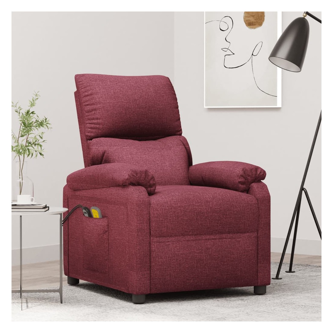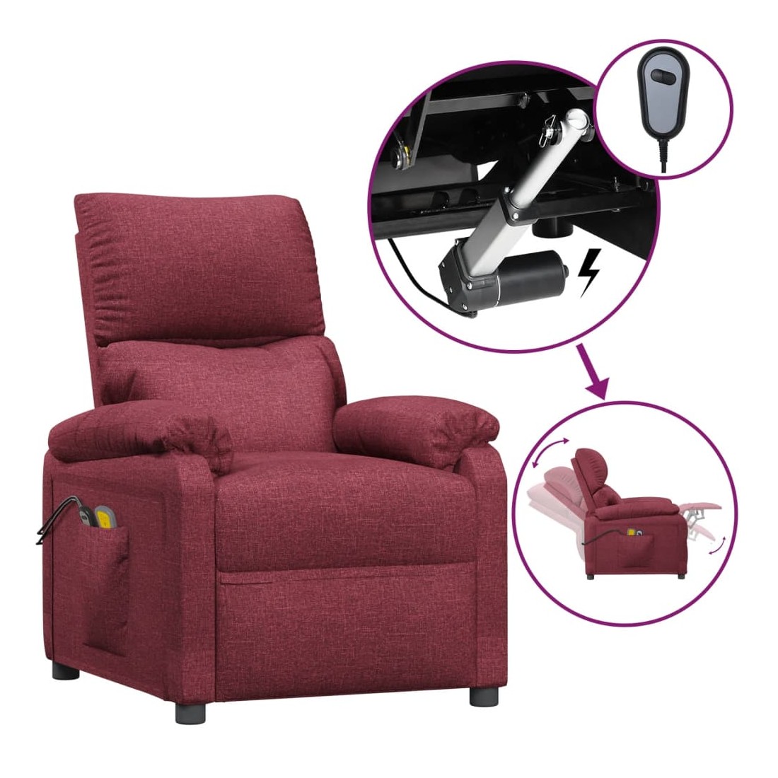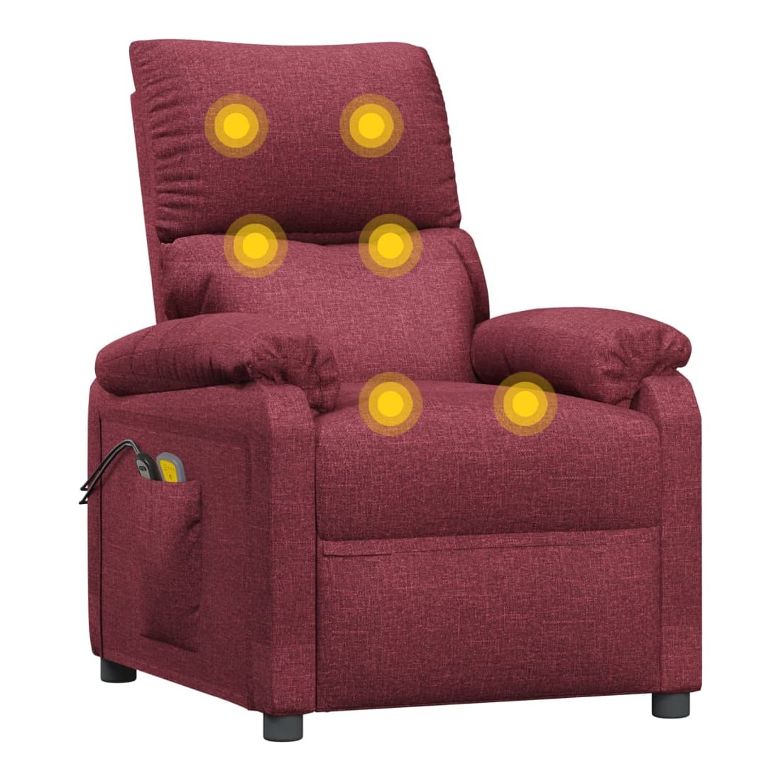 Asseyez-vous et détendez-vous dans ce fauteuil de massage électrique très confortable ! Fonction d'inclinaison électrique : le fauteuil inclinable est équipé d'un moteur électrique pour la fonction d'inclinaison. Il offre 3 positions d'inclinaison et vous pouvez facilement régler le dossier et le repose-pied à l'aide de la commande manuelle à 2 boutons incluse, en fonction de votre confort.Fonction de vibration : les 6 points de massage vous permettent de faire l'expérience d'un massage mieux ciblé. De plus, la télécommande incluse vous permet de choisir différents programmes de massage. La fonction de massage est alimentée par le connecteur USB, mais la source d'alimentation USB 5V certifiée n'est pas incluse.Expérience d'assise confortable : le siège, le dossier et les larges accoudoirs rembourrés épais recouverts de tissu procurent une sensation confortable et chaleureuse, vous permettant de vous sentir enveloppé lorsque vous êtes assis. Le tissu présente un aspect simple et épuré, et est respirant et durable.Cadre solide et stable : le cadre en bois et en métal offre une structure solide et une grande stabilité. Ce fauteuil inclinable est confortable et durable.