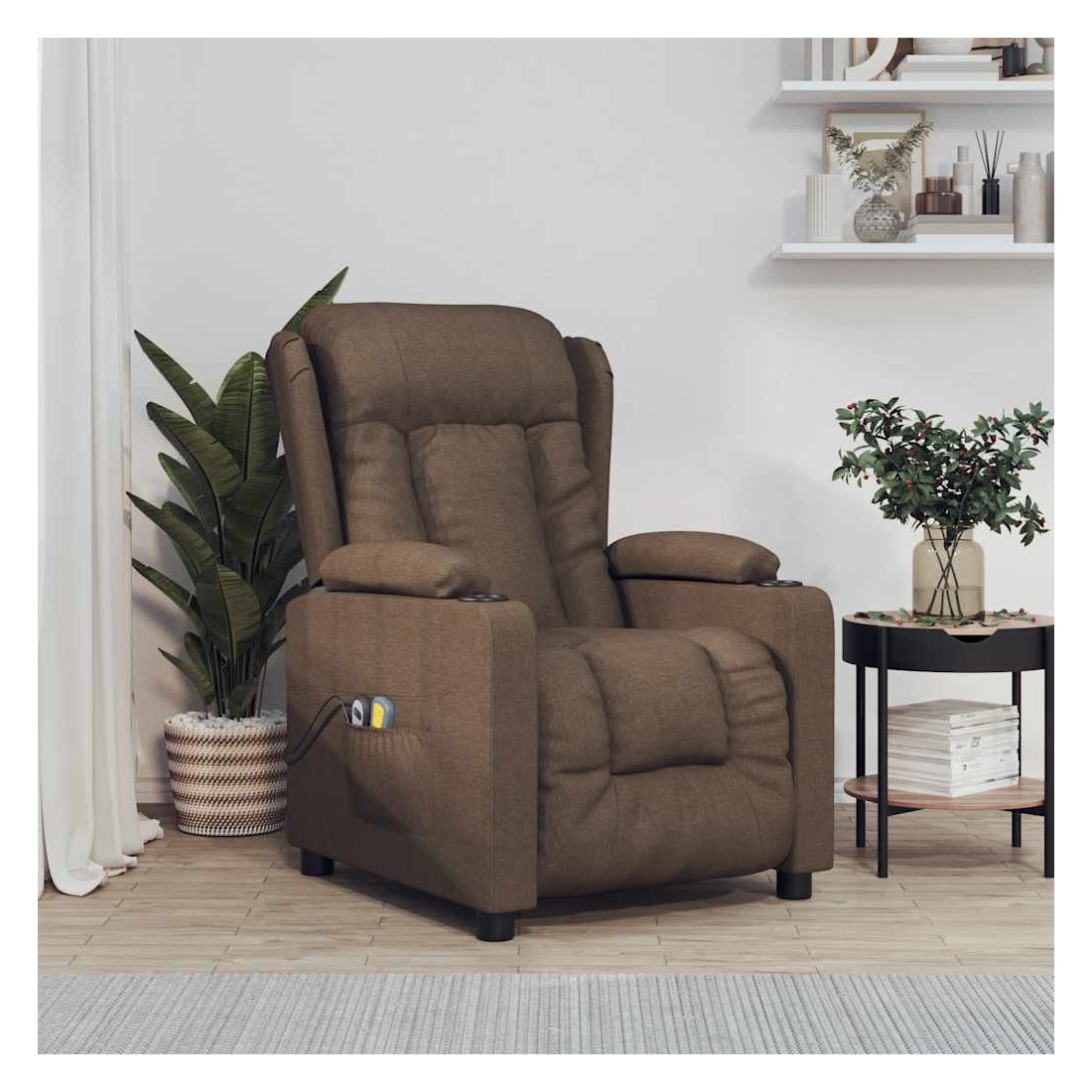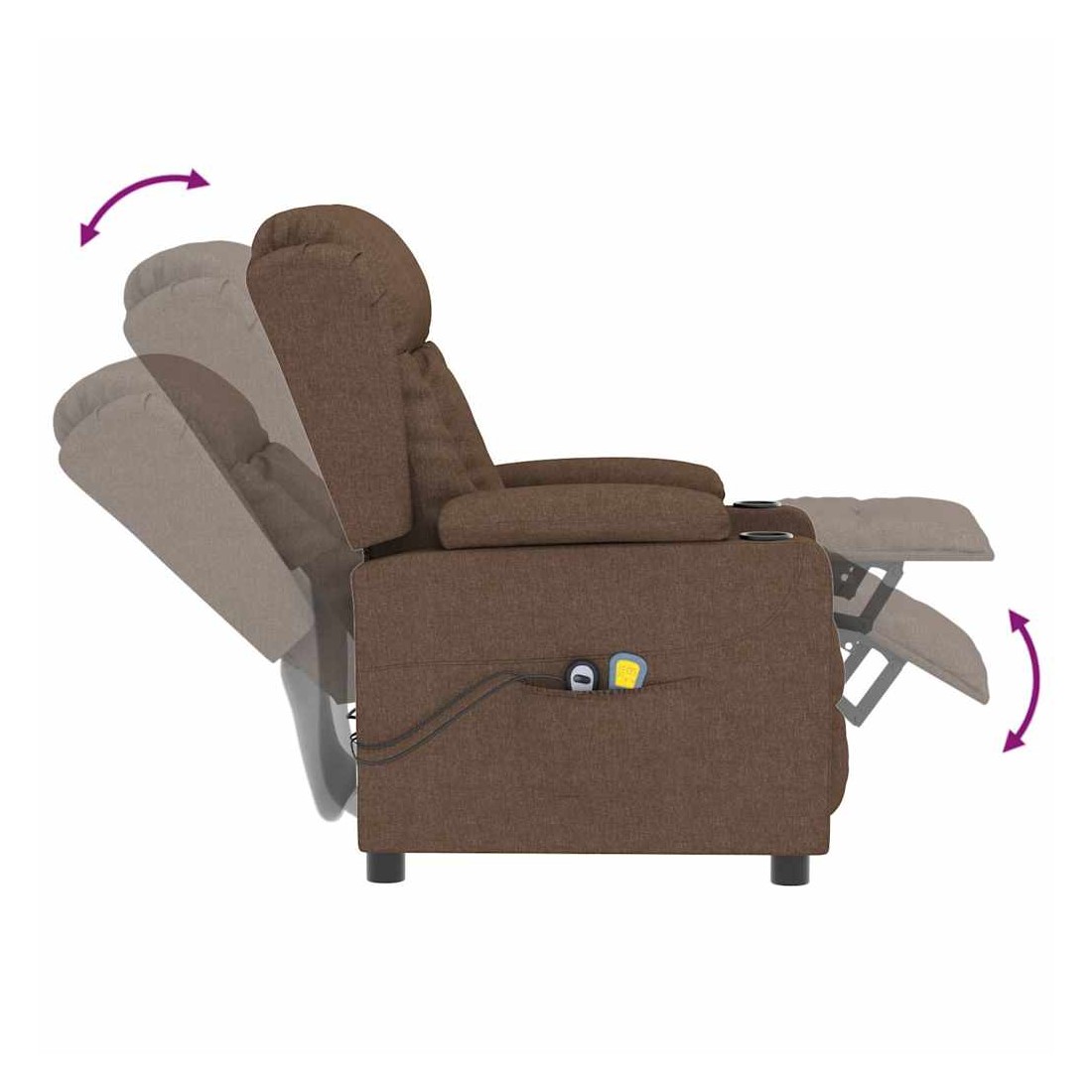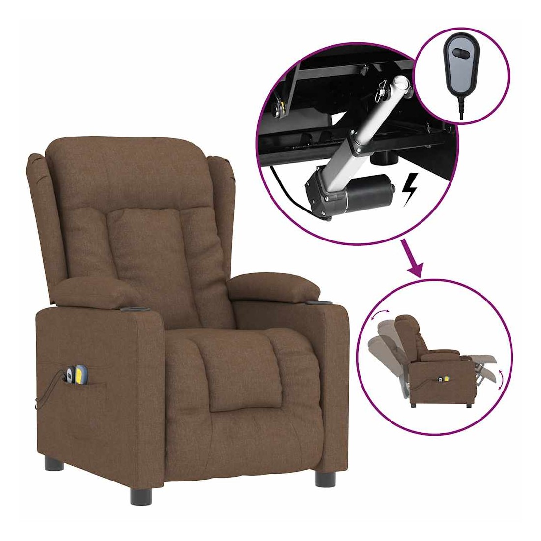 Asseyez-vous et détendez-vous dans ce fauteuil de massage électrique très confortable ! Fonction d'inclinaison électrique : le fauteuil inclinable est équipé d'un moteur électrique pour la fonction d'inclinaison. Il offre 3 positions d'inclinaison et vous pouvez facilement régler le dossier et le repose-pied à l'aide de la commande manuelle à 2 boutons incluse, en fonction de votre confort.Fonction de vibration : les 6 points de massage proposés te permettent de bénéficier d'un massage mieux ciblé. De plus, la commande manuelle incluse te permet de choisir différents programmes de massage. La fonction de massage est alimentée par le connecteur USB, mais la source d'alimentation USB 5 V certifiée n'est pas incluse.Expérience d'assise confortable : le siège, le dossier et les larges accoudoirs rembourrés épais recouverts de tissu procurent une sensation confortable et chaleureuse, vous permettant de vous sentir enveloppé lorsque vous êtes assis. Le tissu présente un aspect simple et épuré, et est respirant et durable.Cadre solide et stable : le cadre en bois et en métal offre une structure solide et une grande stabilité. Ce fauteuil inclinable est confortable et durable.
