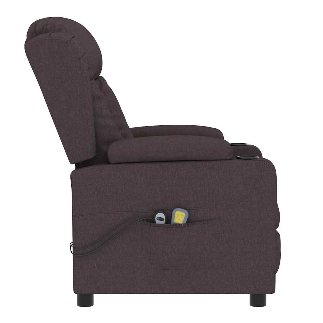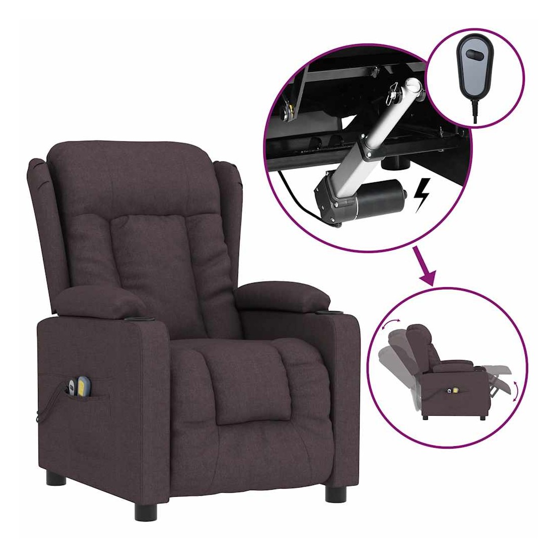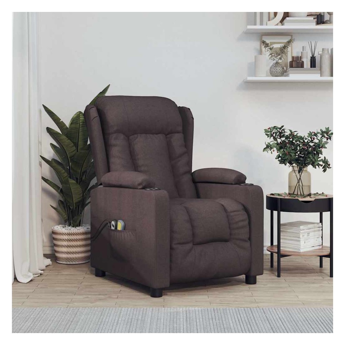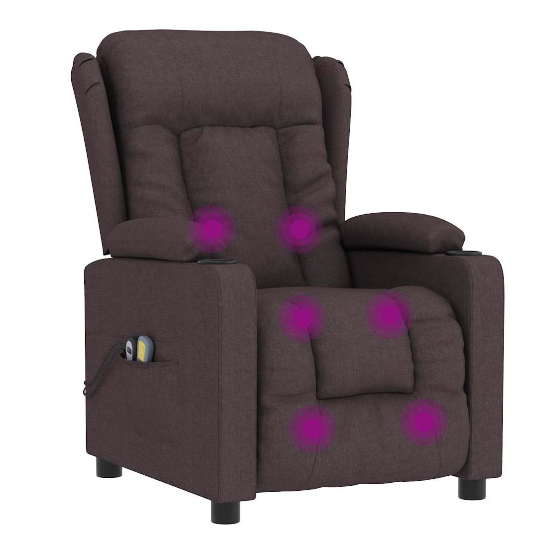 Asseyez-vous et détendez-vous dans ce fauteuil de massage électrique très confortable ! Fonction d'inclinaison électrique : le fauteuil inclinable est équipé d'un moteur électrique pour la fonction d'inclinaison. Il offre 3 positions d'inclinaison et vous pouvez facilement régler le dossier et le repose-pied à l'aide de la commande manuelle à 2 boutons incluse, en fonction de votre confort.Fonction de vibration : les 6 points de massage proposés te permettent de bénéficier d'un massage mieux ciblé. De plus, la commande manuelle incluse te permet de choisir différents programmes de massage. La fonction de massage est alimentée par le connecteur USB, mais la source d'alimentation USB 5 V certifiée n'est pas incluse.Expérience d'assise confortable : le siège, le dossier et les larges accoudoirs rembourrés épais recouverts de tissu procurent une sensation confortable et chaleureuse, vous permettant de vous sentir enveloppé lorsque vous êtes assis. Le tissu présente un aspect simple et épuré, et est respirant et durable.Cadre solide et stable : le cadre en bois et en métal offre une structure solide et une grande stabilité. Ce fauteuil inclinable est confortable et durable.