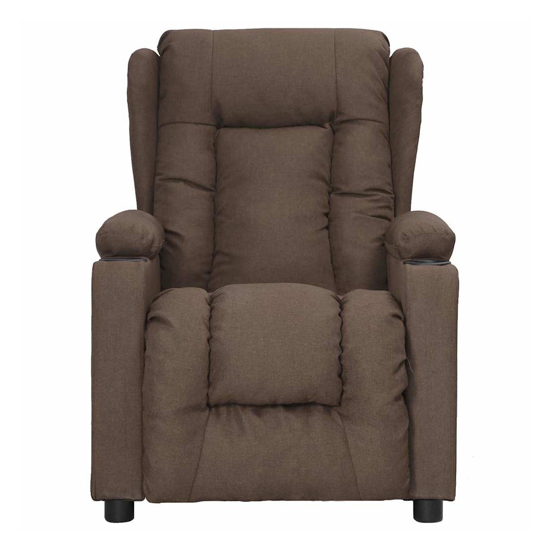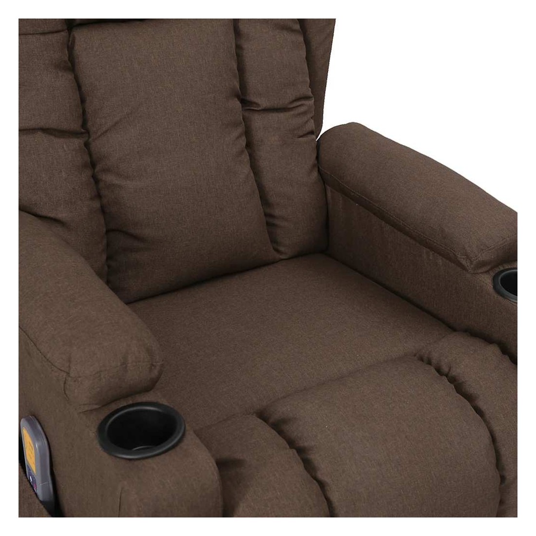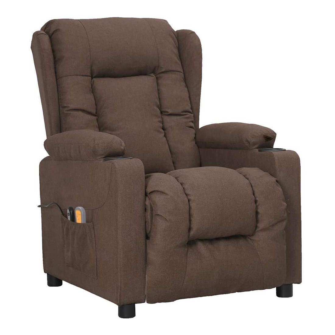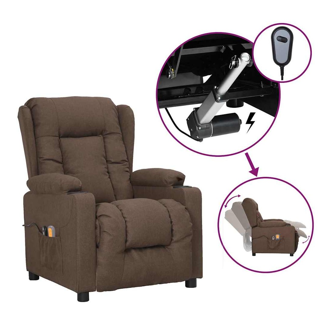 Asseyez-vous et détendez-vous dans ce fauteuil de massage électrique très confortable ! Fonction d'inclinaison électrique : le fauteuil inclinable est équipé d'un moteur électrique pour la fonction d'inclinaison. Il offre 3 positions d'inclinaison et vous pouvez facilement régler le dossier et le repose-pied à l'aide de la commande manuelle à 2 boutons incluse, en fonction de votre confort.Fonction de vibration : les 6 points de massage proposés te permettent de bénéficier d'un massage mieux ciblé. De plus, la commande manuelle incluse te permet de choisir différents programmes de massage. La fonction de massage est alimentée par le connecteur USB, mais la source d'alimentation USB 5 V certifiée n'est pas incluse.Expérience d'assise confortable : le siège, le dossier et les larges accoudoirs rembourrés épais recouverts de tissu procurent une sensation confortable et chaleureuse, vous permettant de vous sentir enveloppé lorsque vous êtes assis. Le tissu présente un aspect simple et épuré, et est respirant et durable.Cadre solide et stable : le cadre en bois et en métal offre une structure solide et une grande stabilité. Ce fauteuil inclinable est confortable et durable.