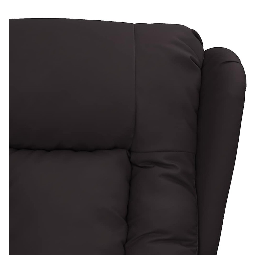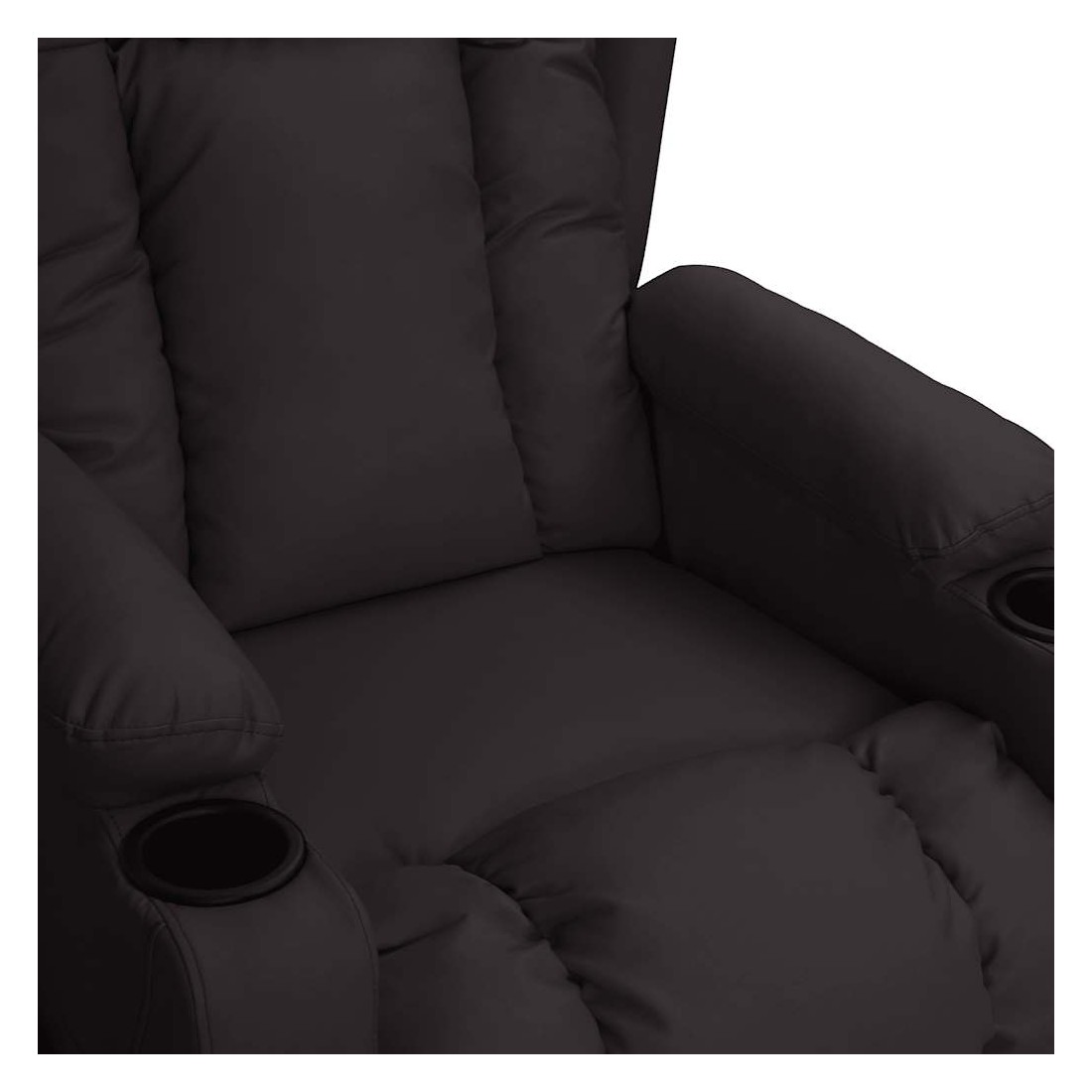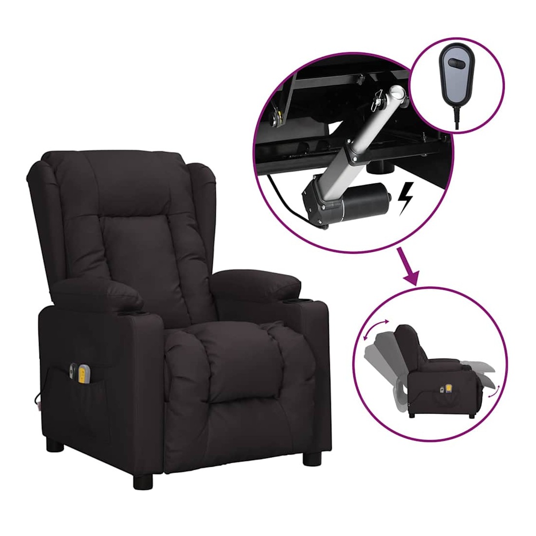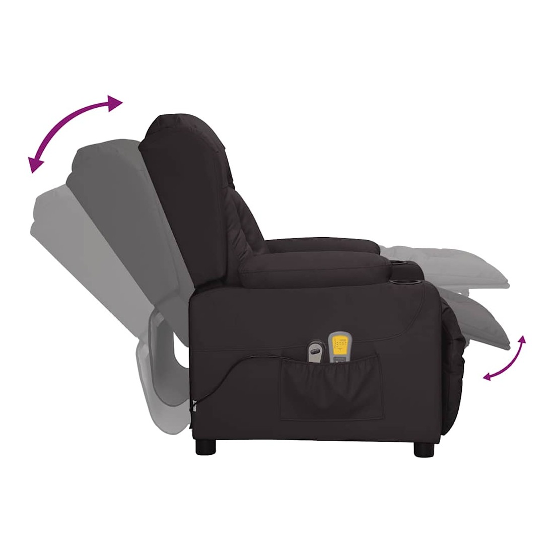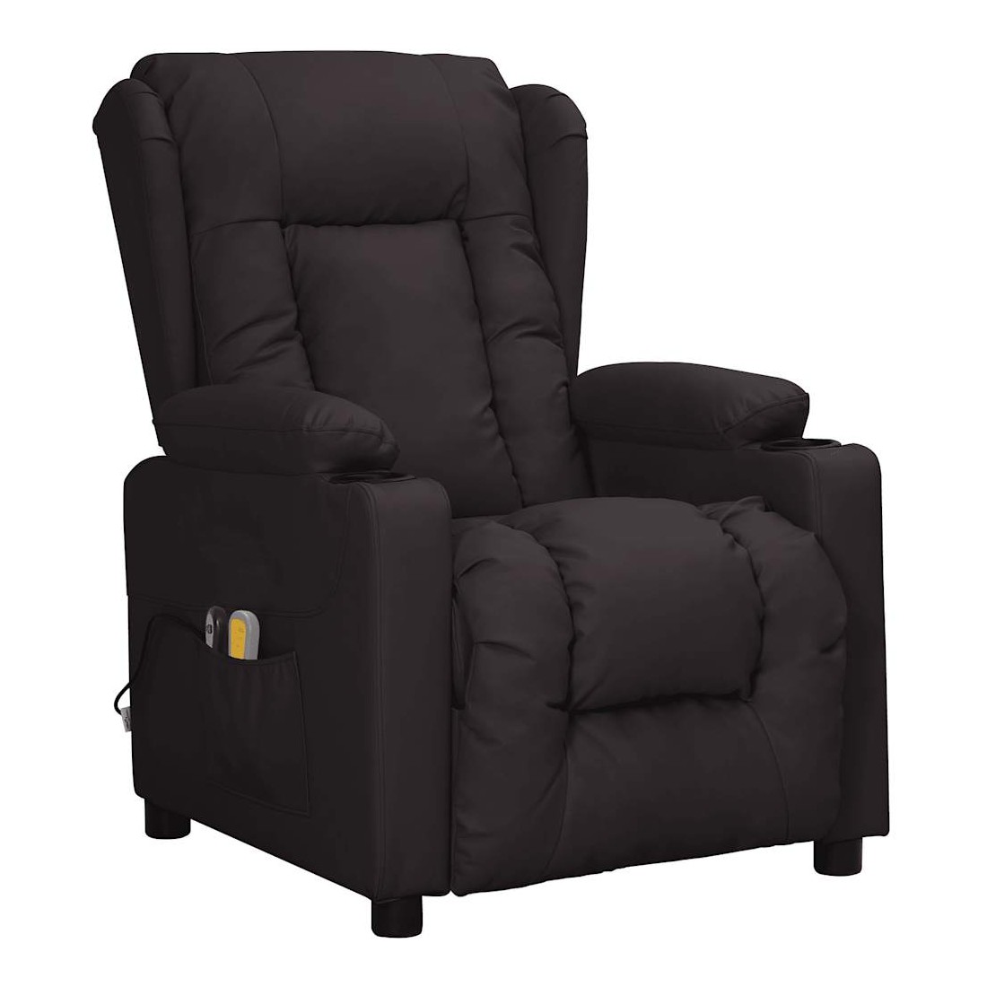 Asseyez-vous et détendez-vous dans ce fauteuil de massage électrique très confortable ! Fonction d'inclinaison électrique : le fauteuil inclinable est équipé d'un moteur électrique pour la fonction d'inclinaison. Il offre 3 positions d'inclinaison et vous pouvez facilement régler le dossier et le repose-pied à l'aide de la commande manuelle à 2 boutons incluse, en fonction de votre confort.Fonction de vibration : les 6 points de massage proposés te permettent de bénéficier d'un massage mieux ciblé. De plus, la commande manuelle incluse te permet de choisir différents programmes de massage. La fonction de massage est alimentée par le connecteur USB, mais la source d'alimentation USB 5 V certifiée n'est pas incluse.Expérience de siège confortable : le siège, le dossier et les larges accoudoirs rembourrés épais recouverts de similicuir procurent une sensation confortable et chaleureuse, vous faisant vous sentir enlacé lorsque vous êtes assis. Le simili cuir est un matériau très résistant. Il est résistant aux taches, ce qui le rend facile à nettoyer avec un chiffon humide. La surface lisse donne également un aspect luxueux et la beauté du cuir véritable.Cadre solide et stable : le cadre en bois et en métal offre une structure solide et une grande stabilité. Ce fauteuil inclinable est confortable et durable.