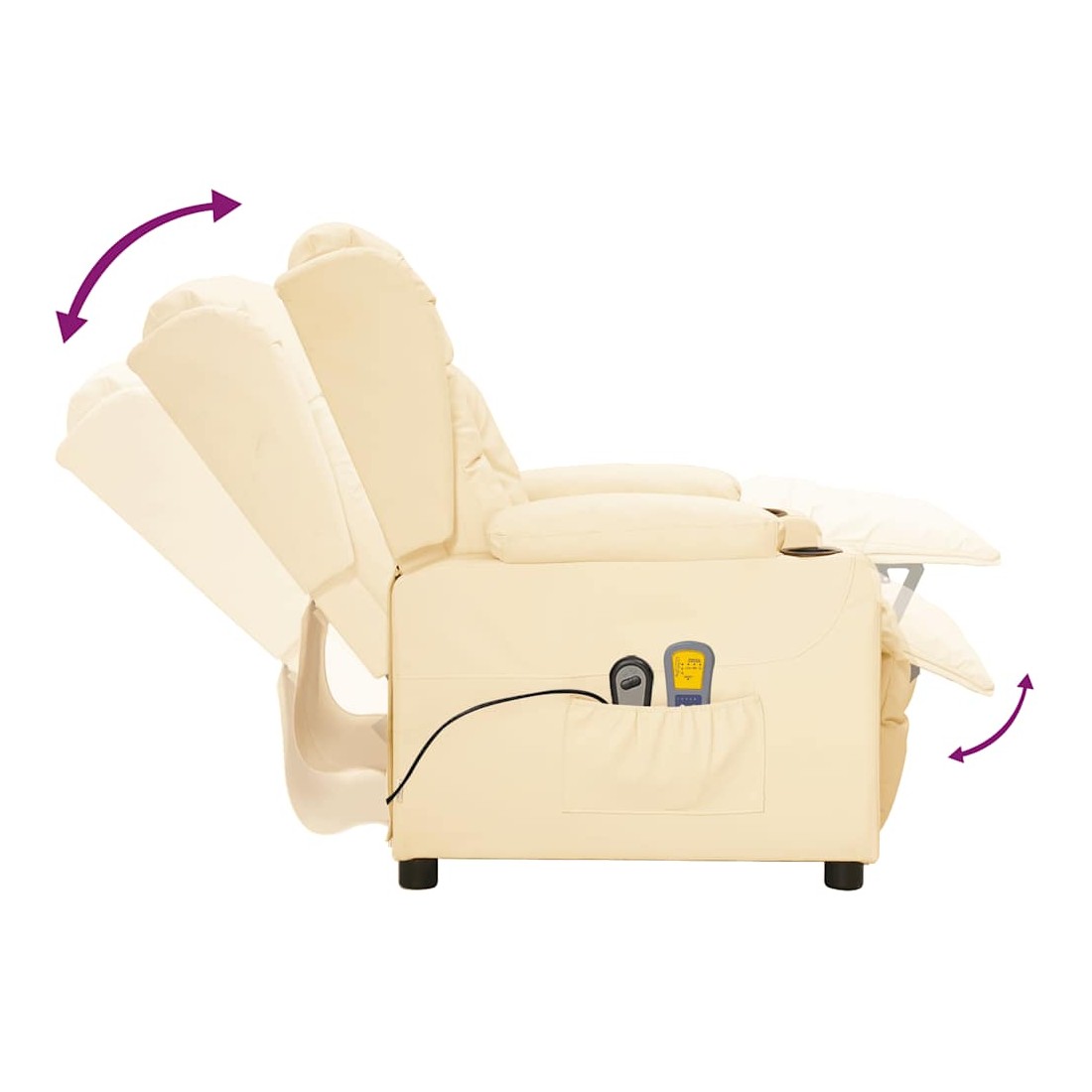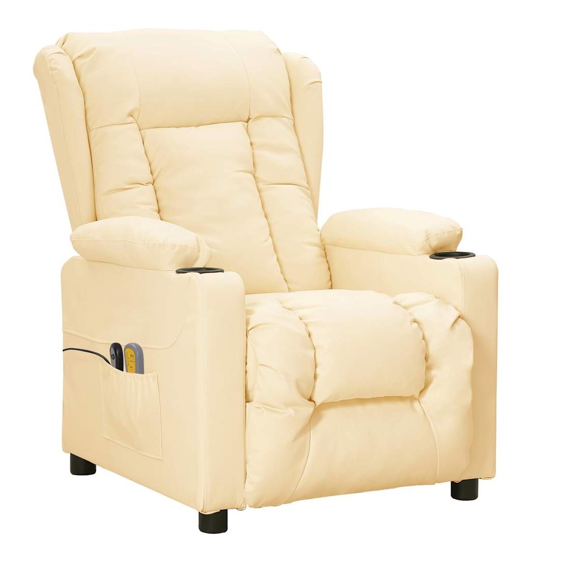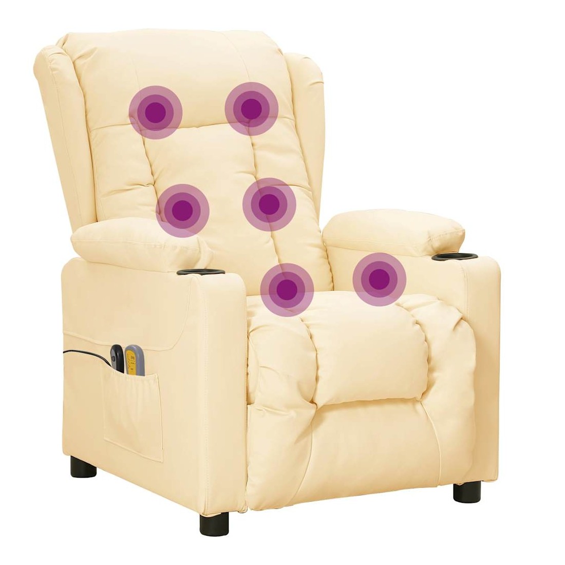 Asseyez-vous et détendez-vous dans ce fauteuil de massage électrique très confortable ! Fonction d'inclinaison électrique : le fauteuil inclinable est équipé d'un moteur électrique pour la fonction d'inclinaison. Il offre 3 positions d'inclinaison et vous pouvez facilement régler le dossier et le repose-pied à l'aide de la commande manuelle à 2 boutons incluse, en fonction de votre confort.Fonction de vibration : les 6 points de massage proposés te permettent de bénéficier d'un massage mieux ciblé. De plus, la commande manuelle incluse te permet de choisir différents programmes de massage. La fonction de massage est alimentée par le connecteur USB, mais la source d'alimentation USB 5 V certifiée n'est pas incluse.Expérience de siège confortable : le siège, le dossier et les larges accoudoirs rembourrés épais recouverts de similicuir procurent une sensation confortable et chaleureuse, vous faisant vous sentir enlacé lorsque vous êtes assis. Le simili cuir est un matériau très résistant. Il est résistant aux taches, ce qui le rend facile à nettoyer avec un chiffon humide. La surface lisse donne également un aspect luxueux et la beauté du cuir véritable.Cadre solide et stable : le cadre en bois et en métal offre une structure solide et une grande stabilité. Ce fauteuil inclinable est confortable et durable.
