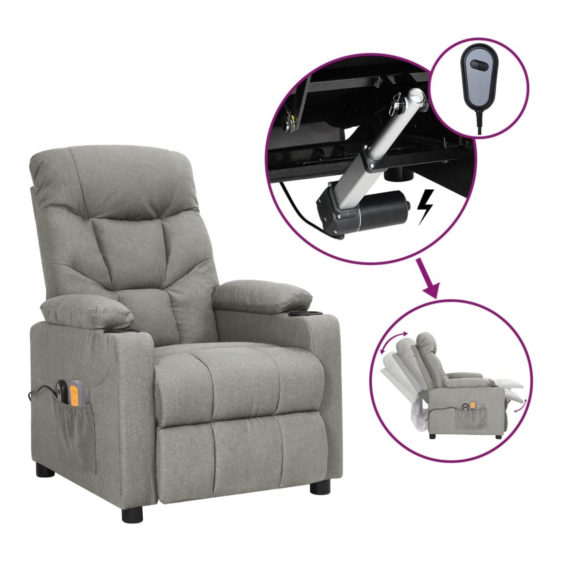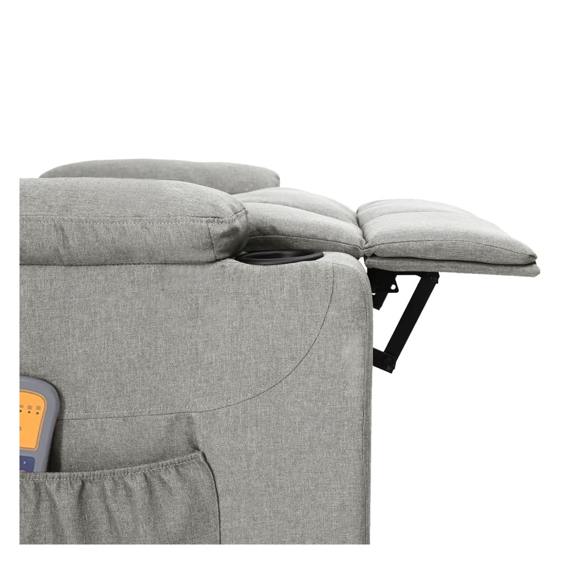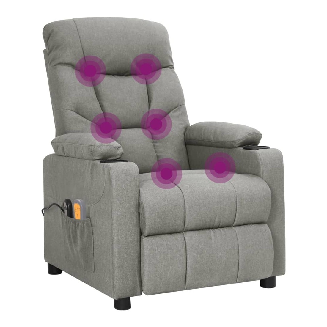 Asseyez-vous et détendez-vous dans ce fauteuil de massage électrique très confortable ! Fonction d'inclinaison électrique : le fauteuil inclinable est équipé d'un moteur électrique pour la fonction d'inclinaison. Il offre 3 positions d'inclinaison et vous pouvez facilement régler le dossier et le repose-pied à l'aide de la commande manuelle à 2 boutons incluse, en fonction de votre confort.Fonction de vibration : les 6 points de massage vous permettent de faire l'expérience d'un massage mieux ciblé. De plus, la télécommande incluse vous permet de choisir différents programmes de massage. La fonction de massage est alimentée par le connecteur USB, mais la source d'alimentation USB 5V certifiée n'est pas incluse.Expérience d'assise confortable : le siège, le dossier et les larges accoudoirs rembourrés épais recouverts de tissu procurent une sensation confortable et chaleureuse, vous permettant de vous sentir enveloppé lorsque vous êtes assis. Le tissu présente un aspect simple et épuré, et est respirant et durable.Cadre solide et stable : le cadre en bois et en métal offre une structure solide et une grande stabilité. Ce fauteuil inclinable est confortable et durable.