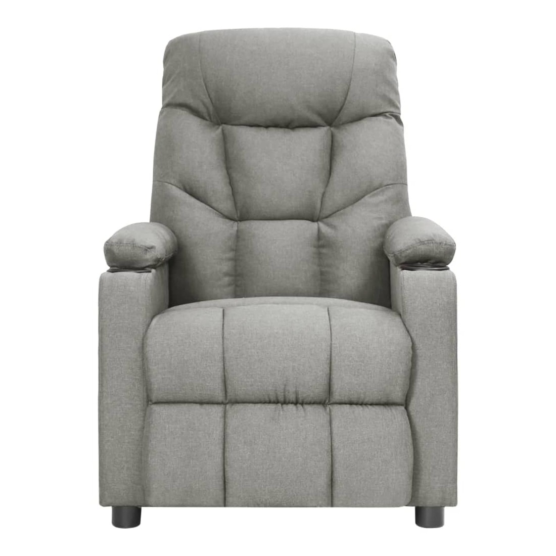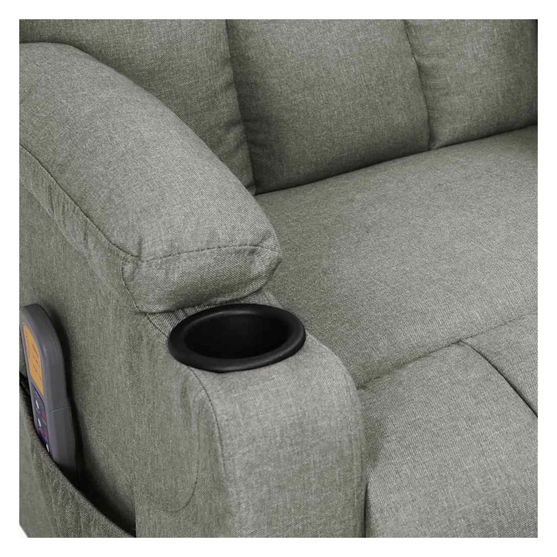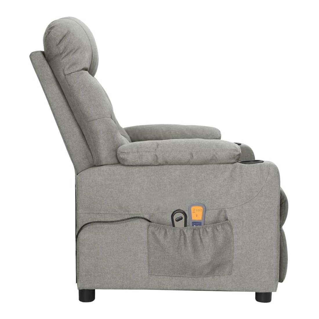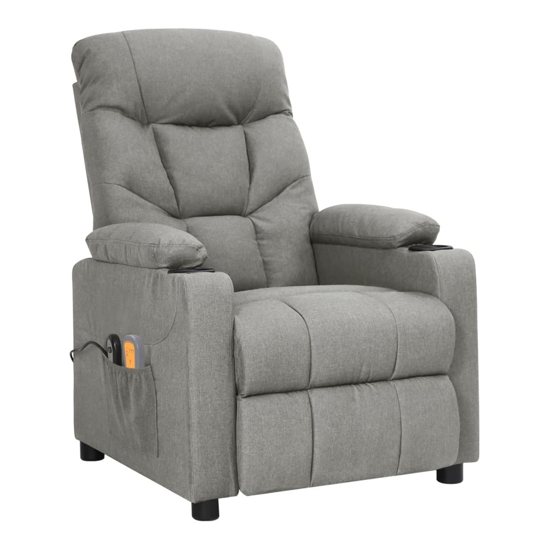Asseyez-vous et détendez-vous dans ce fauteuil de massage électrique très confortable ! Fonction d'inclinaison électrique : le fauteuil inclinable est équipé d'un moteur électrique pour la fonction d'inclinaison. Il offre 3 positions d'inclinaison et vous pouvez facilement régler le dossier et le repose-pied à l'aide de la commande manuelle à 2 boutons incluse, en fonction de votre confort.Fonction de vibration : les 6 points de massage vous permettent de faire l'expérience d'un massage mieux ciblé. De plus, la télécommande incluse vous permet de choisir différents programmes de massage. La fonction de massage est alimentée par le connecteur USB, mais la source d'alimentation USB 5V certifiée n'est pas incluse.Expérience d'assise confortable : le siège, le dossier et les larges accoudoirs rembourrés épais recouverts de tissu procurent une sensation confortable et chaleureuse, vous permettant de vous sentir enveloppé lorsque vous êtes assis. Le tissu présente un aspect simple et épuré, et est respirant et durable.Cadre solide et stable : le cadre en bois et en métal offre une structure solide et une grande stabilité. Ce fauteuil inclinable est confortable et durable.