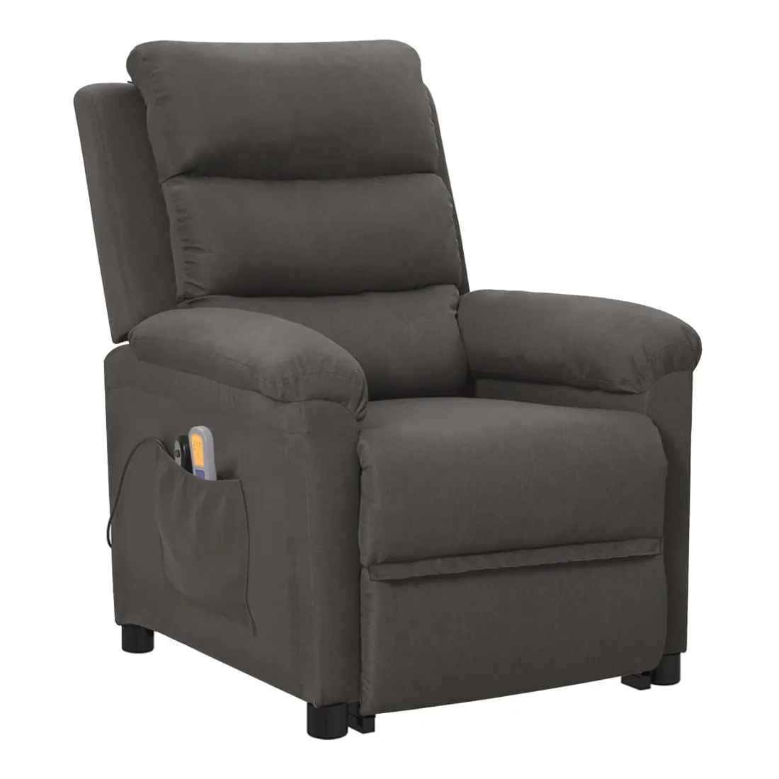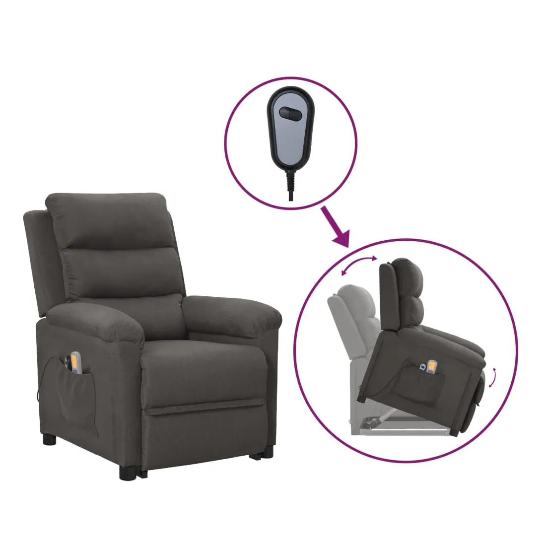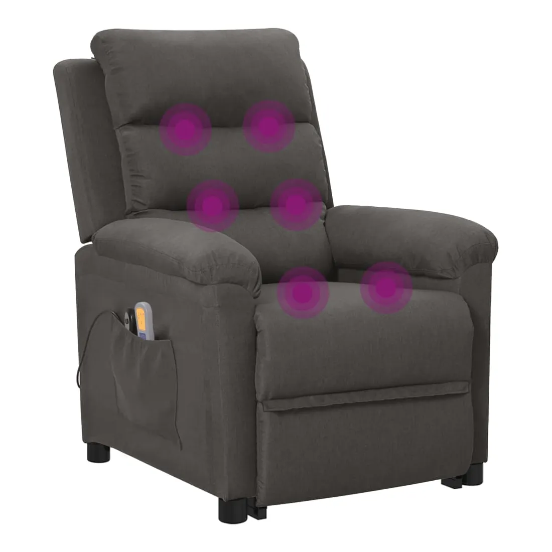Asseyez-vous et détendez-vous dans ce fauteuil de massage très confortable ! Fonction d'inclinaison manuelle : le fauteuil inclinable est spécialement conçu avec 3 positions d'inclinaison afin que vous puissiez régler manuellement le dossier et le repose-pieds selon votre confort.Fonction de levage électrique : ce fauteuil inclinable pour personnes âgées est équipé d'un moteur électrique pour la fonction de levage. Grâce à la fonction qui pousse toute la chaise vers le haut, vous pouvez facilement vous tenir debout sans stresser votre dos et vos genoux grâce à la commande manuelle à 2 boutons.Fonction de vibration : les 6 points de massage vous permettent de faire l'expérience d'un massage mieux ciblé. De plus, la télécommande incluse vous permet de choisir différents programmes de massage. La fonction de massage est alimentée par le connecteur USB, mais la source d'alimentation USB 5V certifiée n'est pas incluse.Expérience d'assise confortable : le siège, le dossier et les larges accoudoirs rembourrés épais recouverts de tissu procurent une sensation confortable et chaleureuse, vous permettant de vous sentir enveloppé lorsque vous êtes assis. Le tissu présente un aspect simple et épuré, et est respirant et durable.Cadre solide et stable : le cadre en bois et en métal offre une structure solide et une grande stabilité. Ce fauteuil inclinable est confortable et durable.