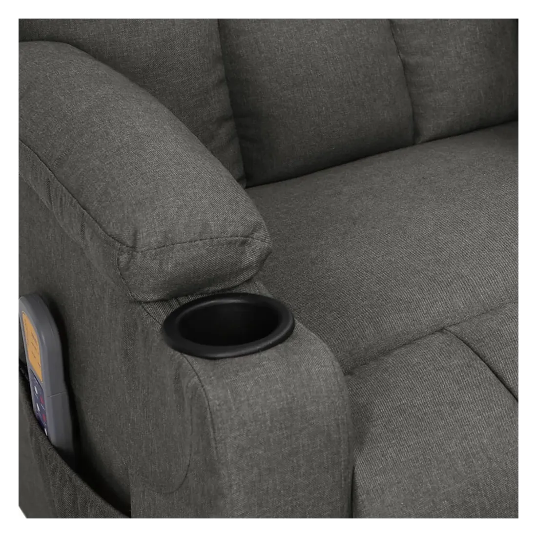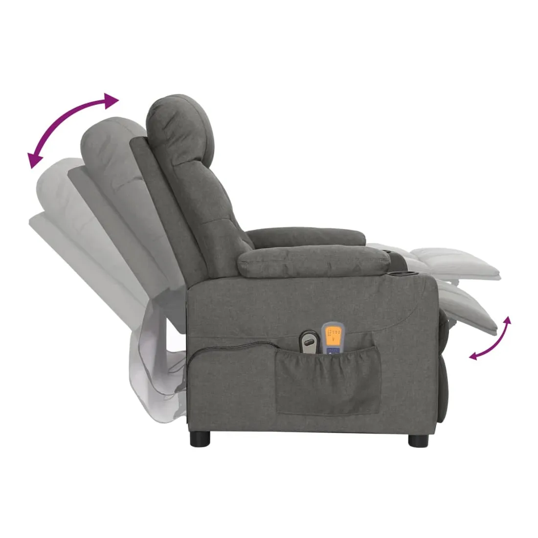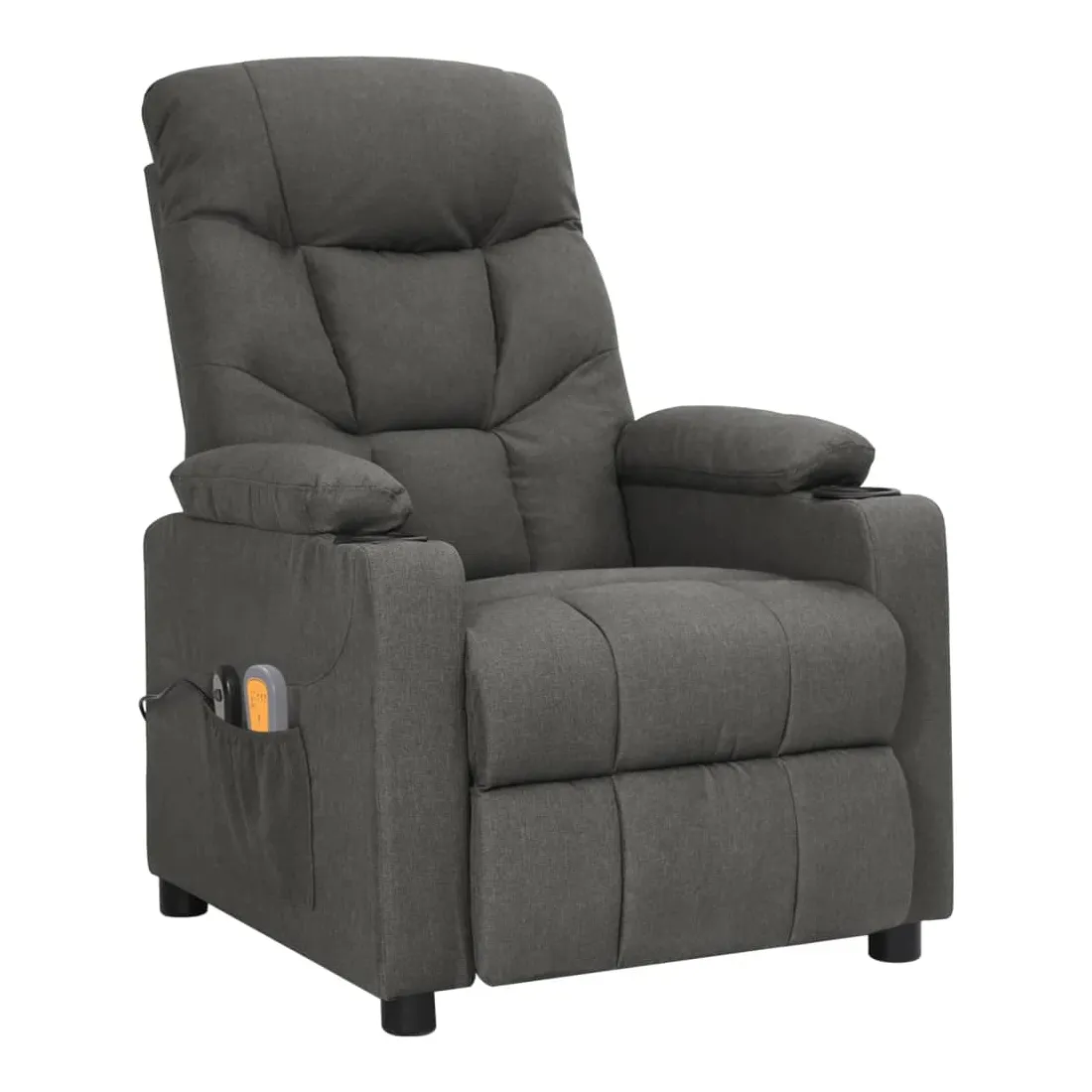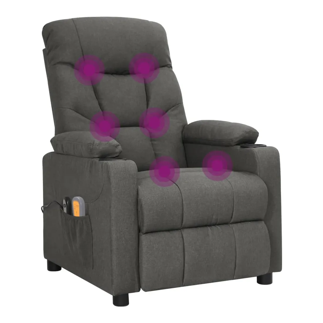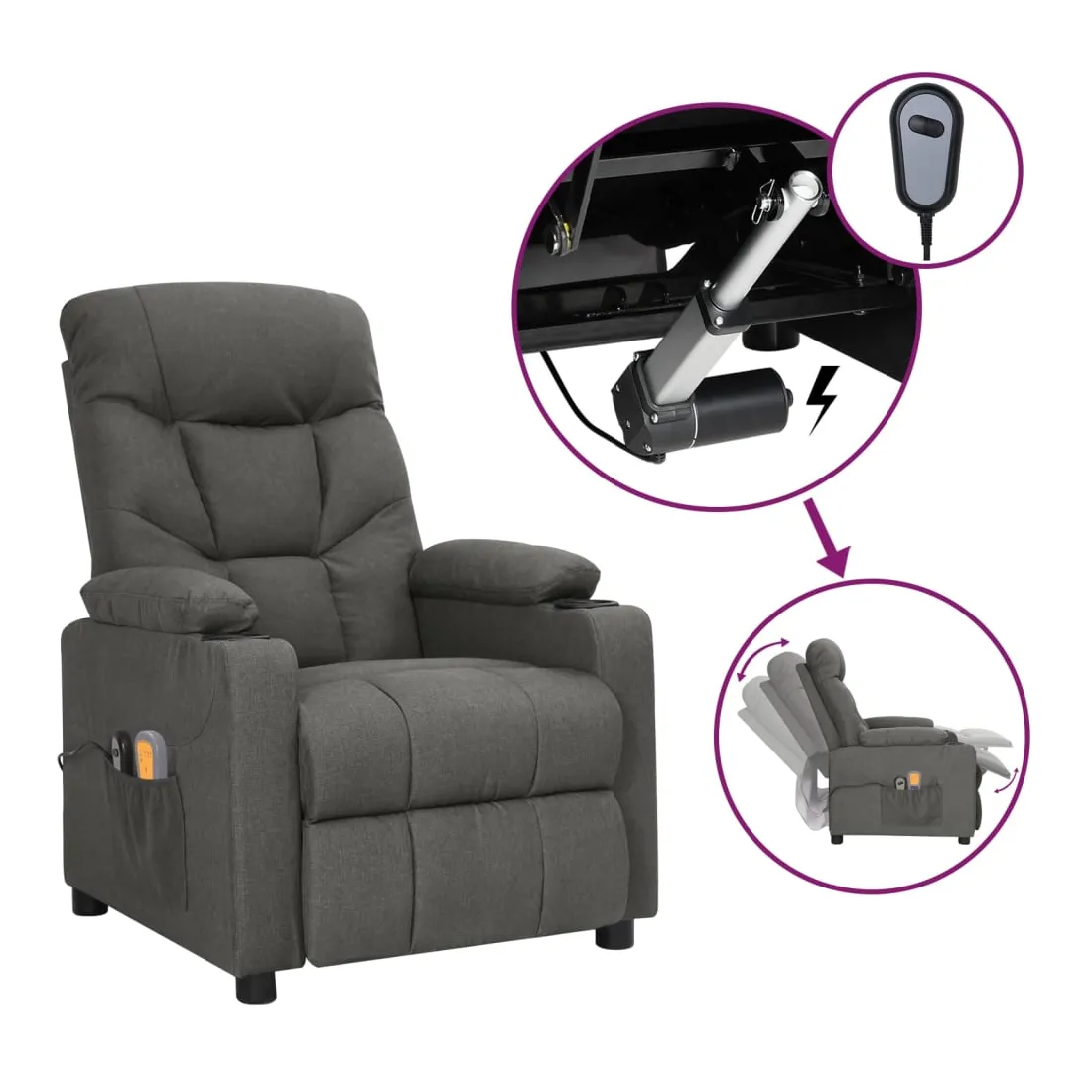 Asseyez-vous et détendez-vous dans ce fauteuil de massage électrique très confortable ! Fonction d'inclinaison électrique : le fauteuil inclinable est équipé d'un moteur électrique pour la fonction d'inclinaison. Il offre 3 positions d'inclinaison et vous pouvez facilement régler le dossier et le repose-pied à l'aide de la commande manuelle à 2 boutons incluse, en fonction de votre confort.Fonction de vibration : les 6 points de massage vous permettent de faire l'expérience d'un massage mieux ciblé. De plus, la télécommande incluse vous permet de choisir différents programmes de massage. La fonction de massage est alimentée par le connecteur USB, mais la source d'alimentation USB 5V certifiée n'est pas incluse.Expérience d'assise confortable : le siège, le dossier et les larges accoudoirs rembourrés épais recouverts de tissu procurent une sensation confortable et chaleureuse, vous permettant de vous sentir enveloppé lorsque vous êtes assis. Le tissu présente un aspect simple et épuré, et est respirant et durable.Cadre solide et stable : le cadre en bois et en métal offre une structure solide et une grande stabilité. Ce fauteuil inclinable est confortable et durable.