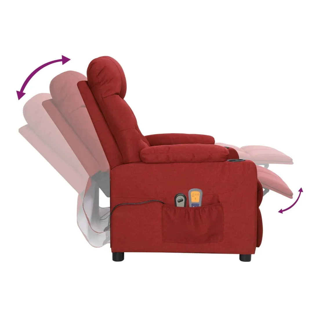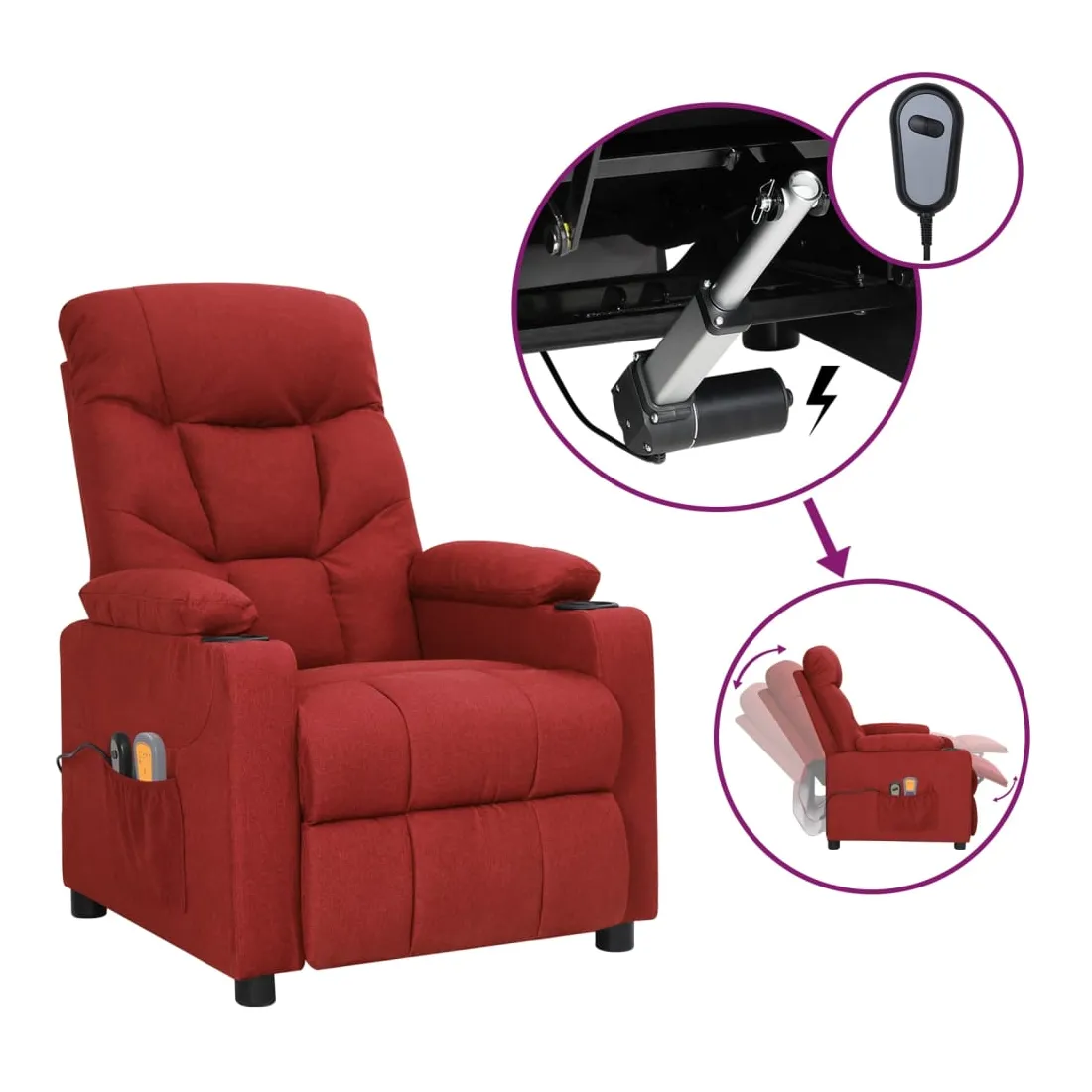 Asseyez-vous et détendez-vous dans ce fauteuil de massage électrique très confortable ! Fonction d'inclinaison électrique : le fauteuil inclinable est équipé d'un moteur électrique pour la fonction d'inclinaison. Il offre 3 positions d'inclinaison et vous pouvez facilement régler le dossier et le repose-pied à l'aide de la commande manuelle à 2 boutons incluse, en fonction de votre confort.Fonction de vibration : les 6 points de massage vous permettent de faire l'expérience d'un massage mieux ciblé. De plus, la télécommande incluse vous permet de choisir différents programmes de massage. La fonction de massage est alimentée par le connecteur USB, mais la source d'alimentation USB 5V certifiée n'est pas incluse.Expérience d'assise confortable : le siège, le dossier et les larges accoudoirs rembourrés épais recouverts de tissu procurent une sensation confortable et chaleureuse, vous permettant de vous sentir enveloppé lorsque vous êtes assis. Le tissu présente un aspect simple et épuré, et est respirant et durable.Cadre solide et stable : le cadre en bois et en métal offre une structure solide et une grande stabilité. Ce fauteuil inclinable est confortable et durable.