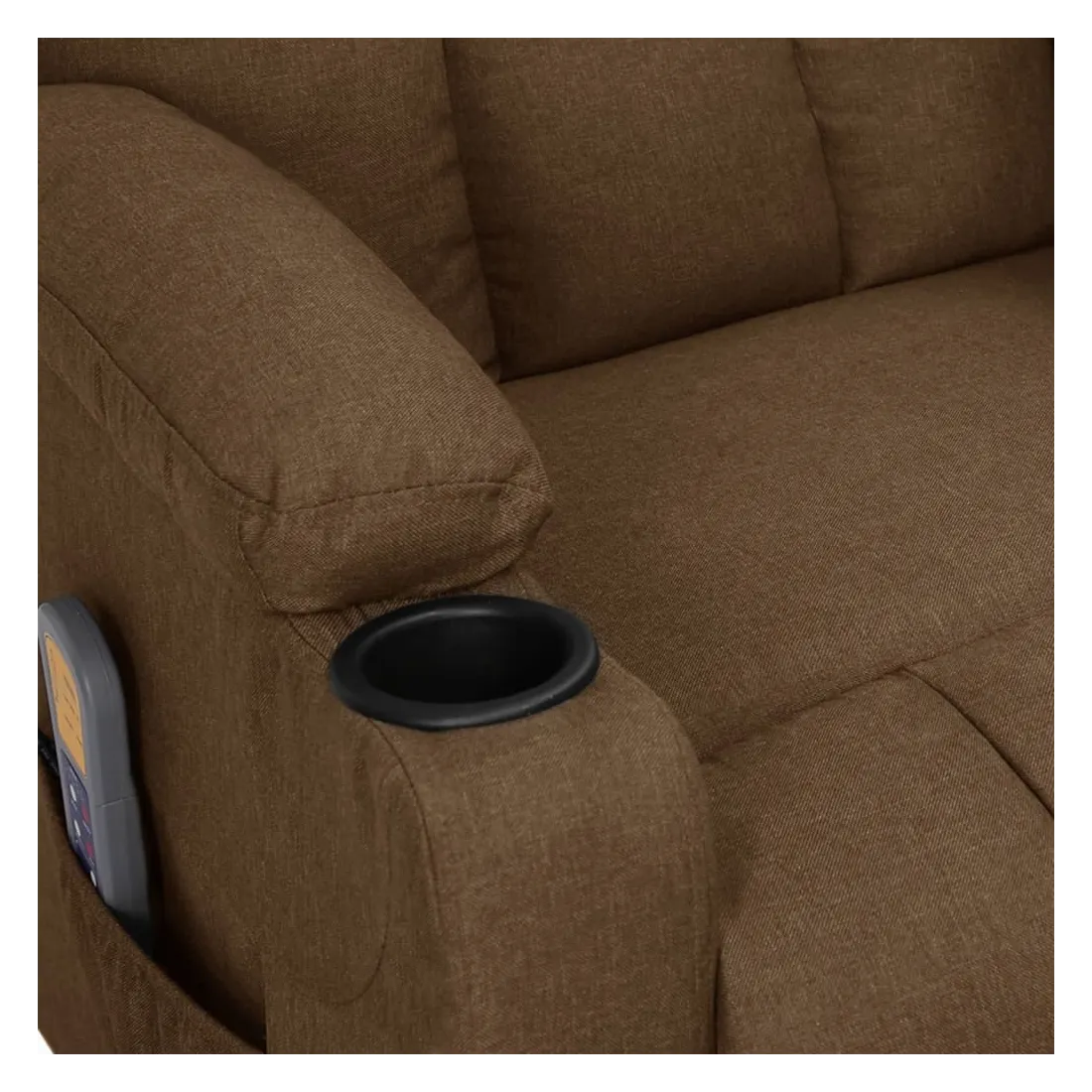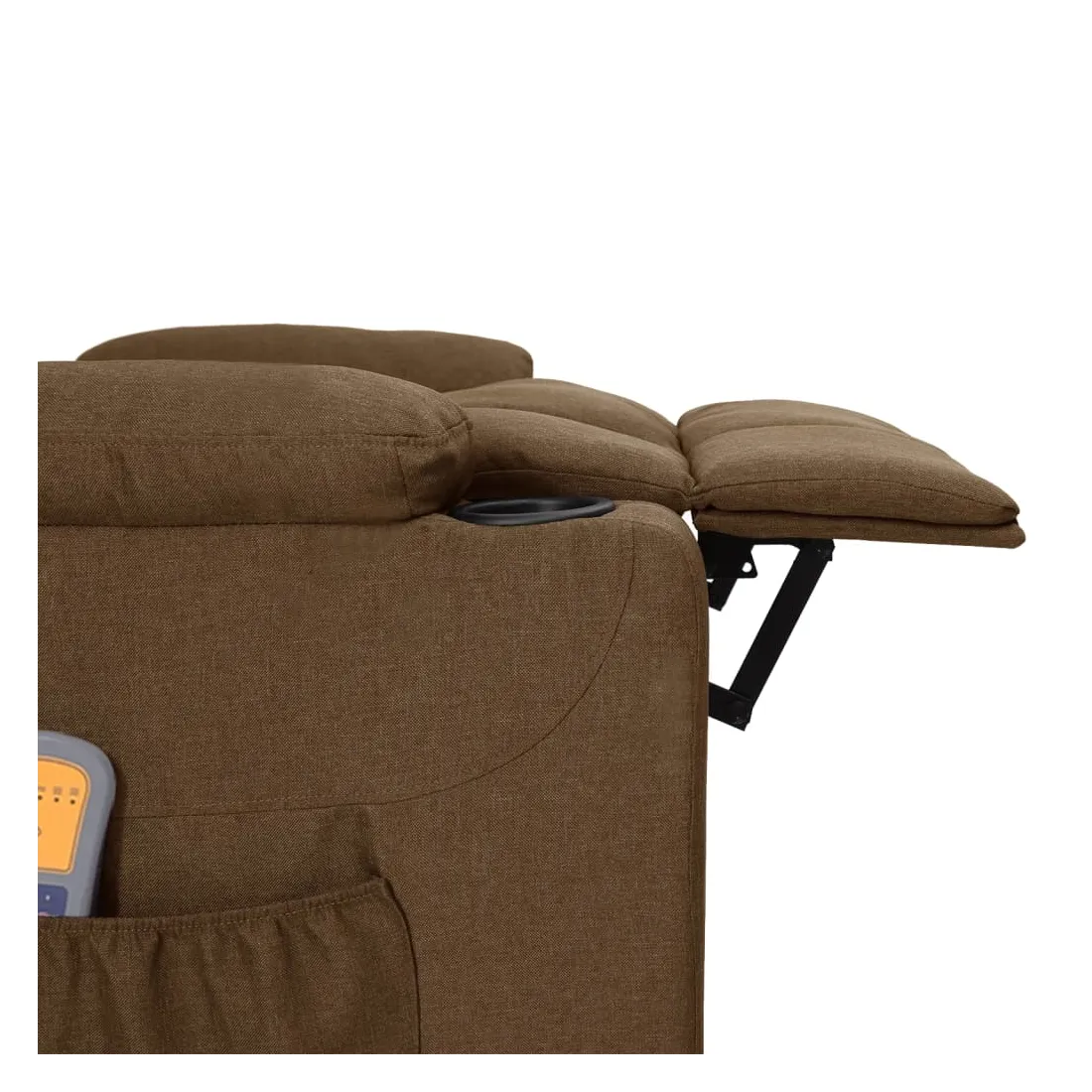 Asseyez-vous et détendez-vous dans ce fauteuil de massage électrique très confortable ! Fonction d'inclinaison électrique : le fauteuil inclinable est équipé d'un moteur électrique pour la fonction d'inclinaison. Il offre 3 positions d'inclinaison et vous pouvez facilement régler le dossier et le repose-pied à l'aide de la commande manuelle à 2 boutons incluse, en fonction de votre confort.Fonction de vibration : les 6 points de massage vous permettent de faire l'expérience d'un massage mieux ciblé. De plus, la télécommande incluse vous permet de choisir différents programmes de massage. La fonction de massage est alimentée par le connecteur USB, mais la source d'alimentation USB 5V certifiée n'est pas incluse.Expérience d'assise confortable : le siège, le dossier et les larges accoudoirs rembourrés épais recouverts de tissu procurent une sensation confortable et chaleureuse, vous permettant de vous sentir enveloppé lorsque vous êtes assis. Le tissu présente un aspect simple et épuré, et est respirant et durable.Cadre solide et stable : le cadre en bois et en métal offre une structure solide et une grande stabilité. Ce fauteuil inclinable est confortable et durable.