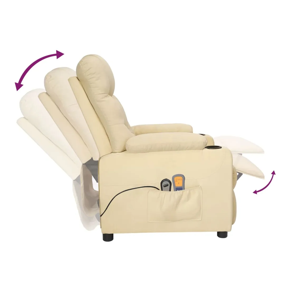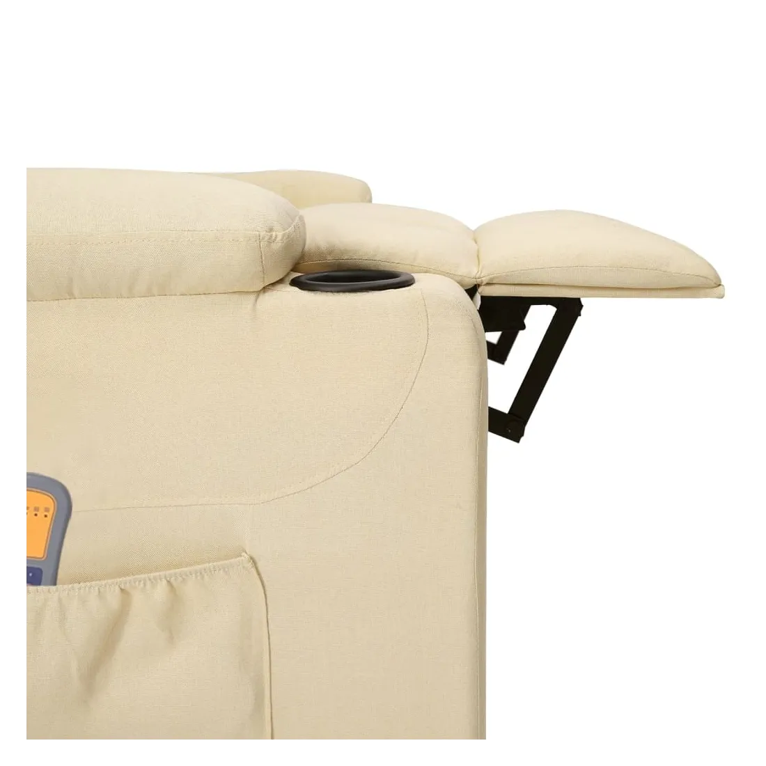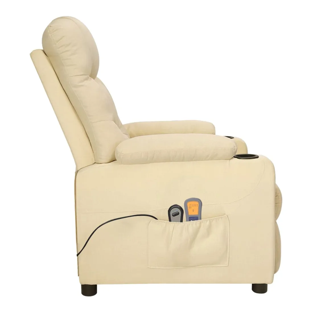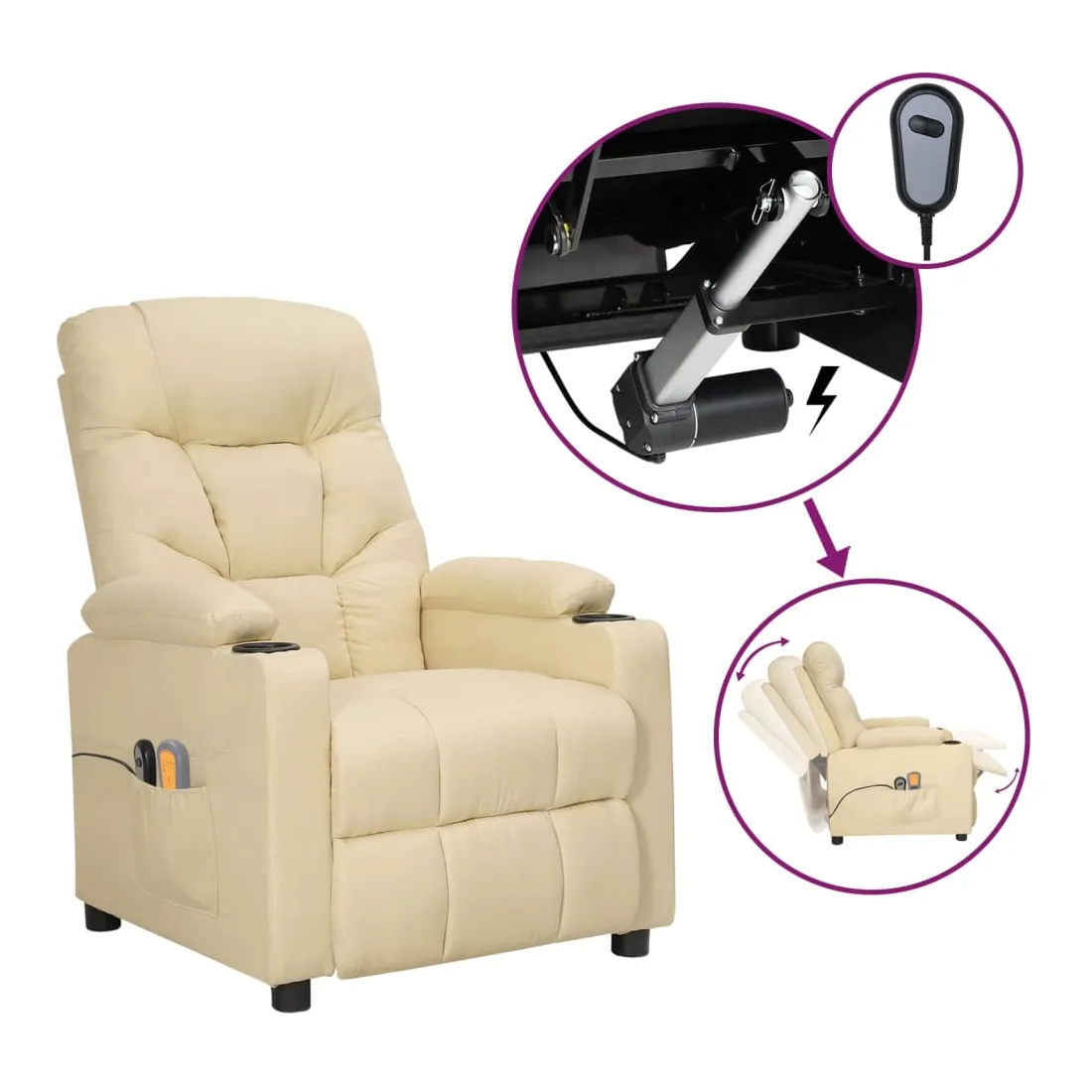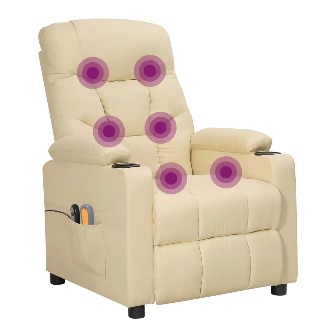 Asseyez-vous et détendez-vous dans ce fauteuil de massage électrique très confortable ! Fonction d'inclinaison électrique : le fauteuil inclinable est équipé d'un moteur électrique pour la fonction d'inclinaison. Il offre 3 positions d'inclinaison et vous pouvez facilement régler le dossier et le repose-pied à l'aide de la commande manuelle à 2 boutons incluse, en fonction de votre confort.Fonction de vibration : les 6 points de massage vous permettent de faire l'expérience d'un massage mieux ciblé. De plus, la télécommande incluse vous permet de choisir différents programmes de massage. La fonction de massage est alimentée par le connecteur USB, mais la source d'alimentation USB 5V certifiée n'est pas incluse.Expérience d'assise confortable : le siège, le dossier et les larges accoudoirs rembourrés épais recouverts de tissu procurent une sensation confortable et chaleureuse, vous permettant de vous sentir enveloppé lorsque vous êtes assis. Le tissu présente un aspect simple et épuré, et est respirant et durable.Cadre solide et stable : le cadre en bois et en métal offre une structure solide et une grande stabilité. Ce fauteuil inclinable est confortable et durable.