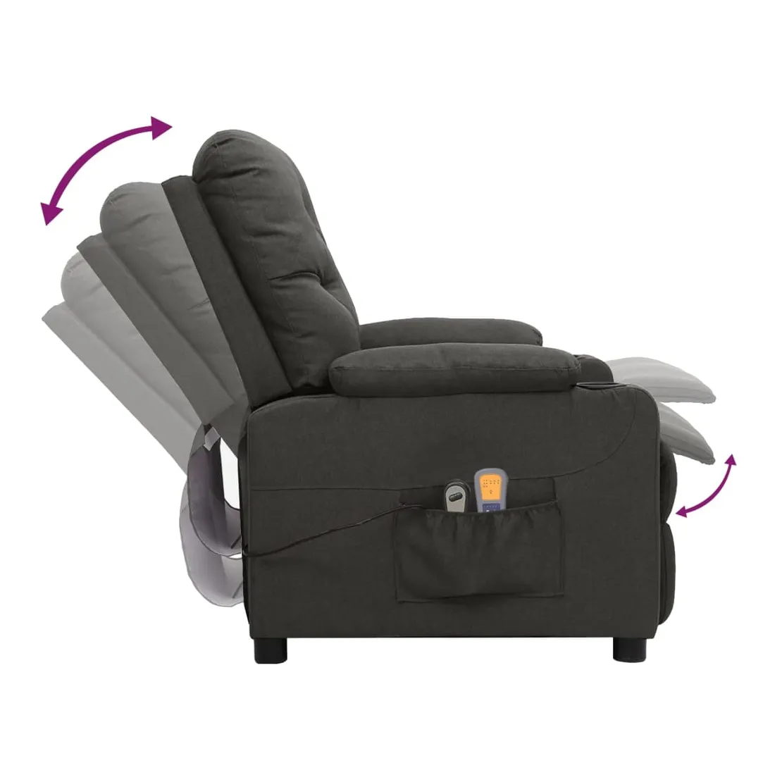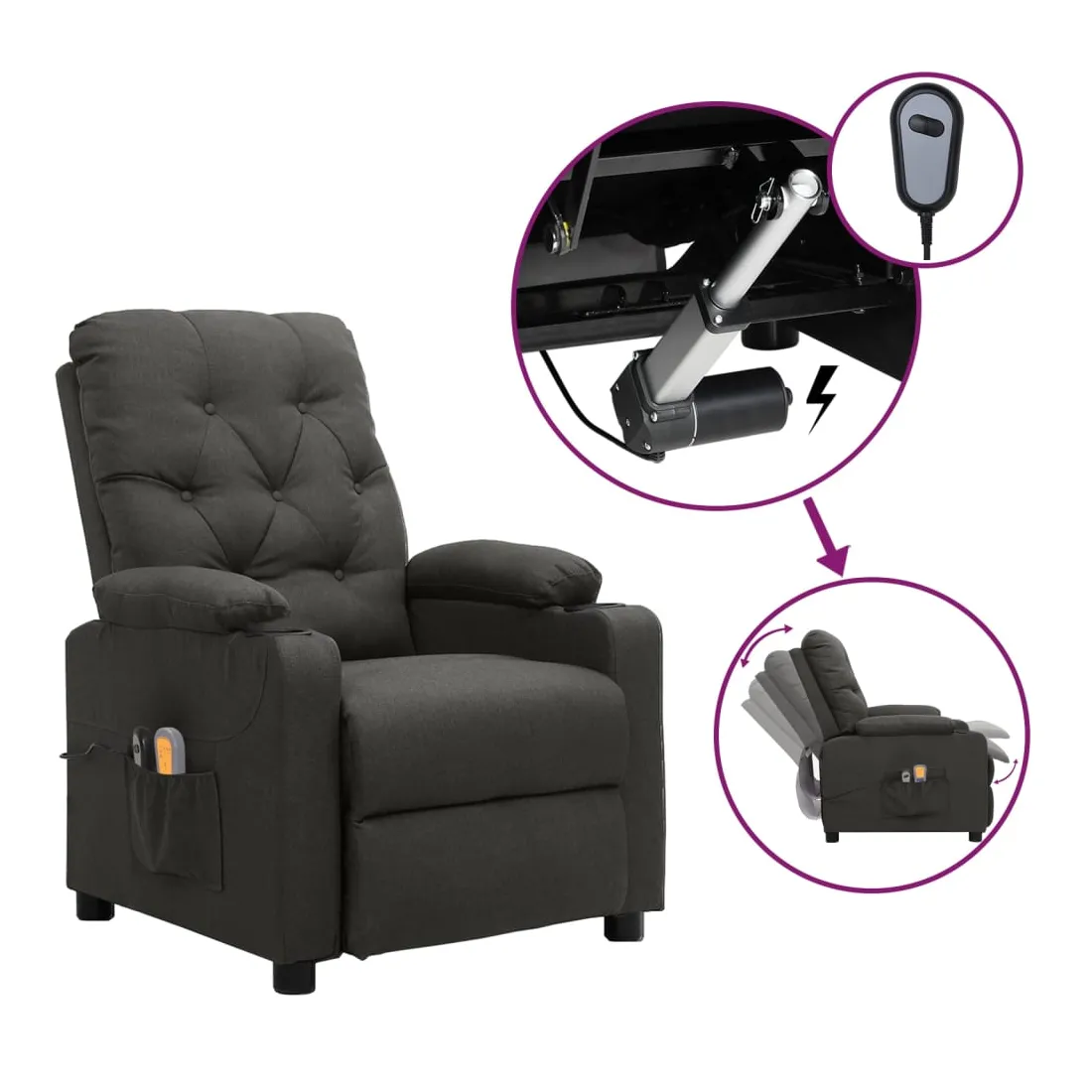 Asseyez-vous et détendez-vous dans ce fauteuil de massage électrique très confortable ! Fonction d'inclinaison électrique : le fauteuil inclinable est équipé d'un moteur électrique pour la fonction d'inclinaison. Il offre 3 positions d'inclinaison et vous pouvez facilement régler le dossier et le repose-pied à l'aide de la commande manuelle à 2 boutons incluse, en fonction de votre confort.Fonction de vibration : les 6 points de massage vous permettent de faire l'expérience d'un massage mieux ciblé. De plus, la télécommande incluse vous permet de choisir différents programmes de massage. La fonction de massage est alimentée par le connecteur USB, mais la source d'alimentation USB 5V certifiée n'est pas incluse.Expérience d'assise confortable : le siège, le dossier et les larges accoudoirs rembourrés épais recouverts de tissu procurent une sensation confortable et chaleureuse, vous permettant de vous sentir enveloppé lorsque vous êtes assis. Le tissu présente un aspect simple et épuré, et est respirant et durable.Cadre solide et stable : le cadre en bois et en métal offre une structure solide et une grande stabilité. Ce fauteuil inclinable est confortable et durable.